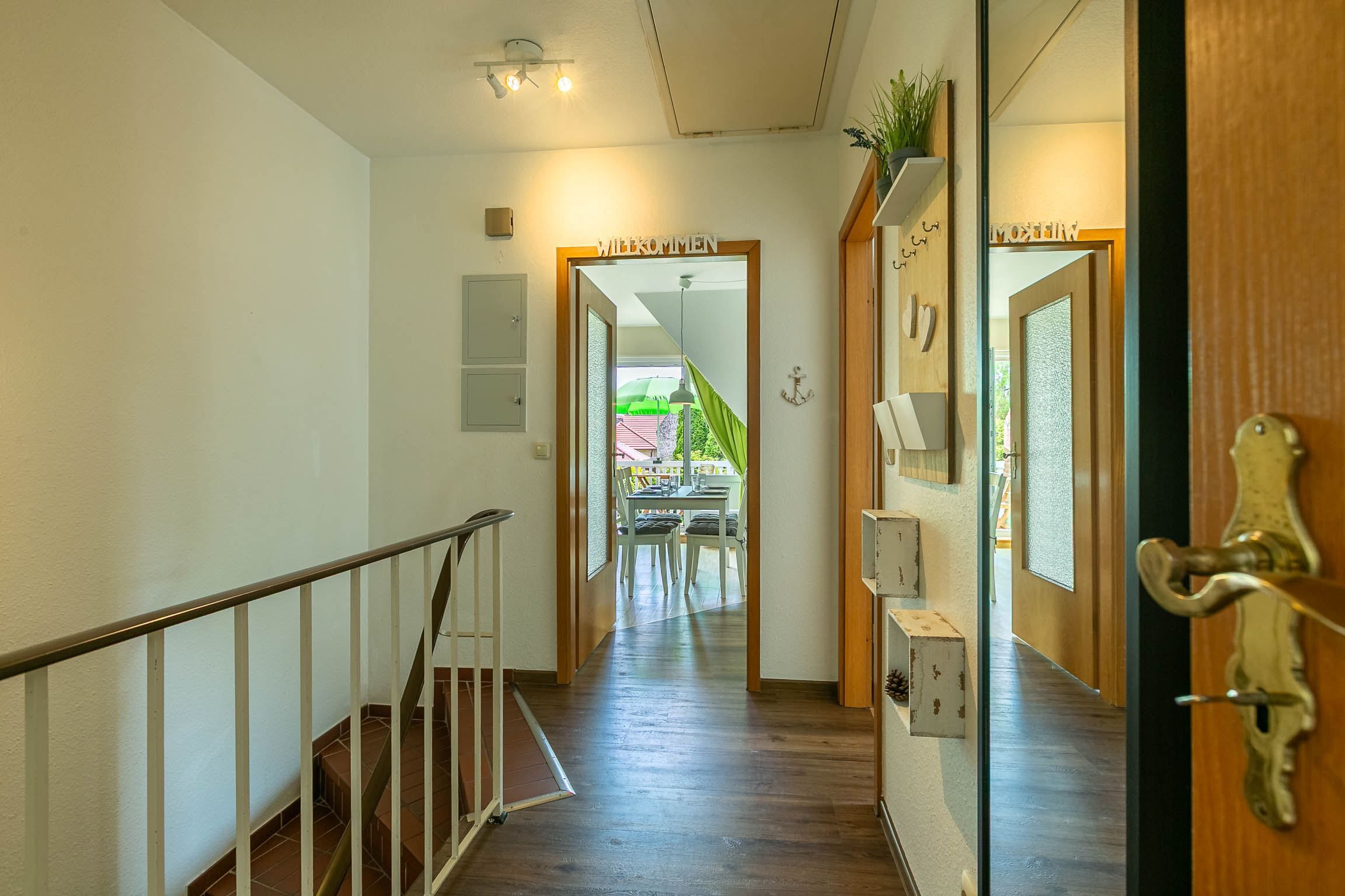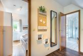Flur mit Garderobe und Schuhablage im Eingangsbereich im Erdgeschoss.