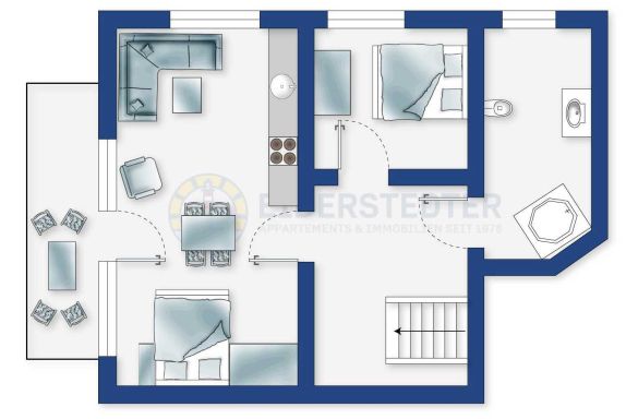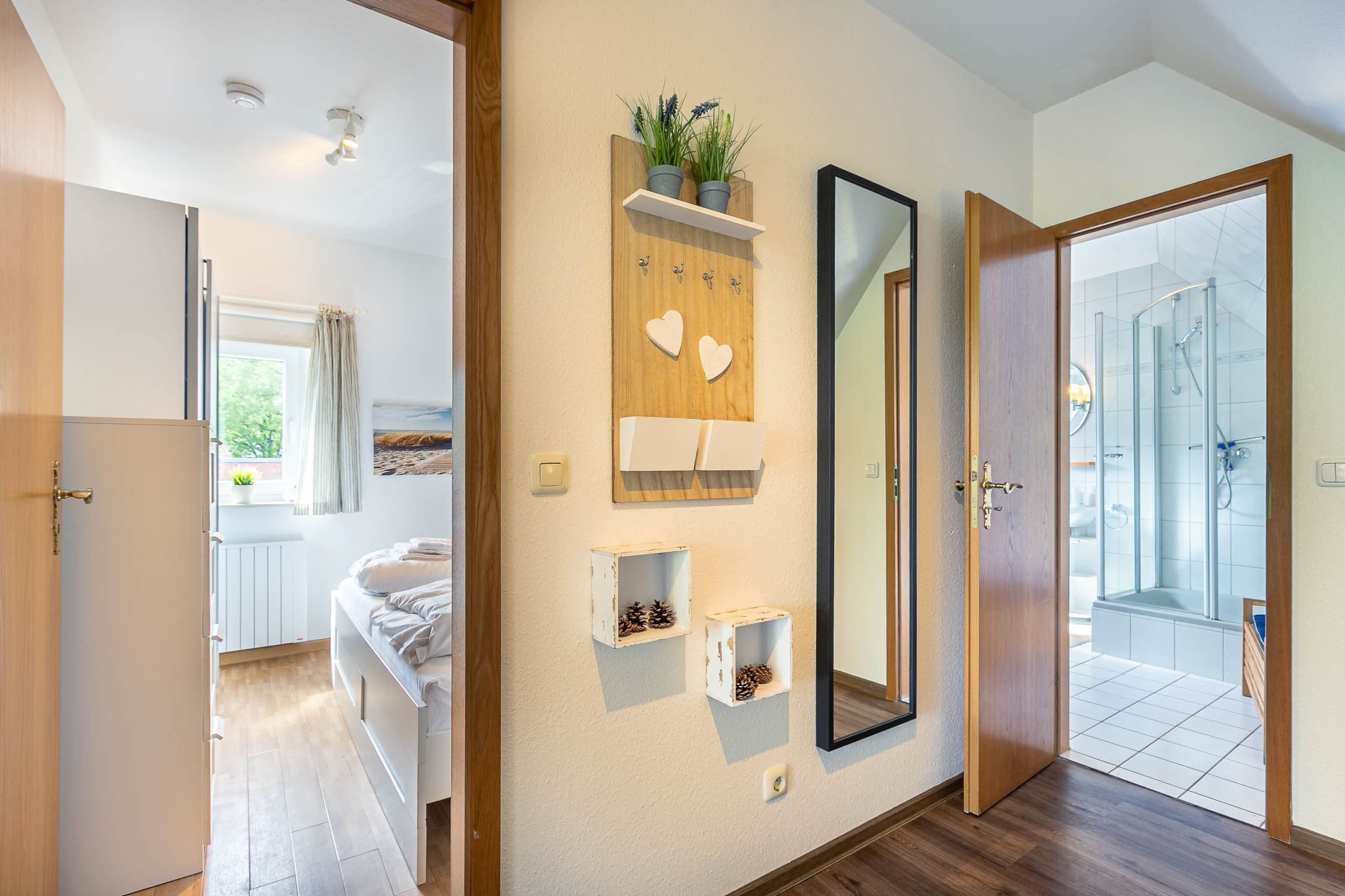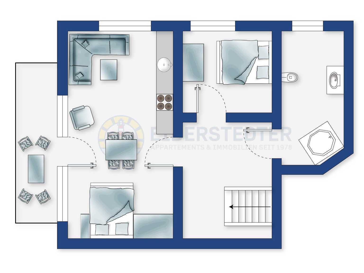 Geschmackvoll eingerichtete 2-Zimmer-Ferienwohnung im Haus Wanlik Hüs mit ca. 50 qm auf 2 Ebenen (EG, OG) für bis zu 4 Personen. In zentraler Lage im Ortsteil Dorf in Sankt Peter-Ording. Die Wohnung befindet sich auf der straßenabgewandten Seite des Anbaus an das historische Wanlik Hüs, dem ältesten Reetdachhaus weit und breit auf Eiderstedt, in welchem sich heute ein exquisites Restaurant befindet. Alle Geschäfte der Dorfstraße befinden sich in direkter Nachbarschaft.