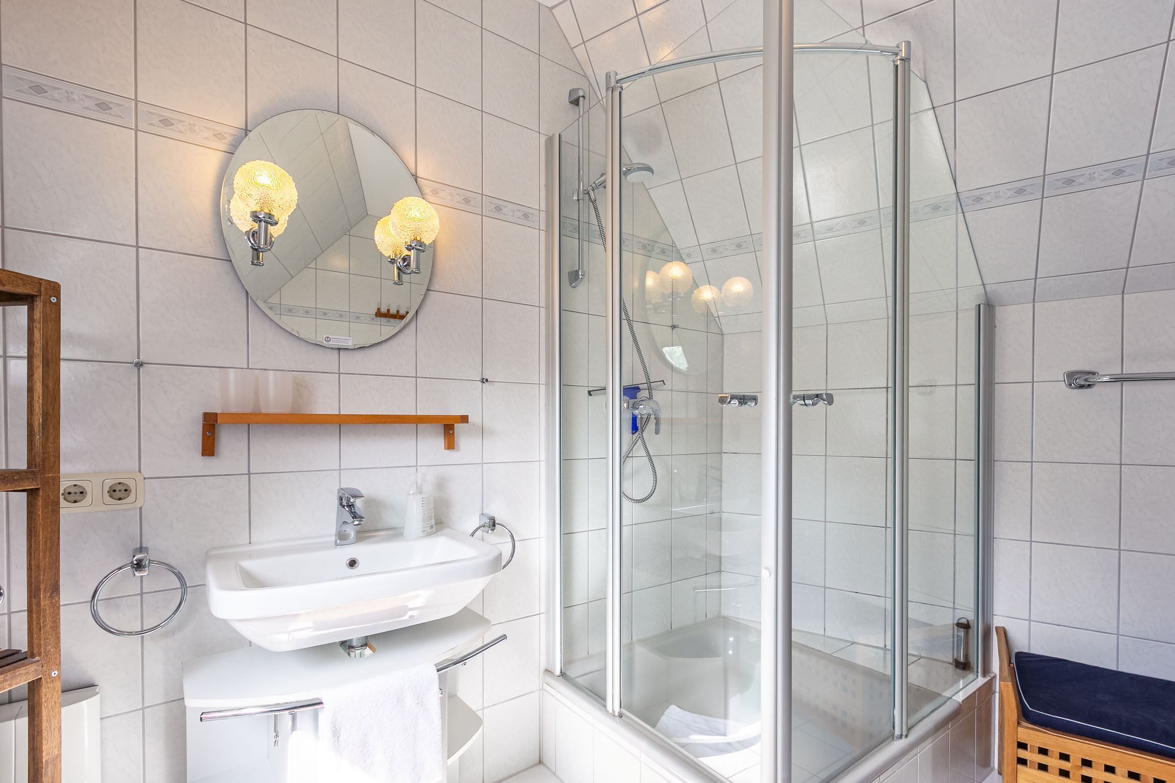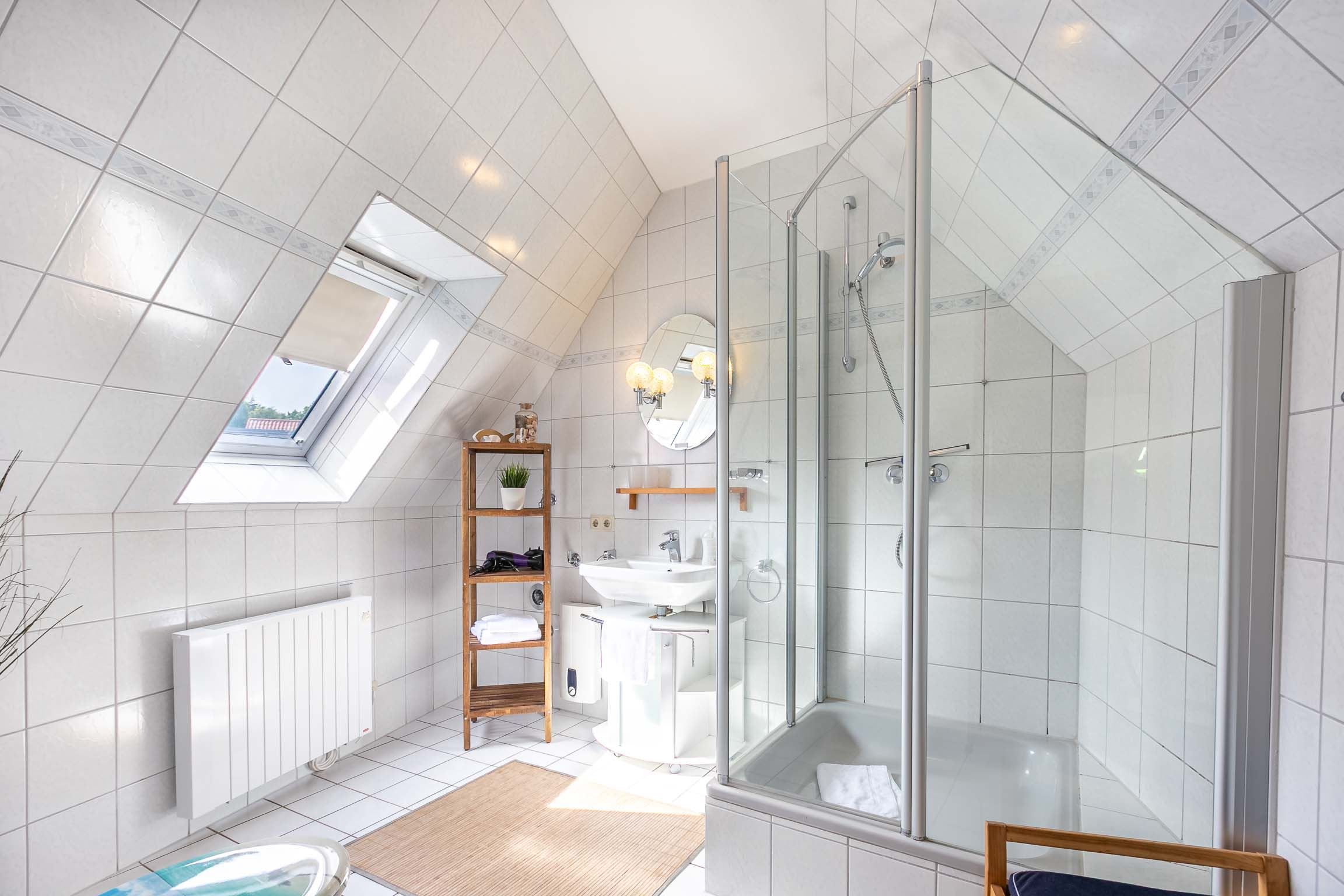 Badezimmer (Duschbad) mit Dusche, WC, Tageslicht und Föhn.