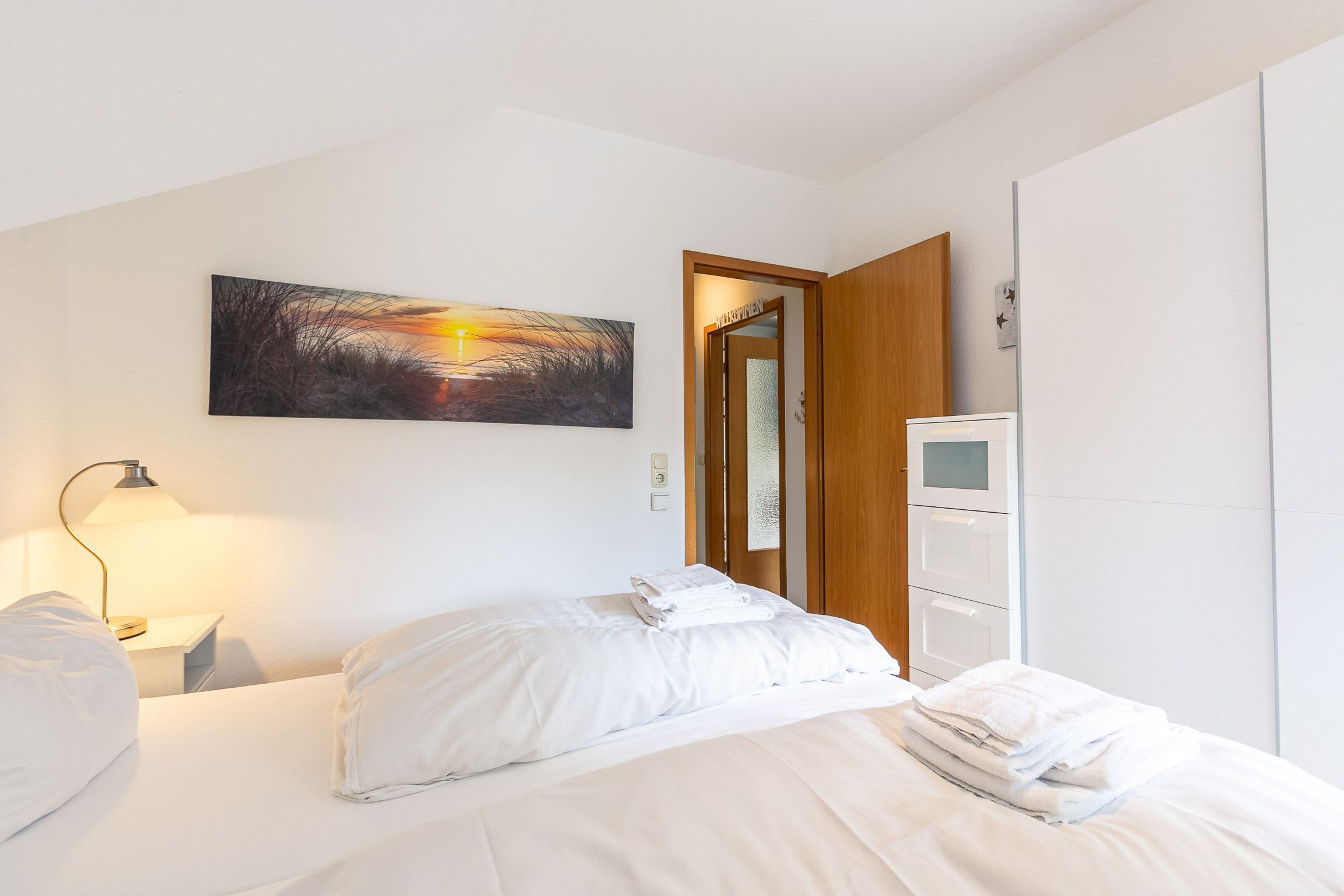 Schlafzimmer mit Doppelbett (2x 90x200cm), Kleiderschrank und Kommode.