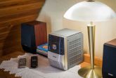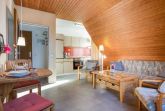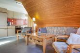 Wohnzimmer mit Sofa (3er), 2 Sesseln, TV (Kabel), Stereo-Kompaktanlage und Wandtisch mit 2 Stühlen. Halboffene Küche mit Backofen und Kühlschrank mit Gefrierfach.