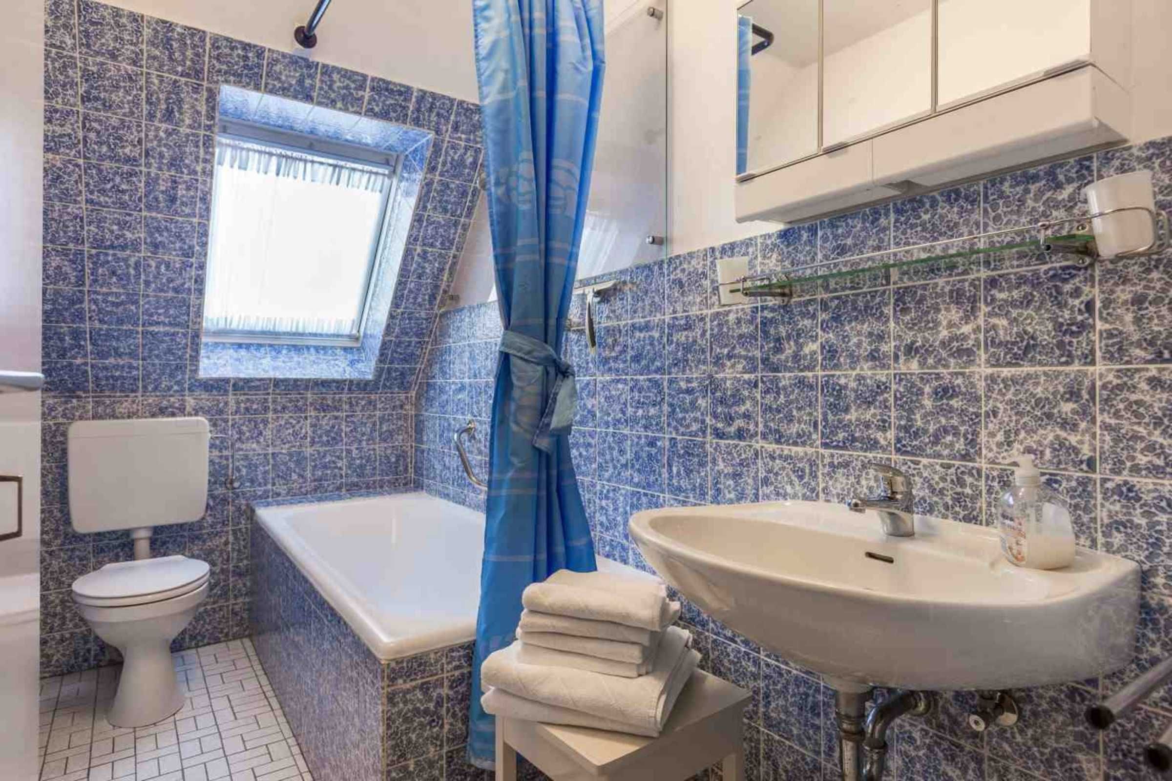 Badezimmer (Wannenbad) mit Badewanne mit Dusch-Handstück, WC, Tageslicht und Föhn.