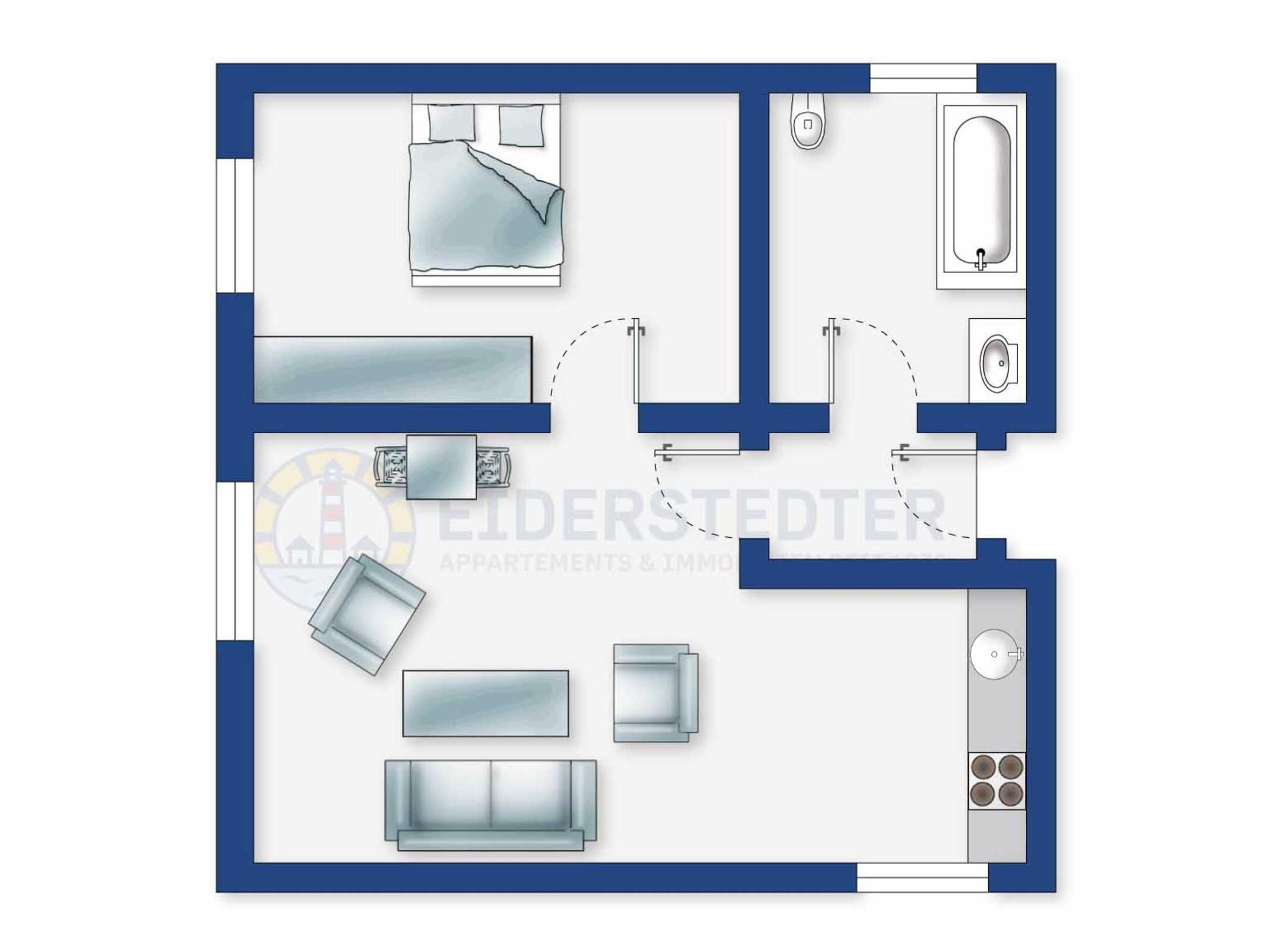 Gemütliche 2-Zimmer-Ferienwohnung im Haus Hildegard mit ca. 35 qm auf 1 Ebene (OG) für bis zu 2 Personen. In ruhiger Lage im Ortsteil Bad in St. Peter-Ording.