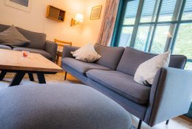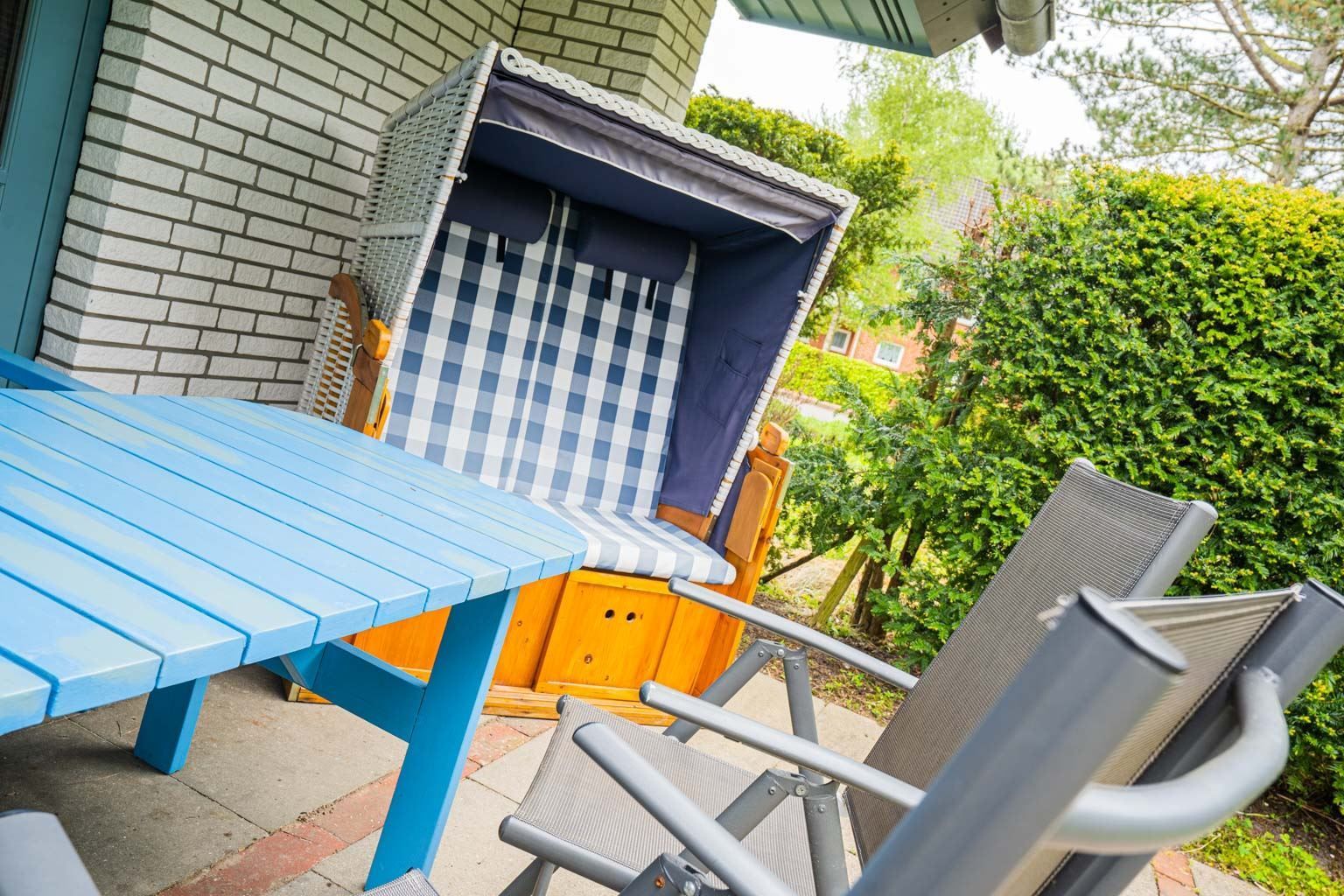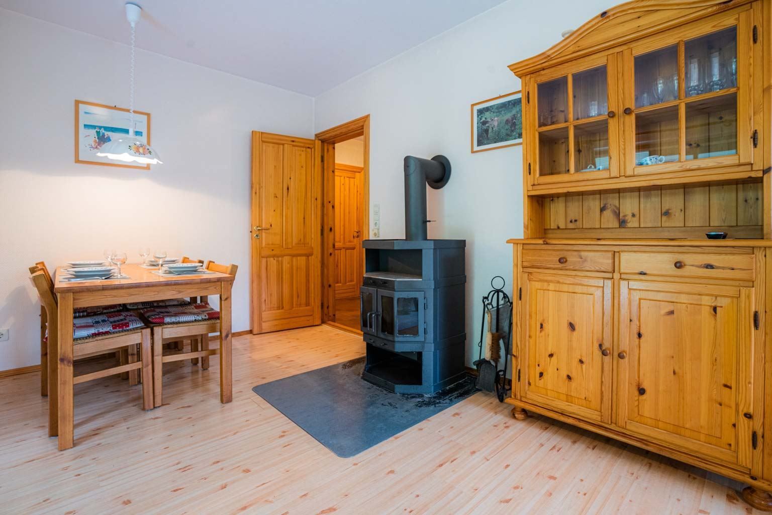 Wohnzimmer mit zwei Sofas (3er und 2er) und einem Sessel, TV (Kabel), Radio mit CD-Player, behaglichem Kaminofen und Esstisch mit 4 Stühlen. Direkter Zugang zur möblierten und windgeschützten Gartenterrasse nach Süden mit Strandkorb.