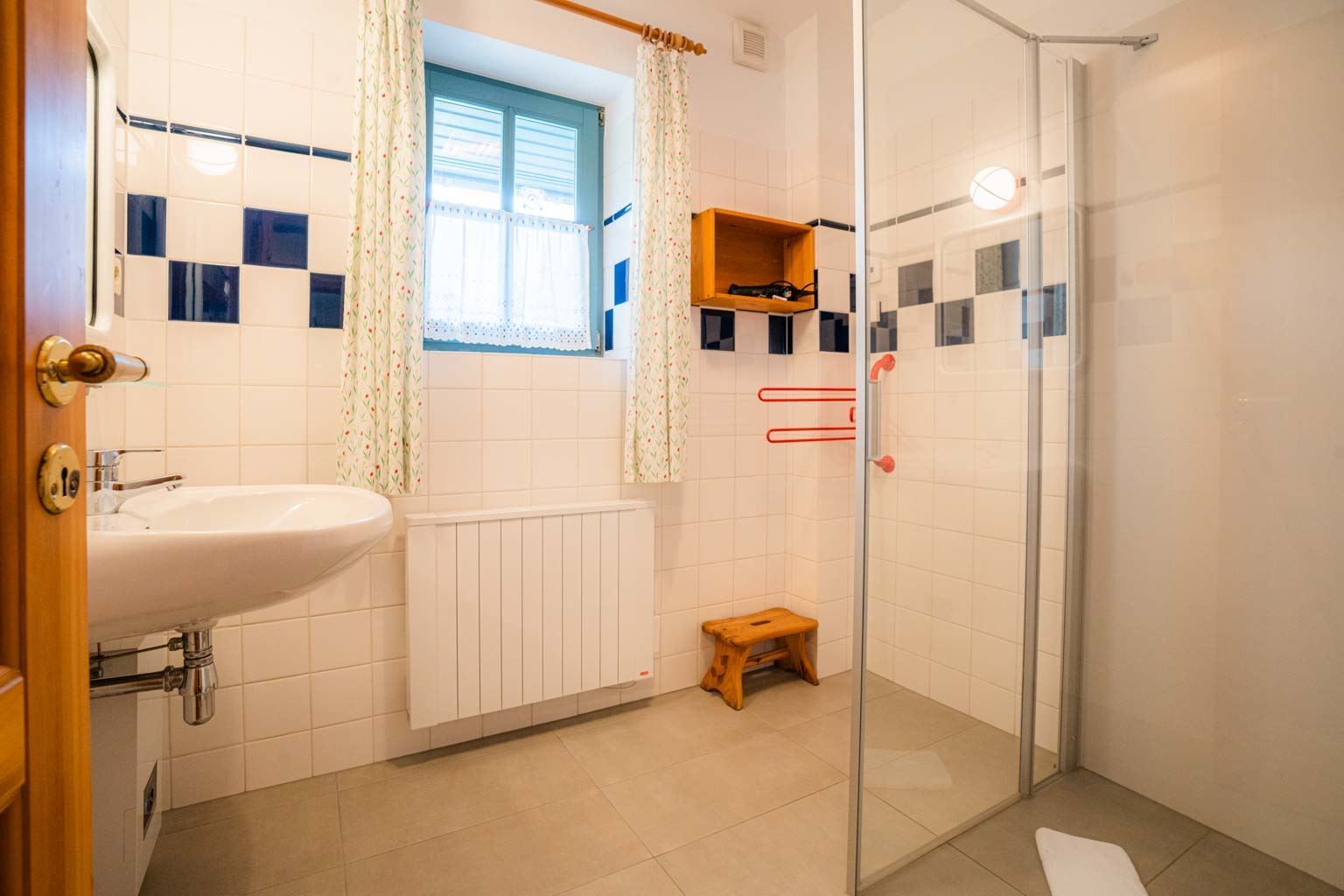 Badezimmer (Duschbad) mit bodengleicher (Regen-) Dusche, Tageslicht und Föhn. Separates WC mit Waschbecken.