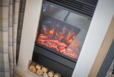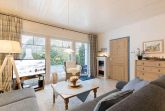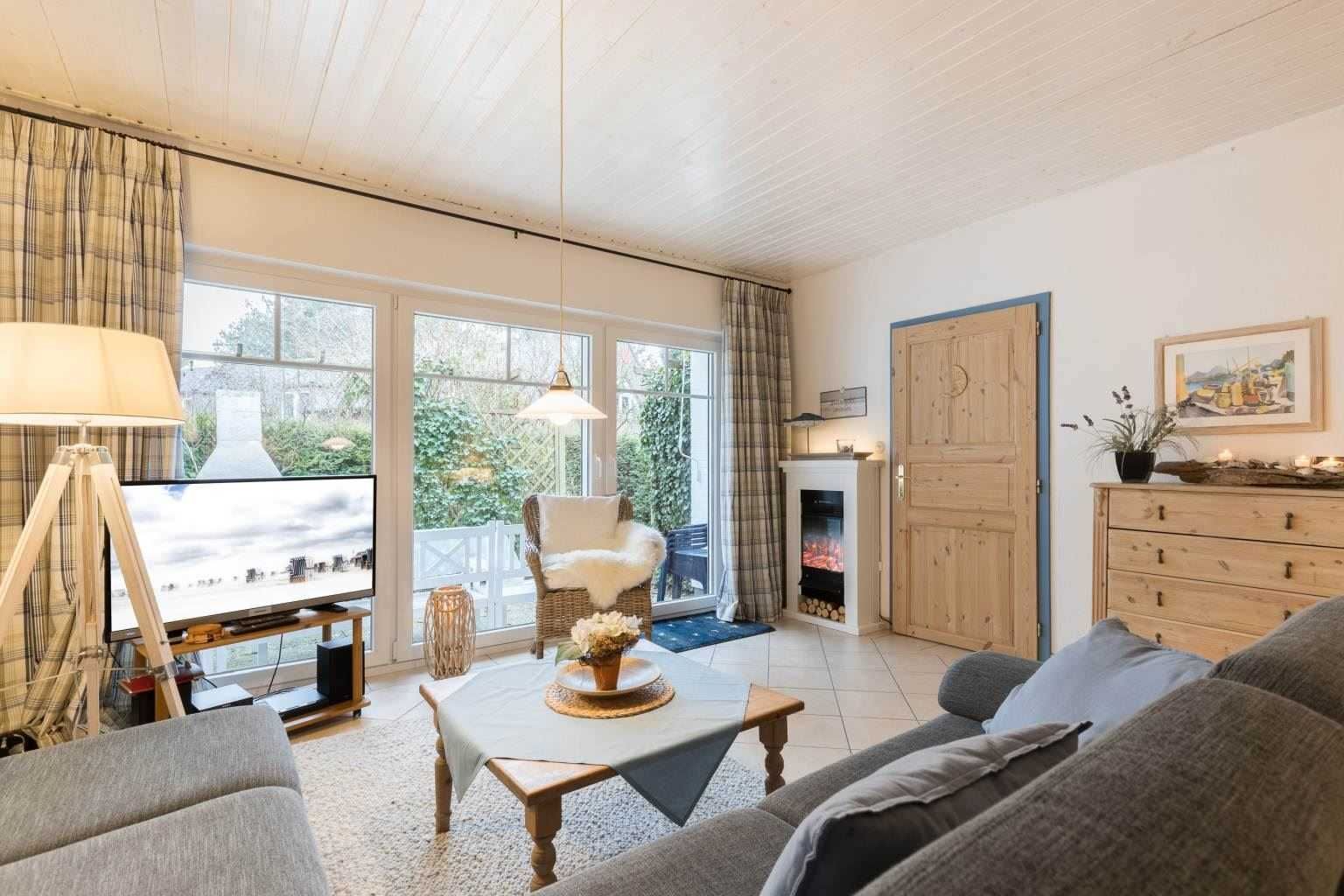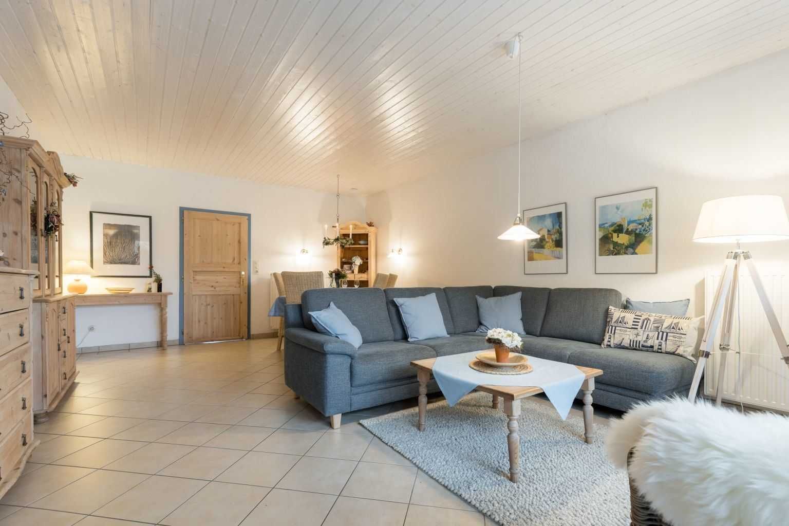Wohnzimmer mit großem Ecksofa für 4-5 Personen, Elektro-Kamin, einem Korbsessel, HD-TV (Sat), DVD-Player, Radio mit CD-Player und Esstisch für 6 Personen. Direkter Zugang zur schönen, möblierten Gartenterrasse mit Sonnenmarkise nach Süden.