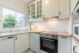 Separate Küche mit Backofen, Mikrowelle, Geschirrspüler und Kühlschrank mit Gefrierfach.