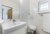 Modernes Badezimmer (Duschbad) mit bodengleicher Dusche, WC, Tageslicht und Föhn.