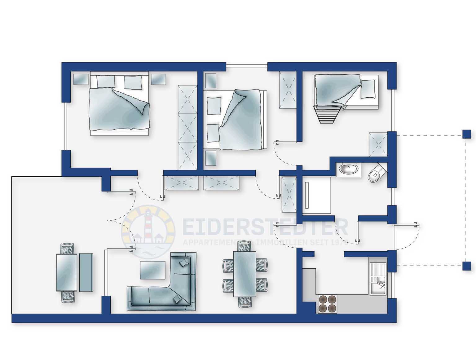 Komfortable Haushälfte Strandpirat im Landhausstil geschmackvoll eingerichtet, mit 4 Zimmern und ca. 75 qm auf 1 Ebene (EG) für bis zu 6 Personen (Wohlfühlbelegung: max. 4 Erwachsene). Ruhige, strandnahe Lage in einer verkehrsberuhigten Straße im Ortsteil Dorf in St. Peter-Ording. Geschäfte und Restaurants im Dorf sind in wenigen Gehminuten erreichbar. Zu diesem kinderfreundlichen Domizil gehören eine möblierte Terrasse vor dem Haus, sowie eine Terrasse im Garten hinter dem Haus mit Strandkorb, Gartenmöbeln und Spielgeräten - ideal für einen Familienurlaub an der Nordseeküste.