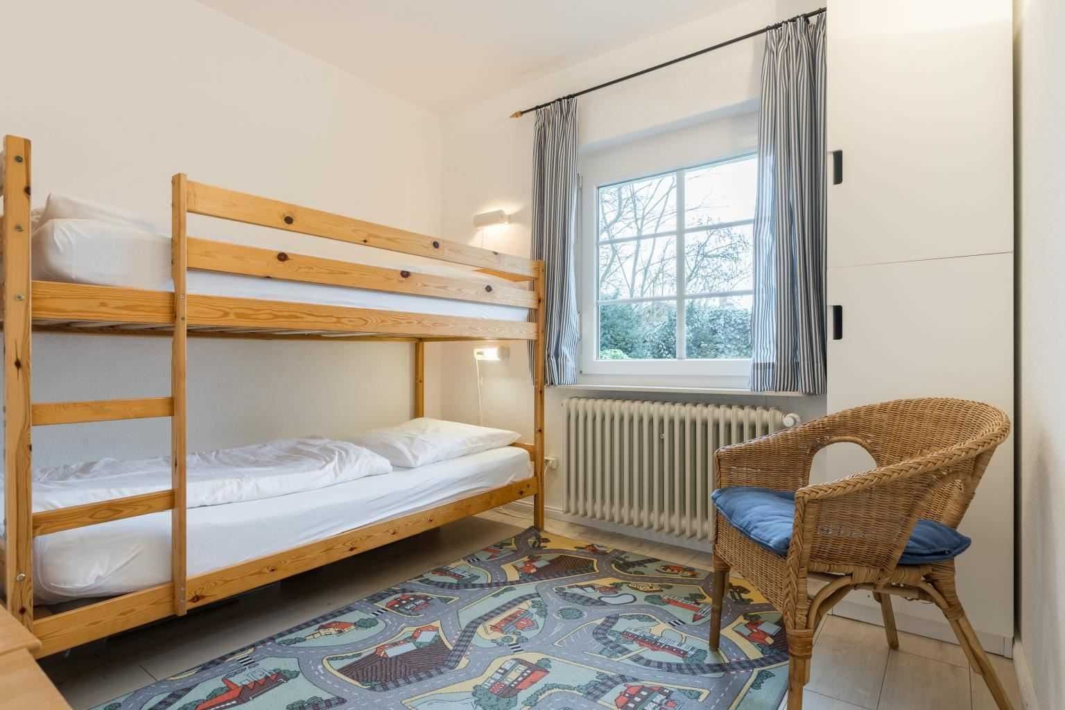 3. Schlafzimmer mit 2 Etagen-Einzelbetten (je 90x200cm), Kleiderschrank, Spielteppich, Spielen, Büchern und kleinem Tisch mit Stühlen.