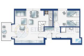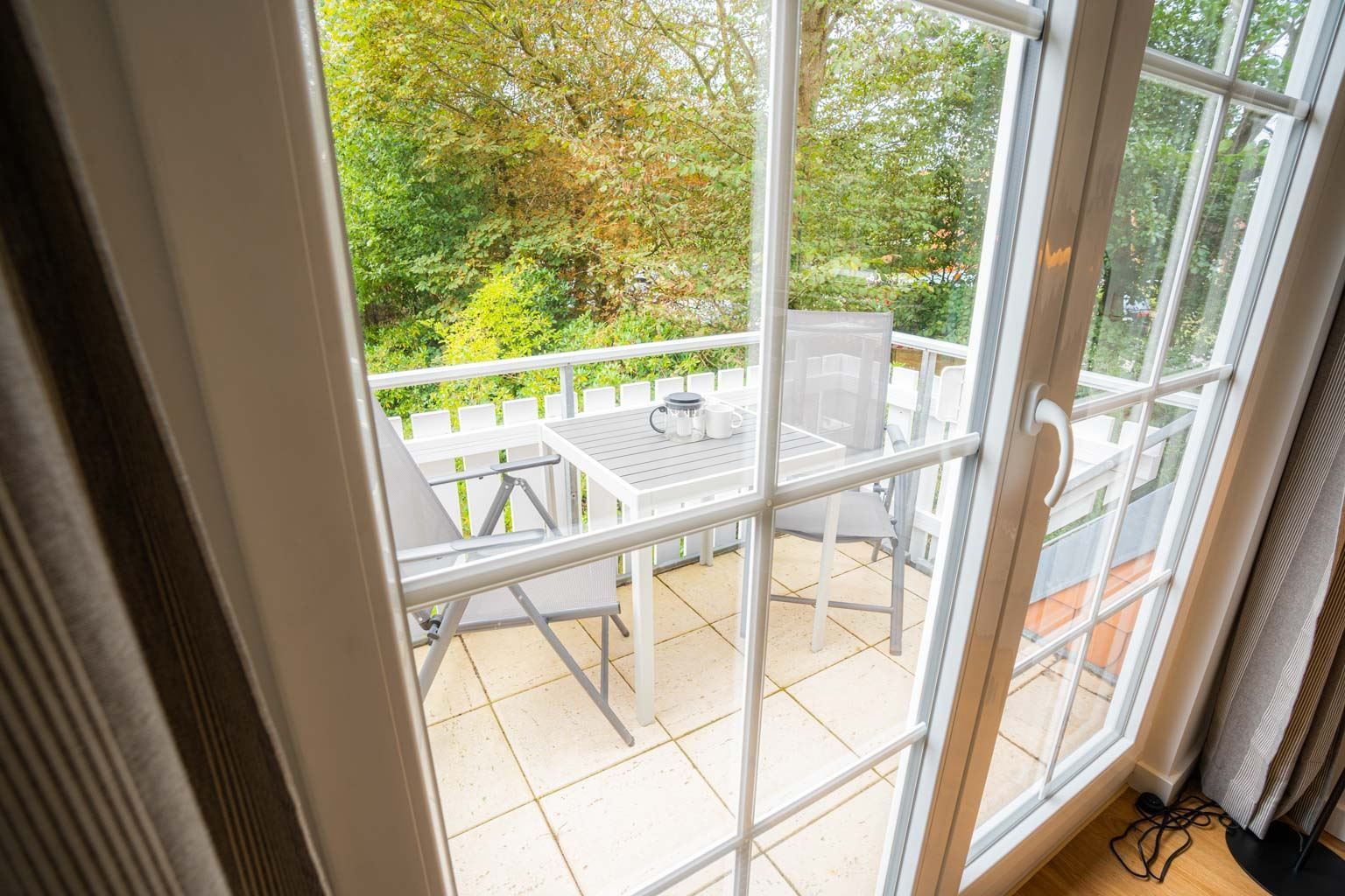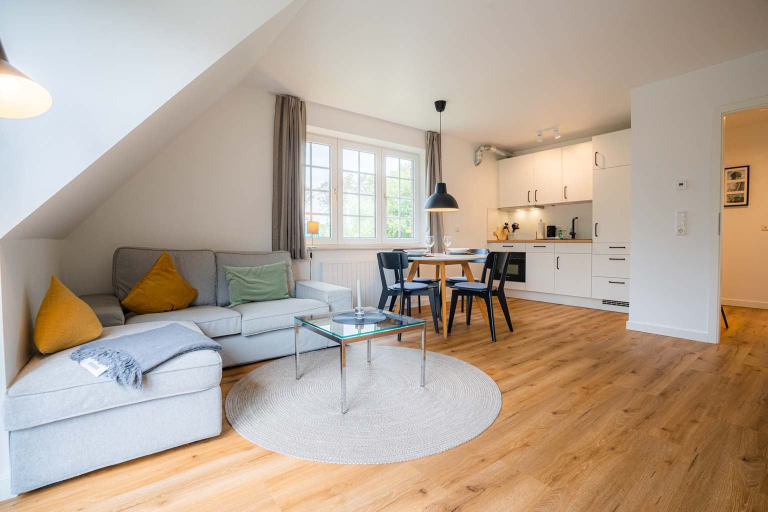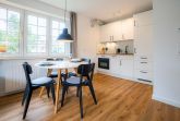 Wohnzimmer mit Ecksofa (2er) mit Polsterhocker, SMART-TV (Kabel) mit Radio und Esstisch mit 2 Stühlen. Direkter Zugang zum möblierten Balkon nach Süden. Offene Küche mit Backofen, Induktionsherd mit 2 Kochstellen, Mikrowelle, Kühlschrank mit Gefrierfach und Geschirrspüler.