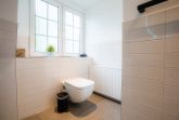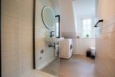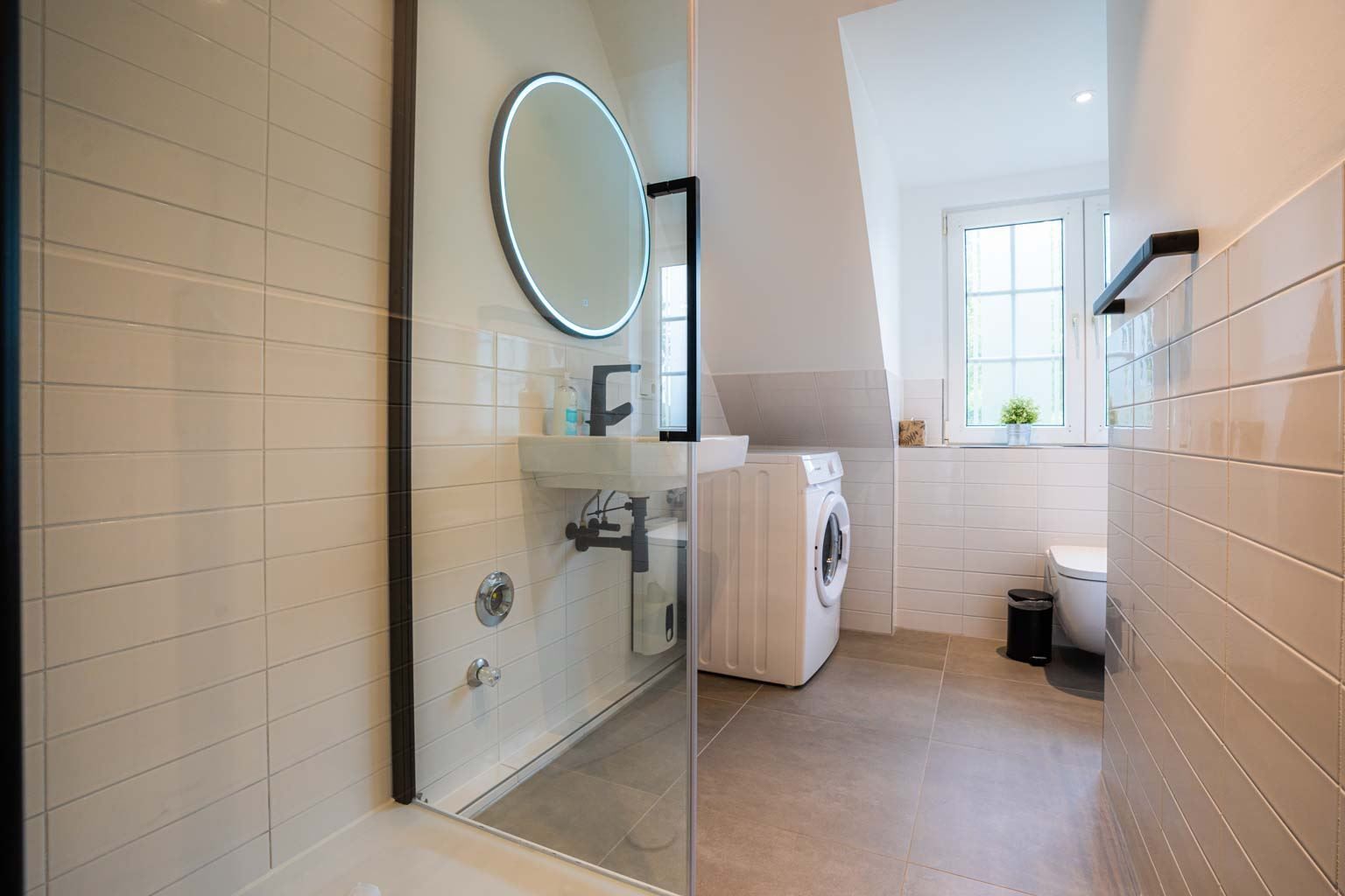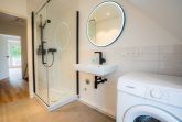 Badezimmer (Duschbad) mit ebenerdiger Dusche, WC, Waschmaschine (kostenlos), Föhn und Tageslicht.