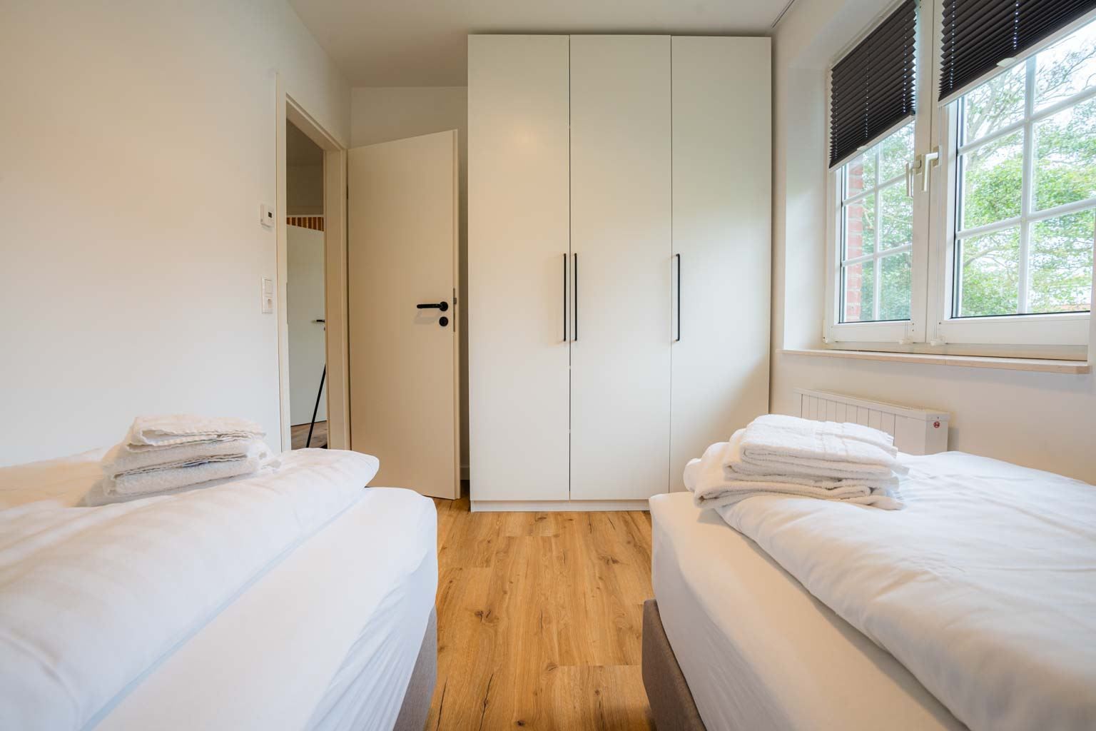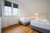 Schlafzimmer mit 2 Einzelbetten (je 90x200cm, Boxspring), Kleiderschrank und 2 Stühlen.