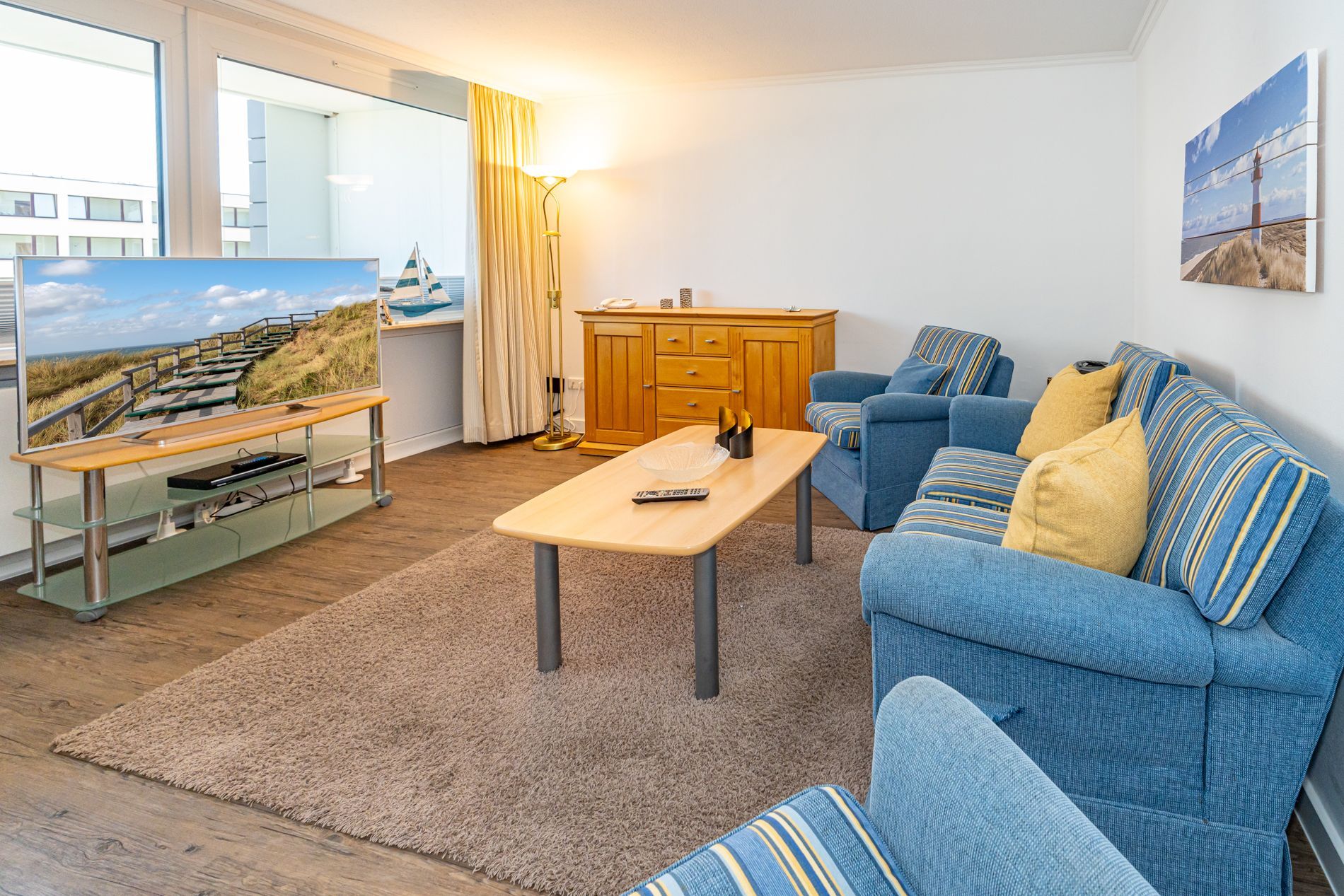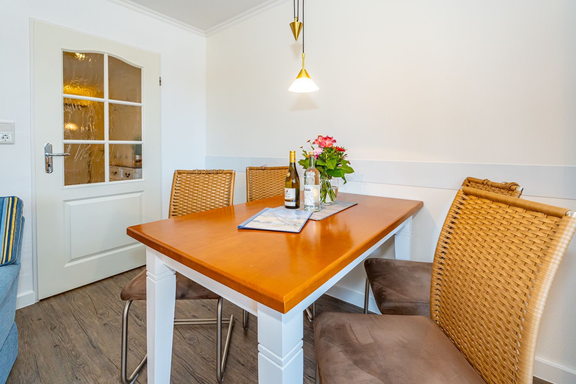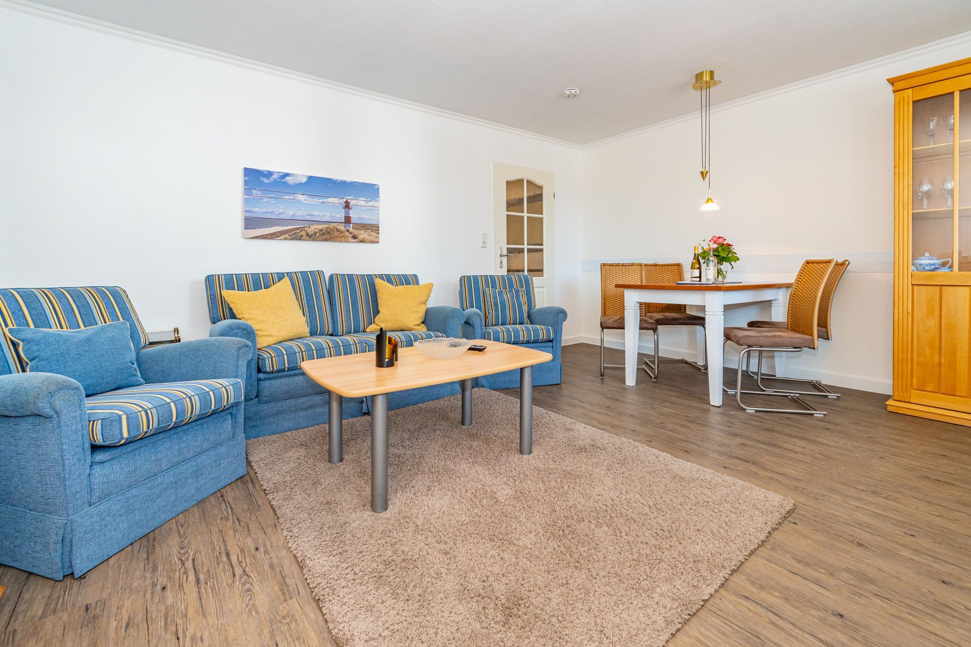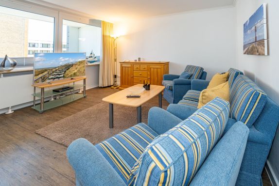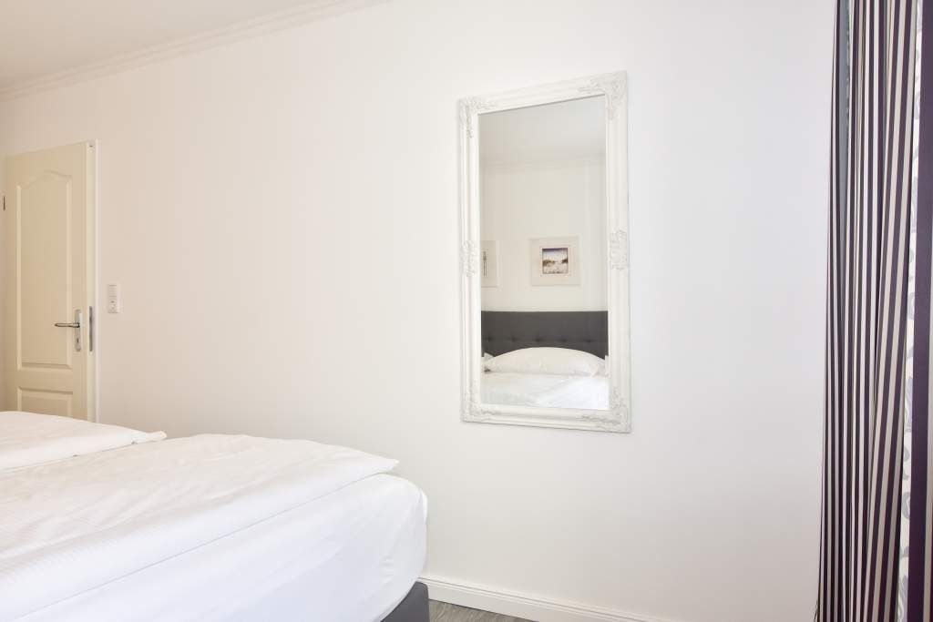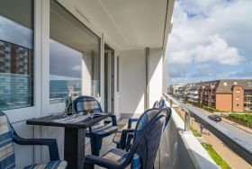 Schick renovierte 3-Zimmer-Nichtraucher-Ferienwohnung, ca. 63 qm, in der 2. Etage zur Landseite mit Ostloggia (Morgensonne, mit Balkonmöbeln und Auflagen) für max. 4 Personen (stufenfrei erreichbar).