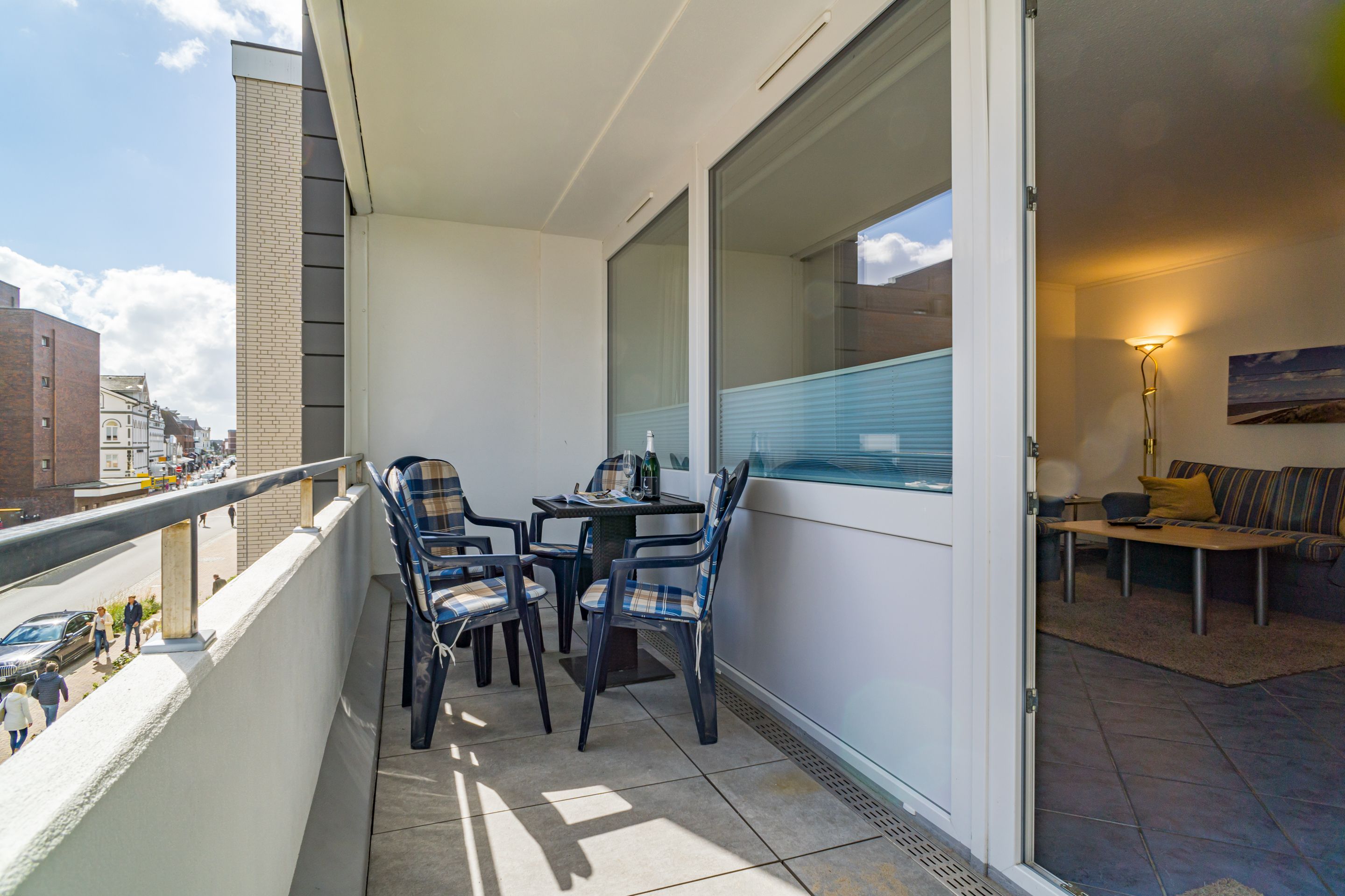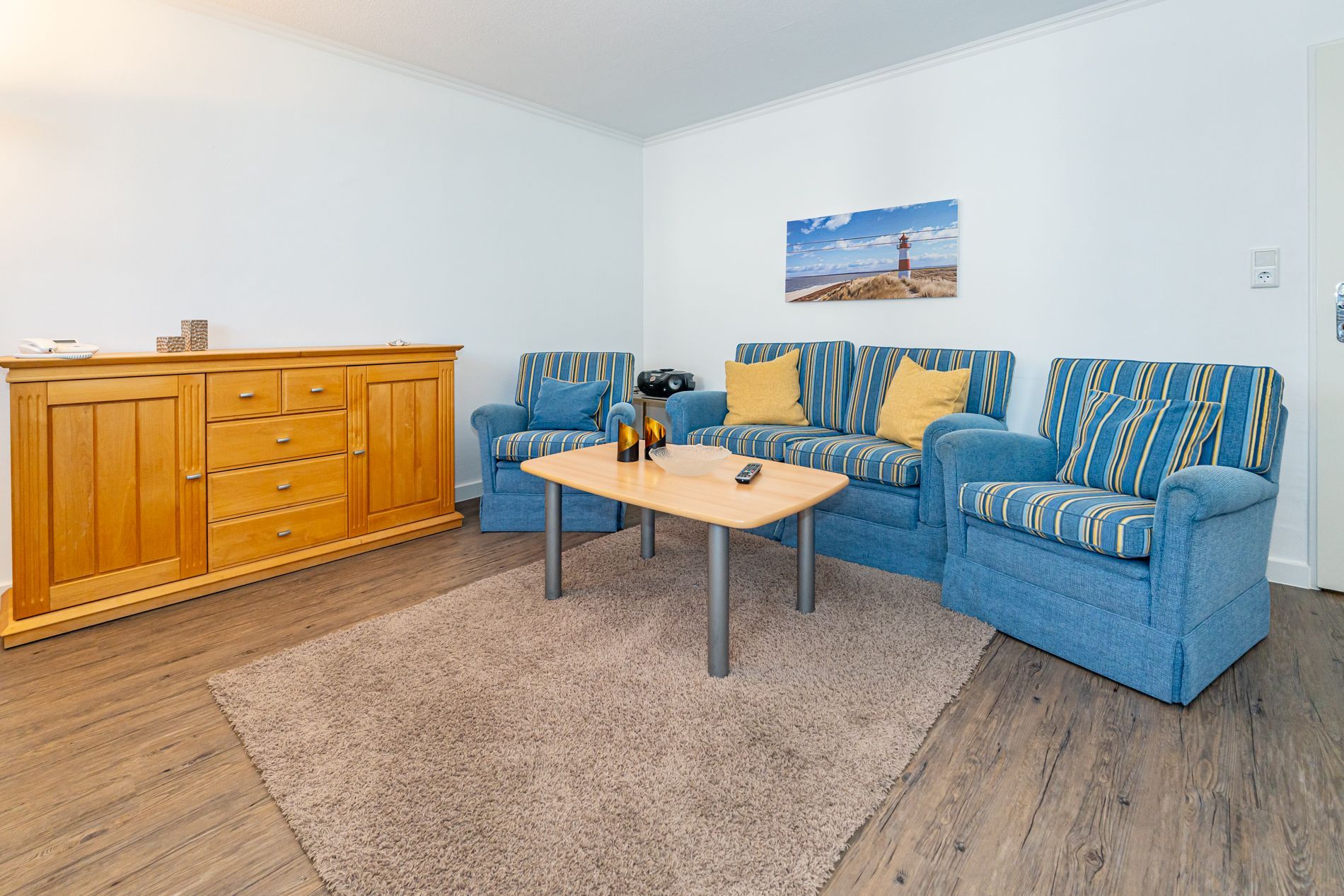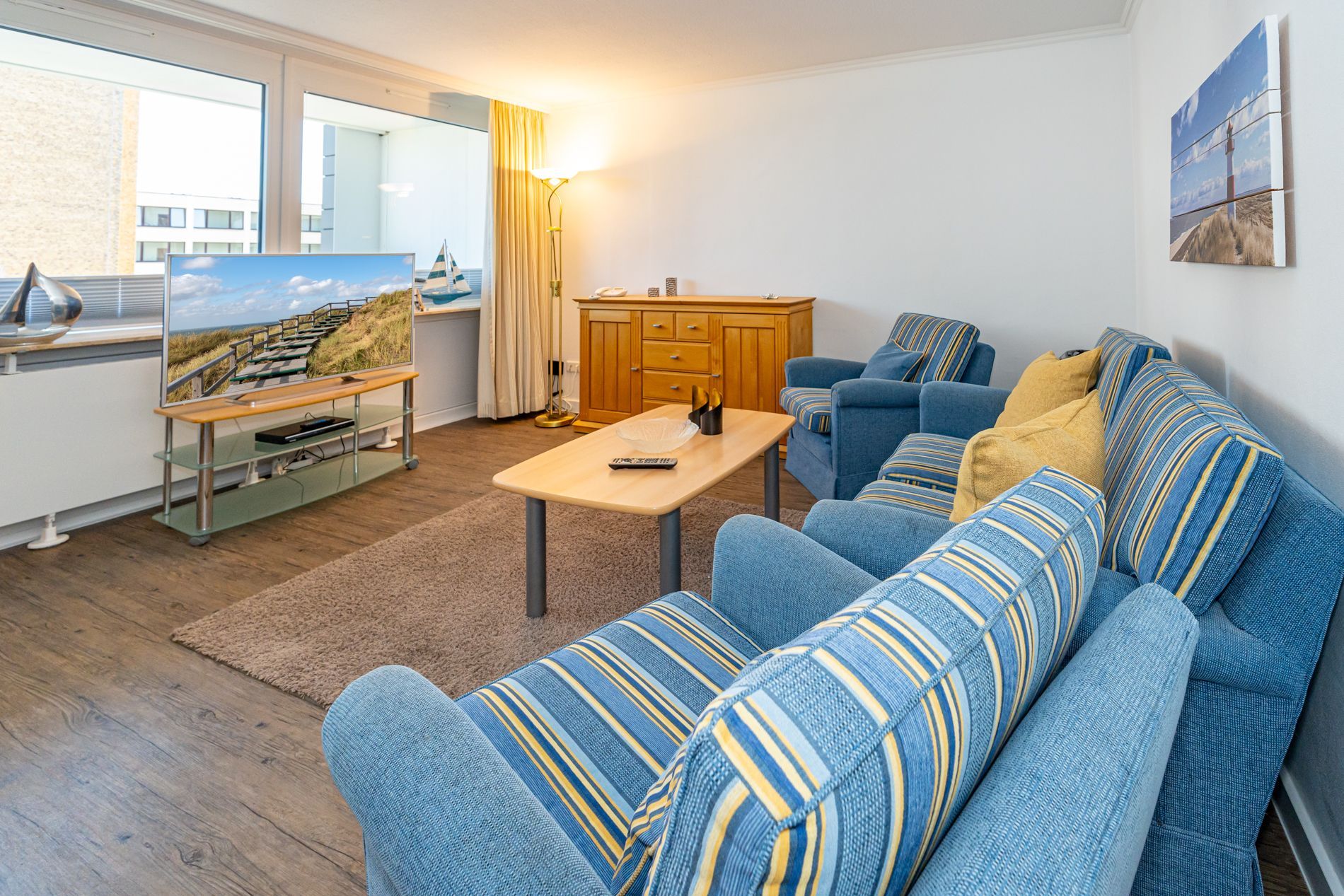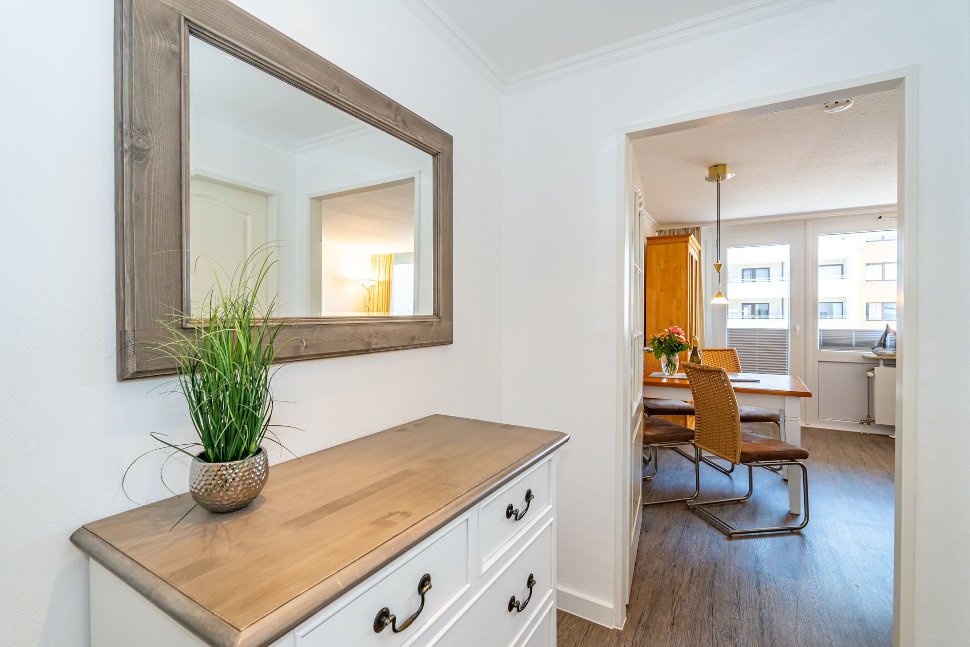Schick renovierte 3-Zimmer-Nichtraucher-Ferienwohnung, ca. 63 qm, in der 2. Etage zur Landseite mit Ostloggia (Morgensonne, mit Balkonmöbeln und Auflagen) für max. 4 Personen (stufenfrei erreichbar).