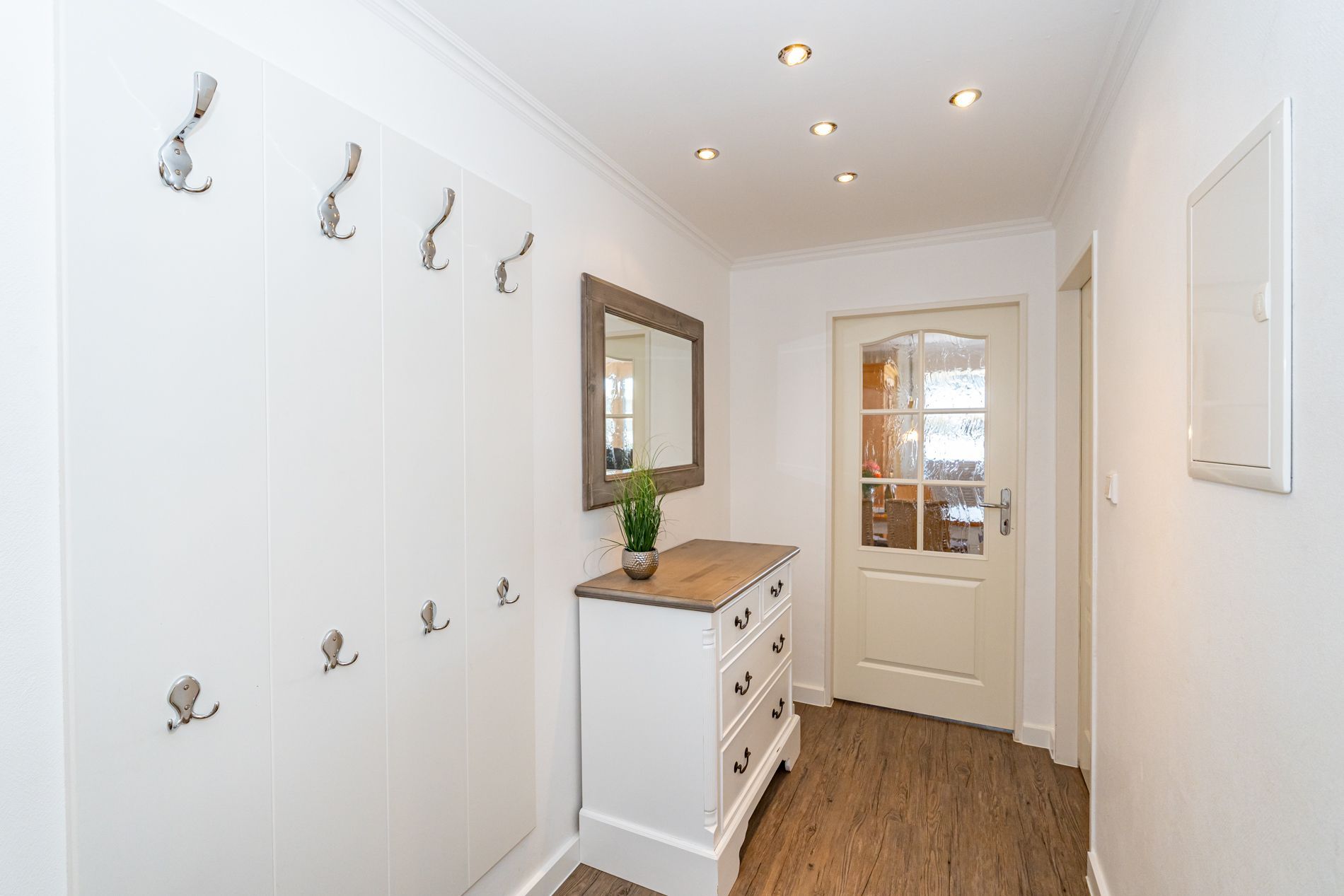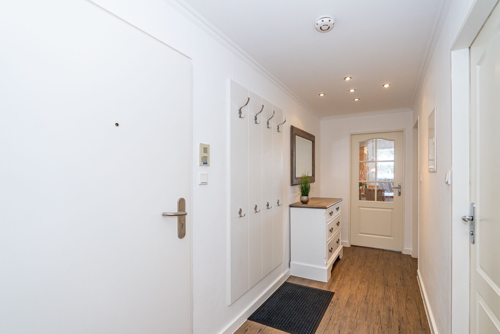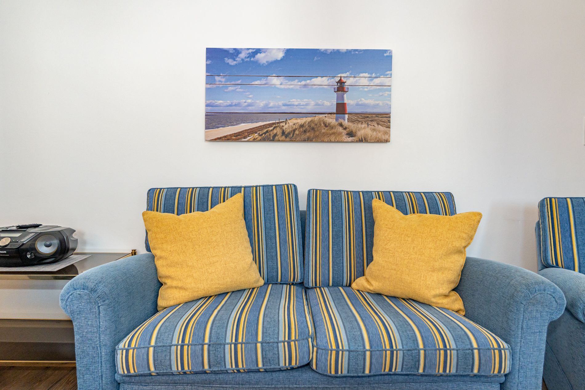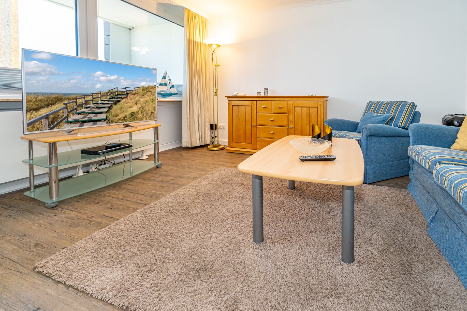Schick renovierte 3-Zimmer-Nichtraucher-Ferienwohnung, ca. 63 qm, in der 2. Etage zur Landseite mit Ostloggia (Morgensonne, mit Balkonmöbeln und Auflagen) für max. 4 Personen (stufenfrei erreichbar).