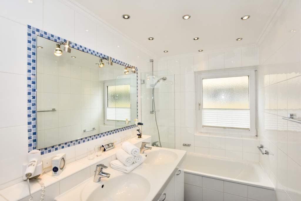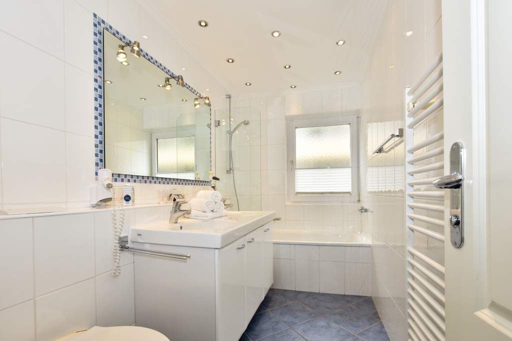 Das neue großzügige Bad hat eine Badewanne mit Duschmöglichkeit und Glastrennwand, einen Doppelwaschtisch, einen Handtuchtrockner, ein WC und einen Fön.
