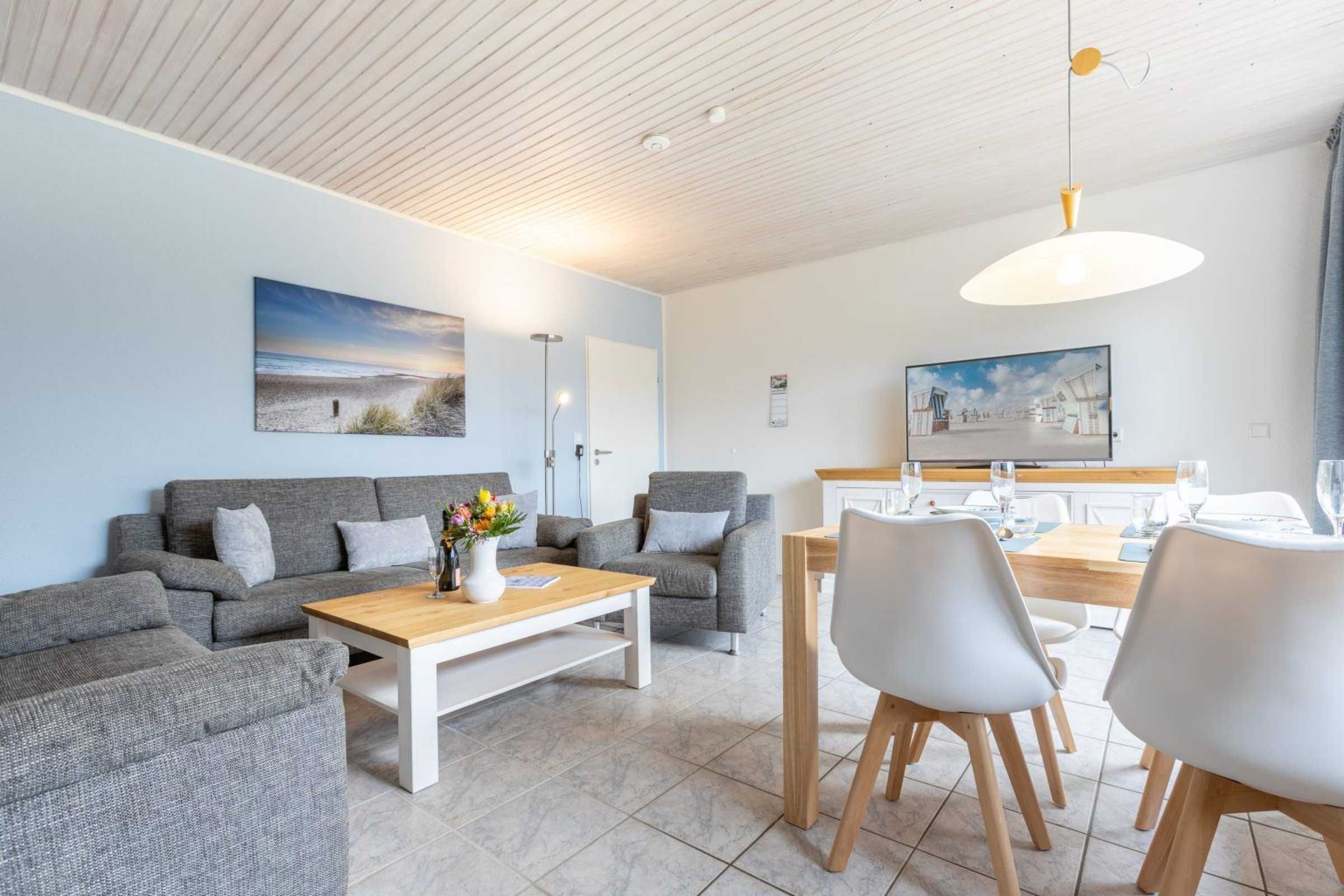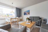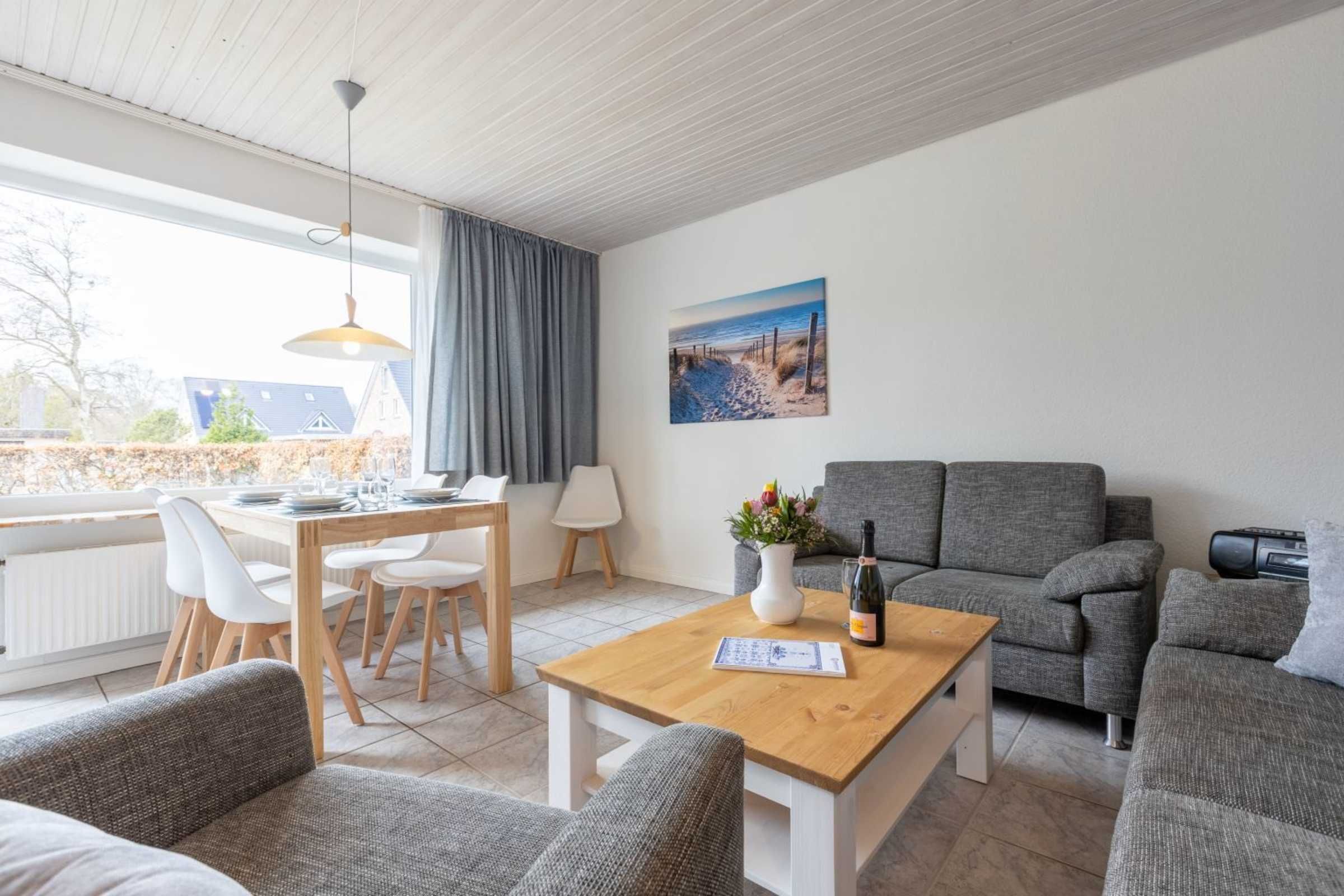 Wohnzimmer mit 2 Sofas (3er und 2er), Sessel, großem SMART-TV (Sat), Radio, Esstisch für 5 Personen und direktem Zugang zur möblierten Südterrasse.