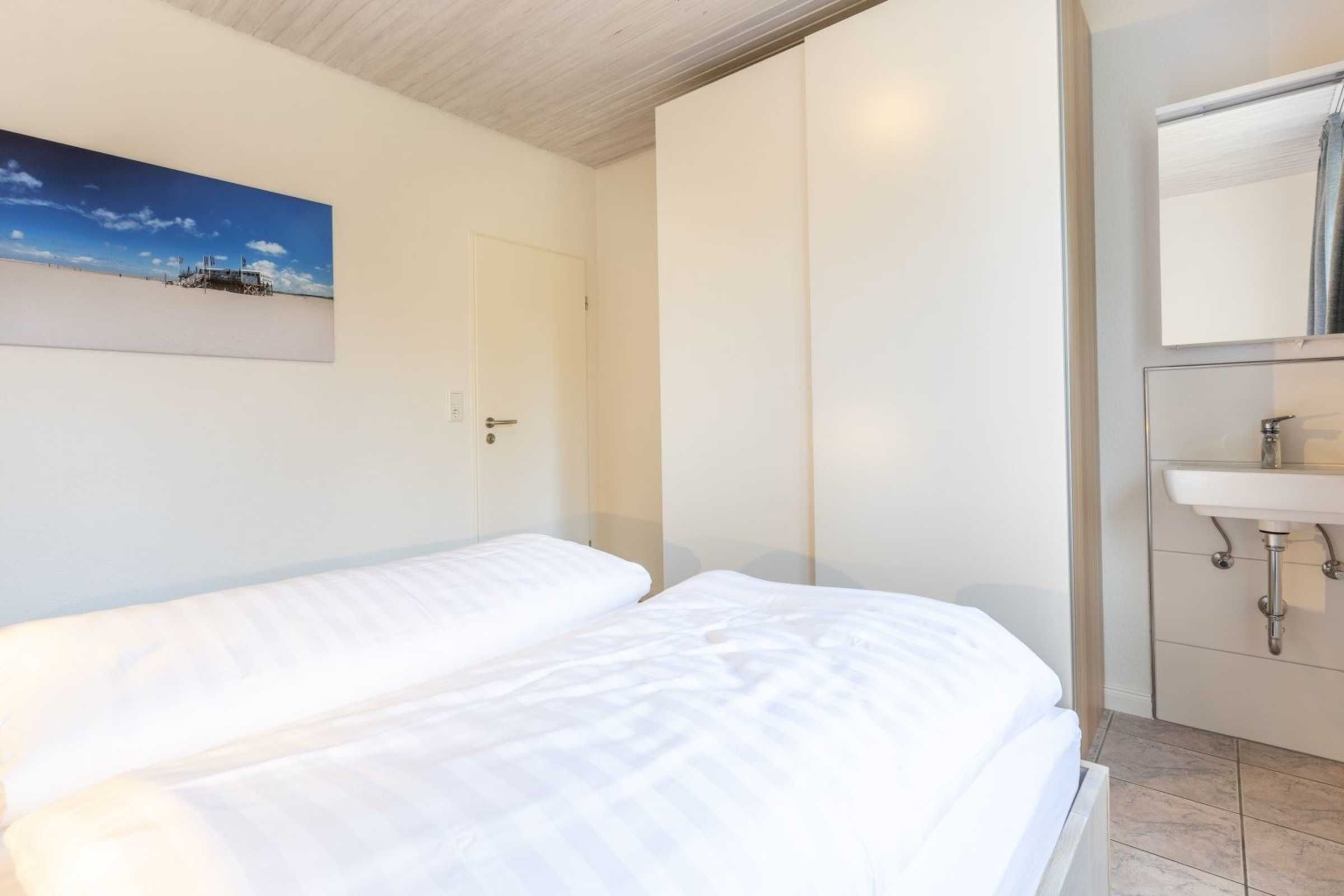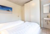 1. Schlafzimmer mit Doppelbett (2x 90x200cm), Kleiderschrank und Waschbecken mit Spiegelschrank.