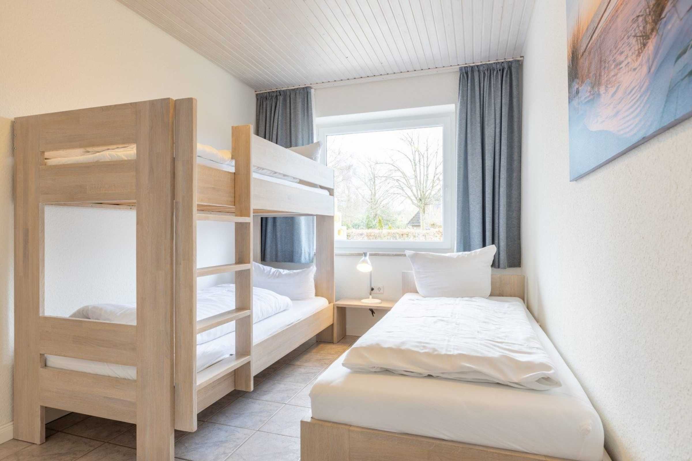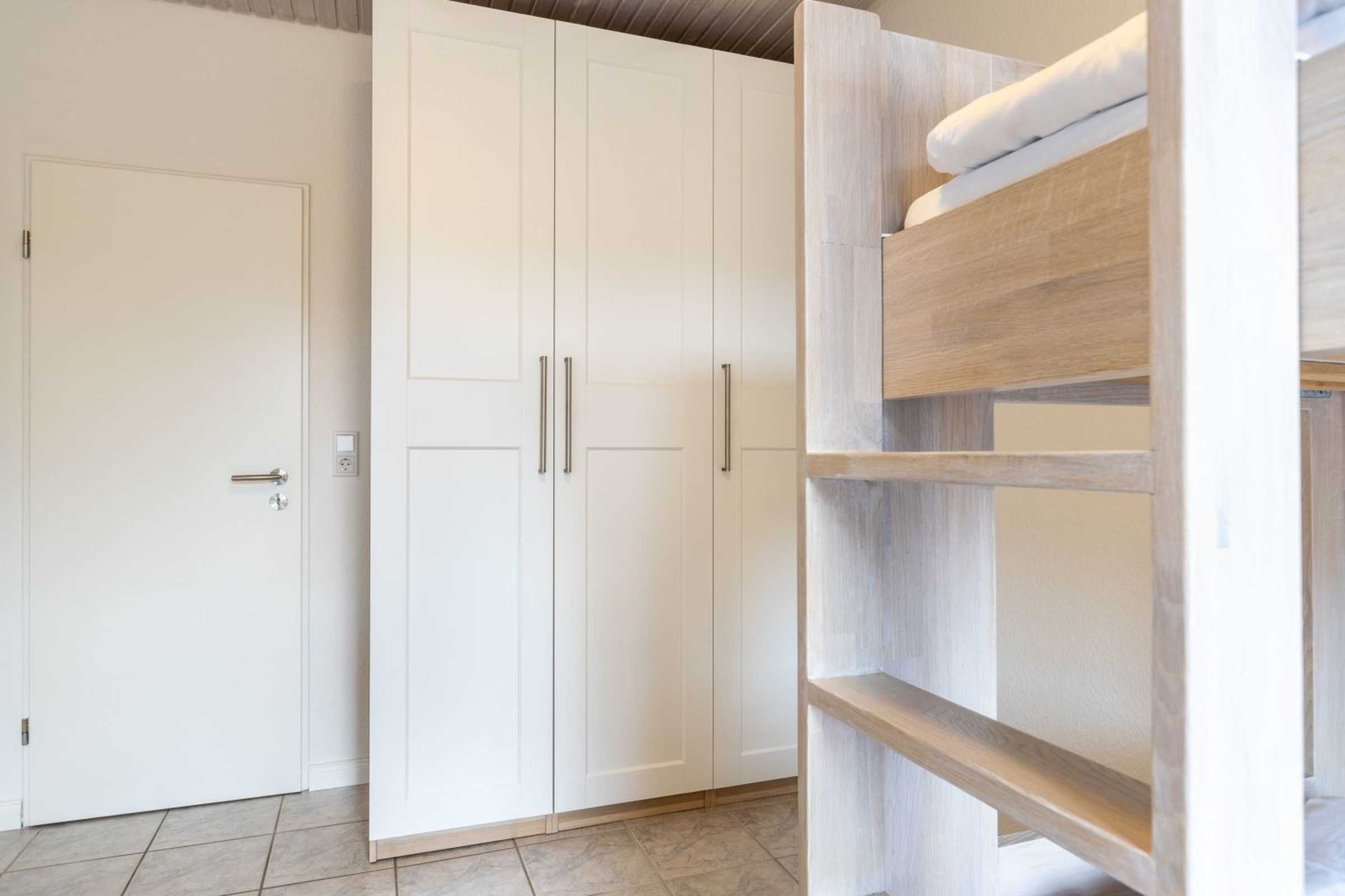 2. Schlafzimmer mit Einzelbett (90x200cm), 2 Etagen-Einzelbetten (je 90x200cm) und Kleiderschrank.