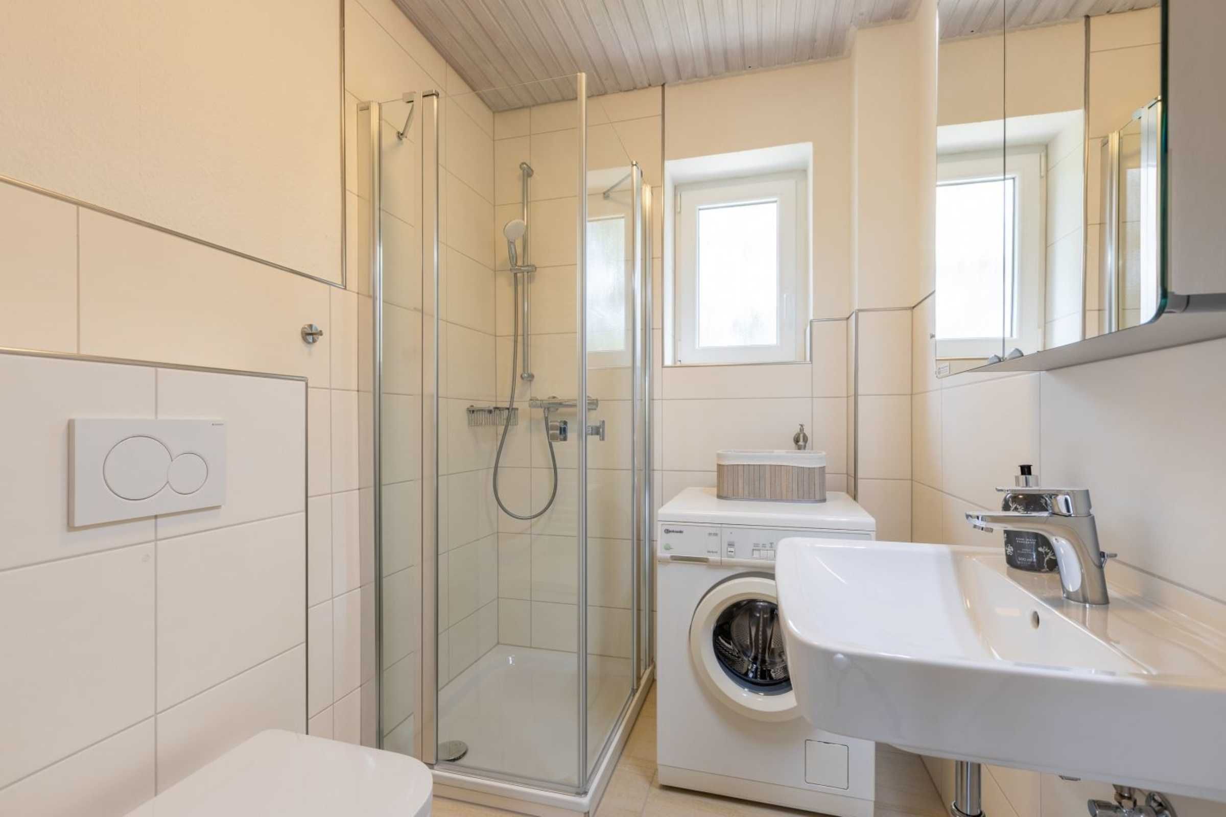 Badezimmer (Duschbad) mit Dusche, WC, Waschmaschine, Handtuchwärmer und Tageslicht.