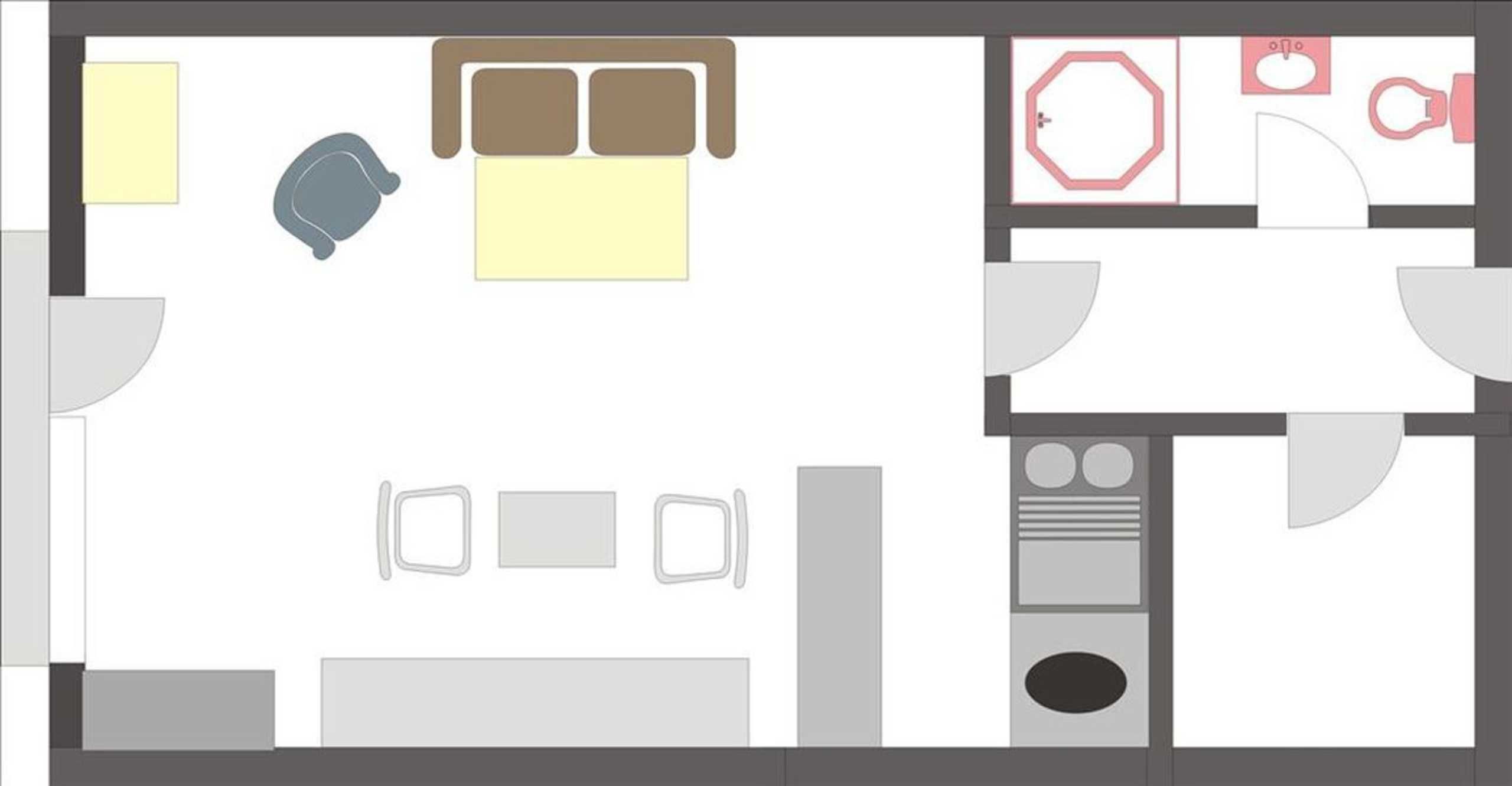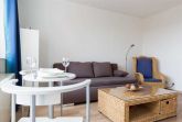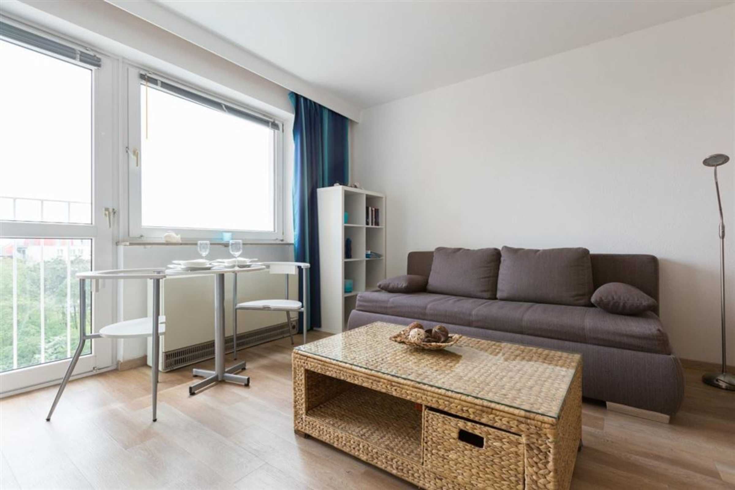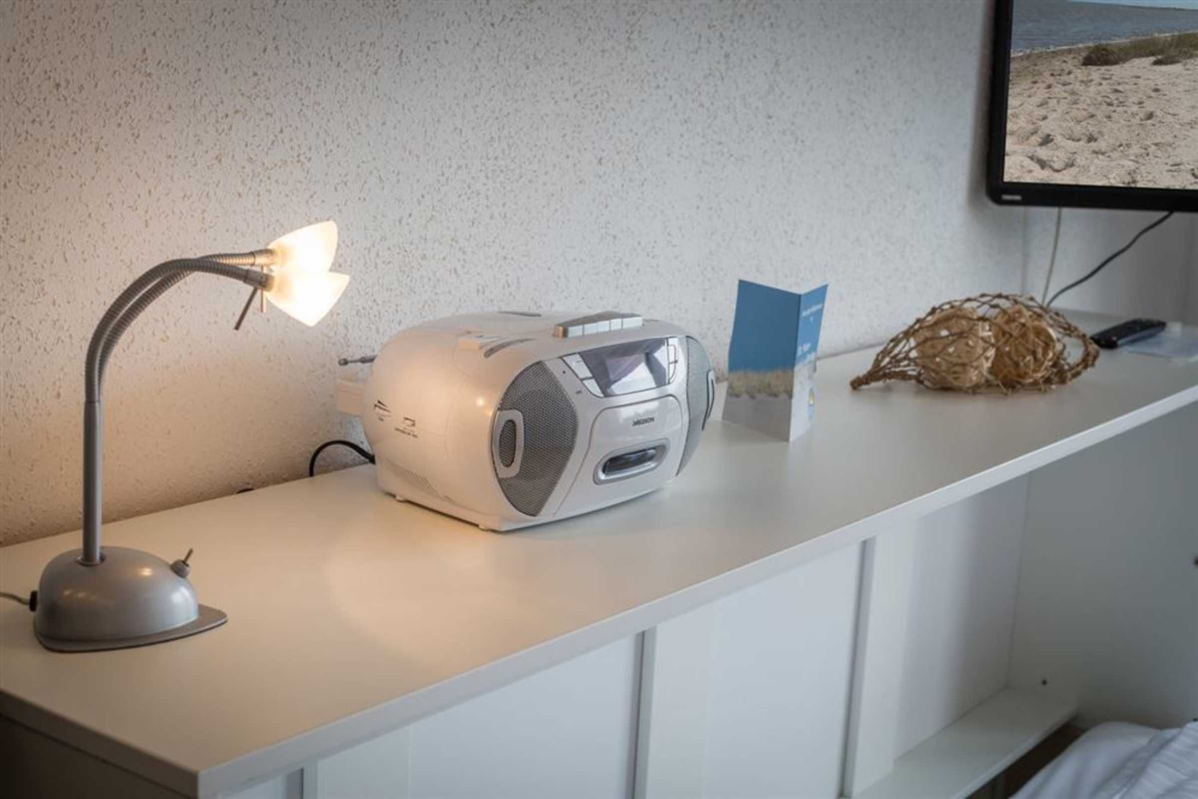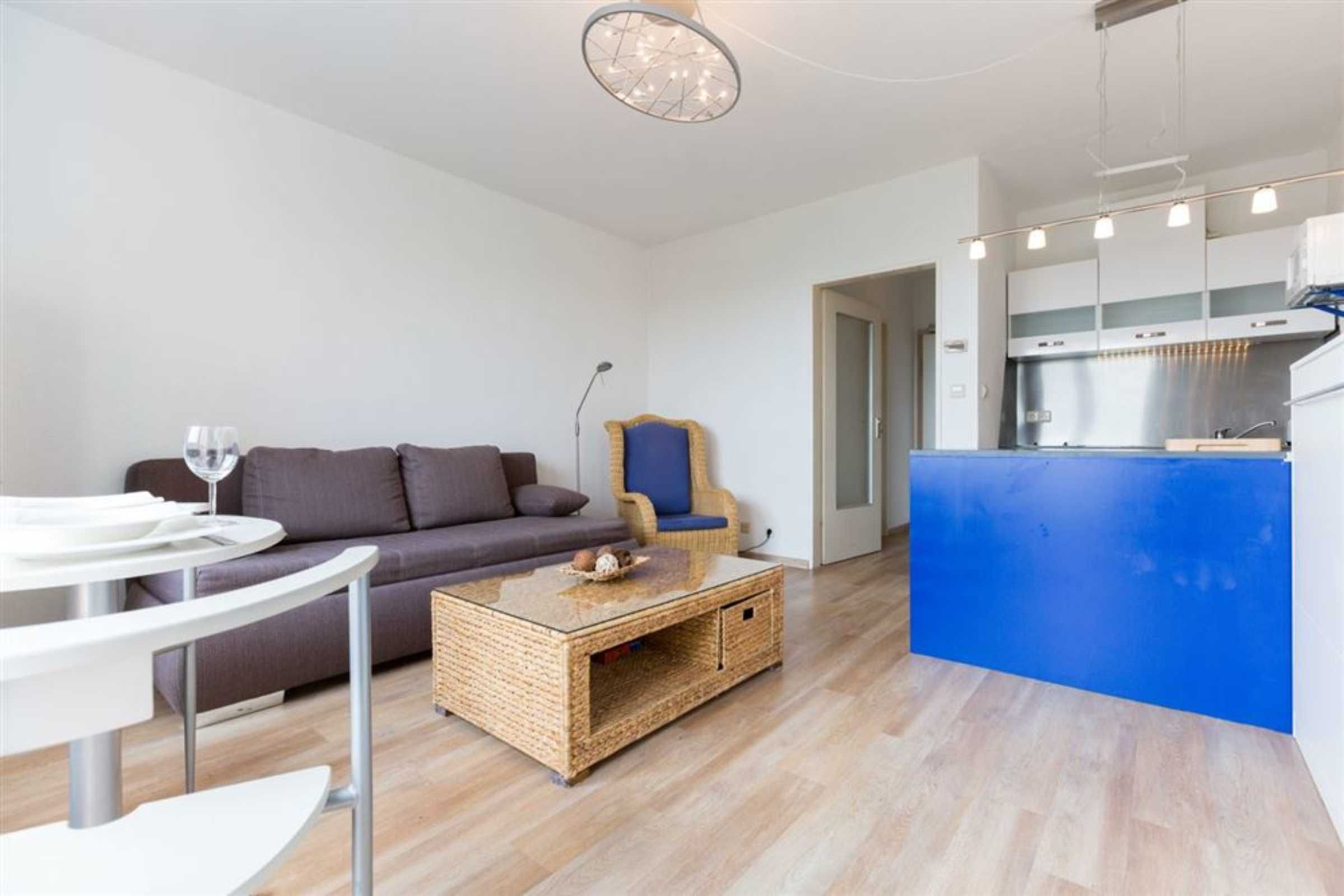 Wohn- und Schlafzimmer mit ausziehbarem Schlafsofa (160x190cm), ausklappbarem Schrank-Einzelbett (90x200cm), Korbsessel, Esstisch mit 2 Stühlen, TV (Sat) und Radio. Französischer Balkon. Offene Küche mit 2 Ceran-Kochstellen, Backofen, Mikrowelle, Geschirrspüler und Kühlschrank mit Gefrierfach.