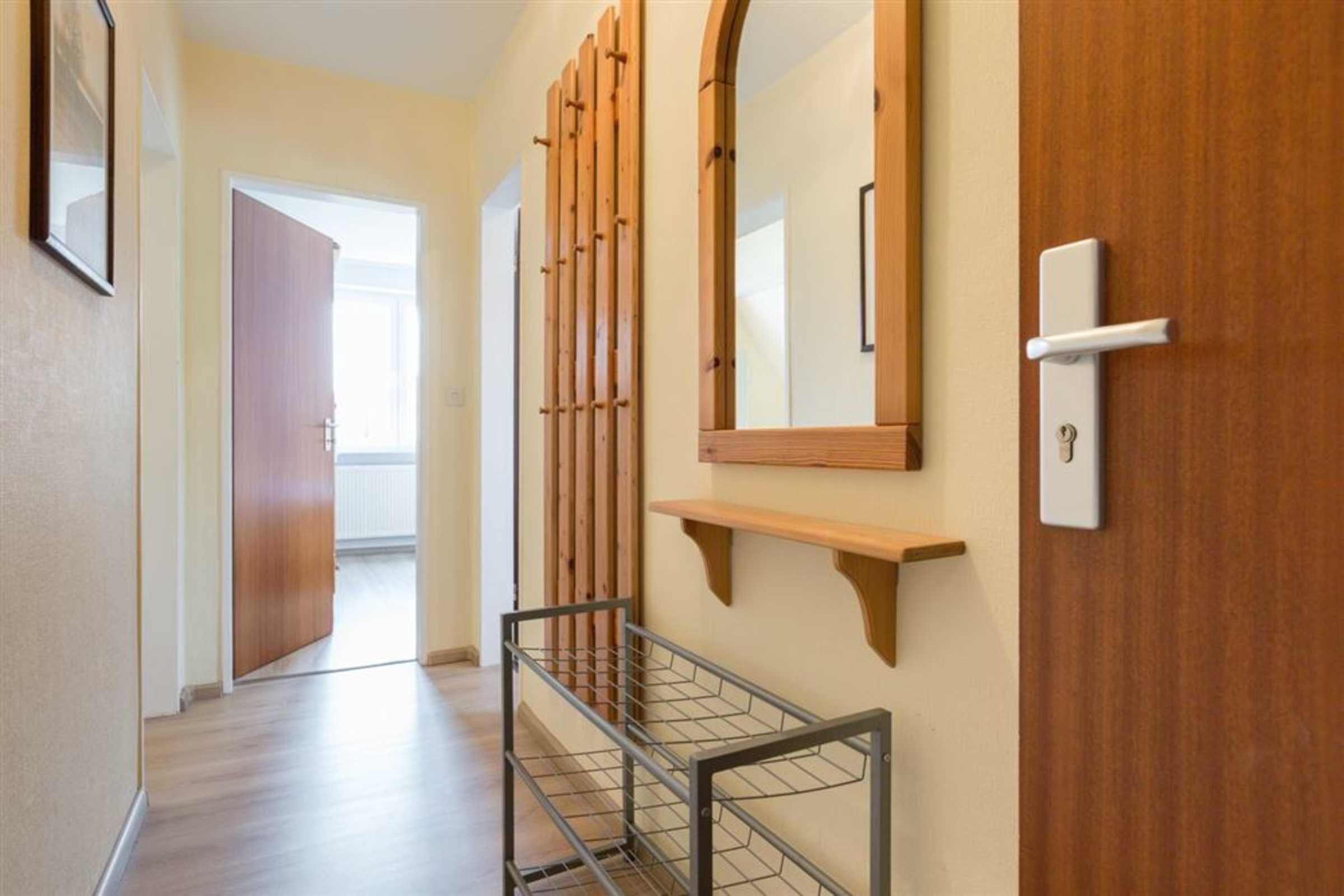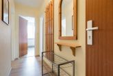 Flur mit Garderobe, Spiegel und Schuhablage im Eingangsbereich.