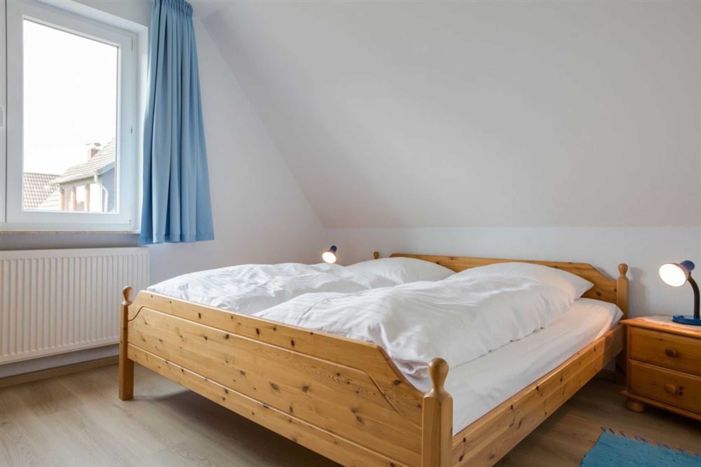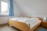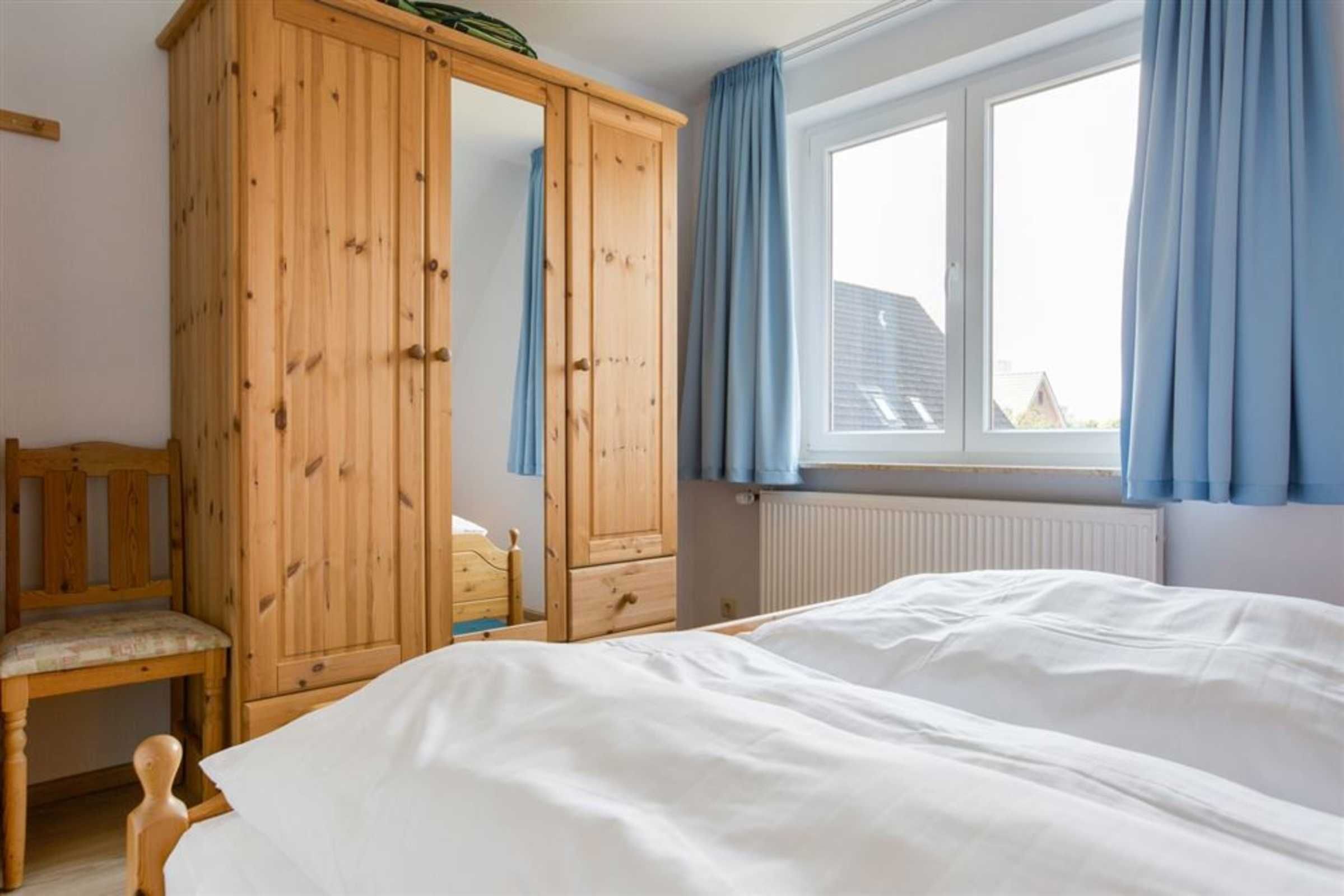 Schlafzimmer mit Doppelbett (2x 90x200cm), Stuhl und Kleiderschrank.
