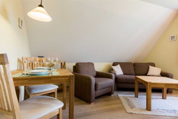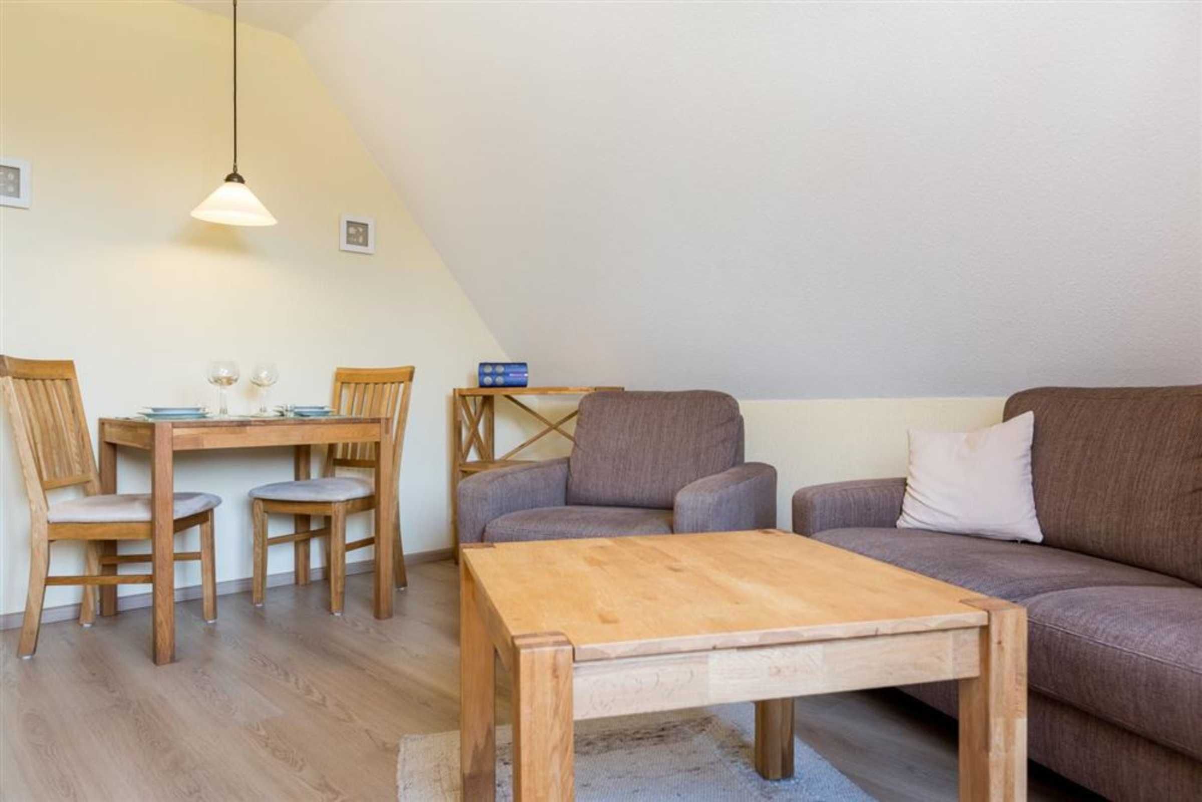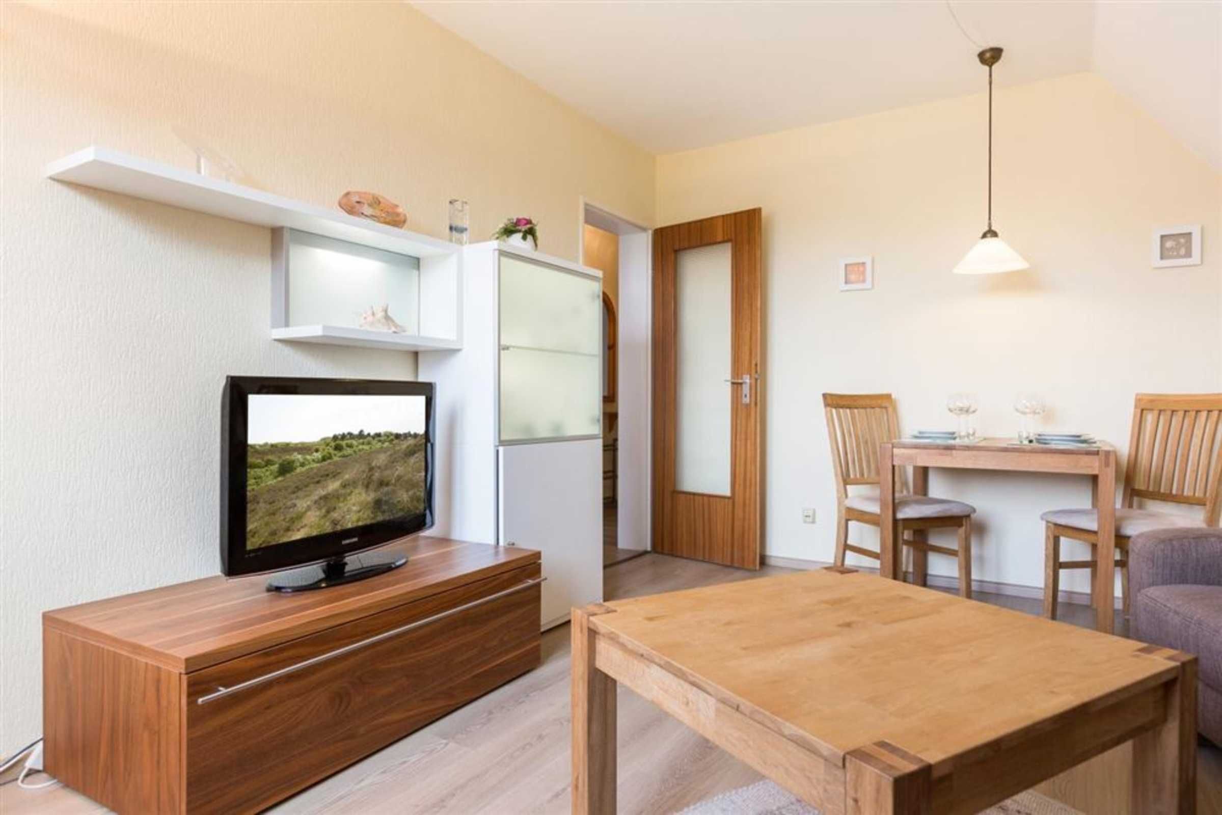 Wohnzimmer mit Sofa (2er), Sessel, TV (Sat) und kleinem Esstisch mit 2 Stühlen.