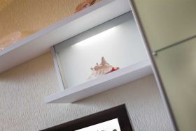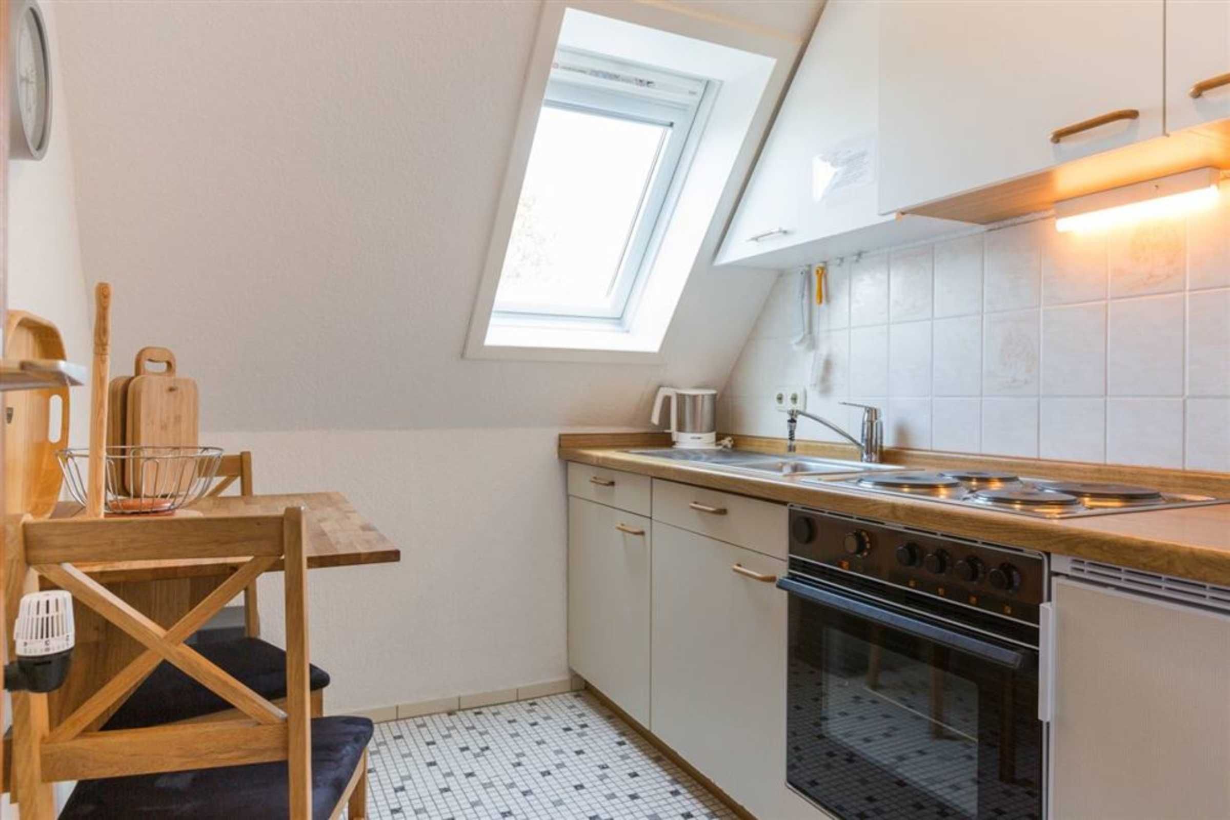 Separate Küche mit Backofen, Mikrowelle, Kühlschrank mit Gefrierfach, Geschirrspüler, Kapsel-Kaffeemaschine Philips Senseo und Anrichte.