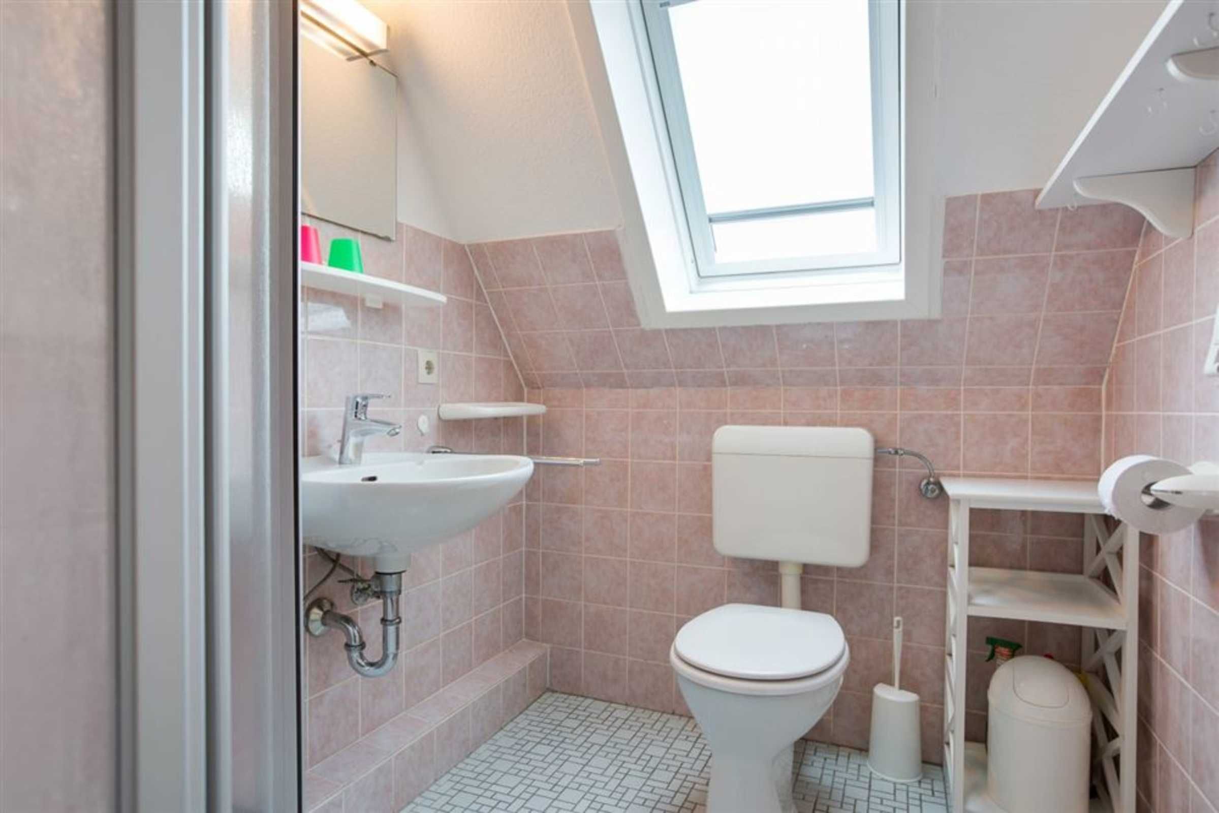 Badezimmer (Duschbad) mit Dusche, WC und Tageslicht. Kein Föhn.