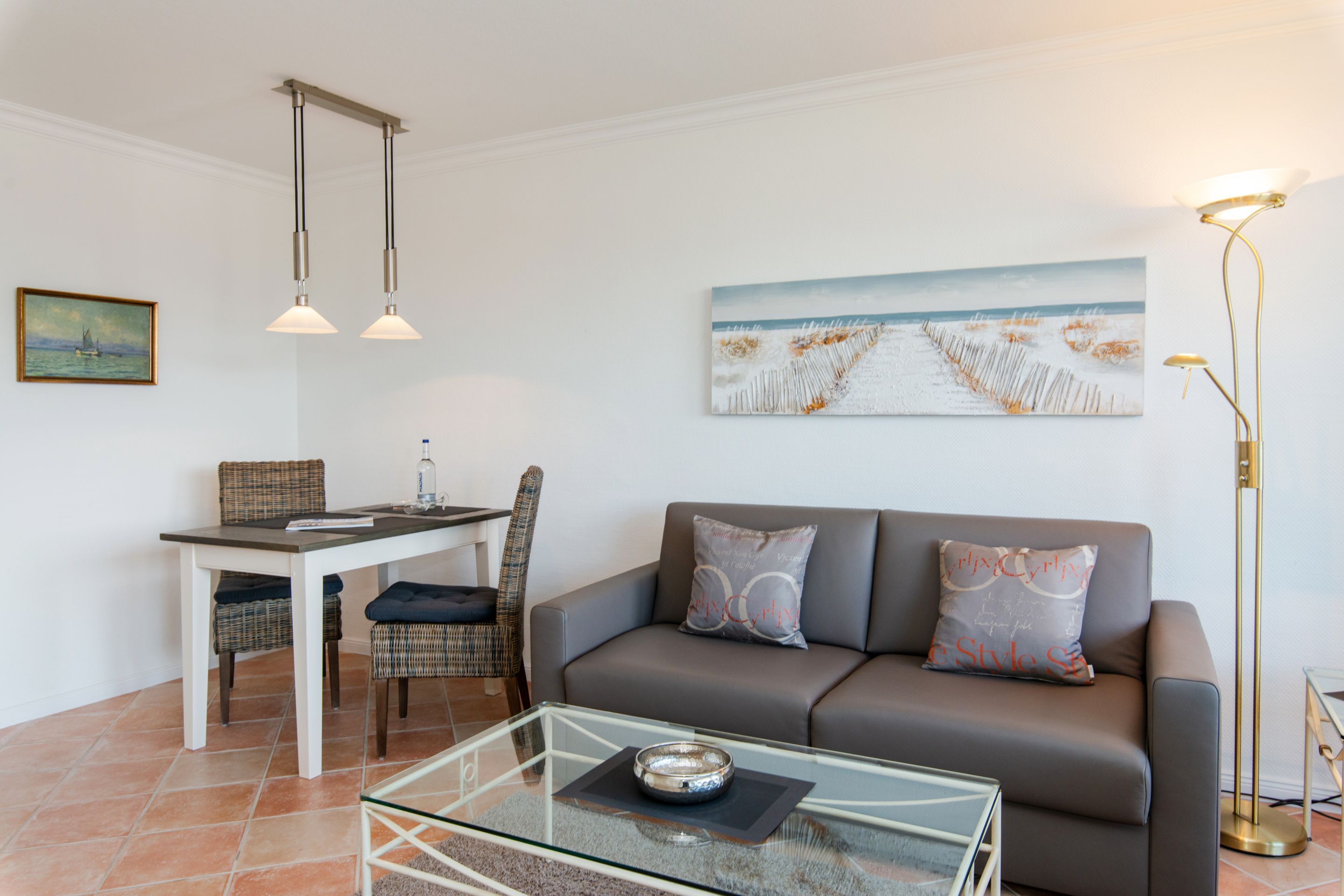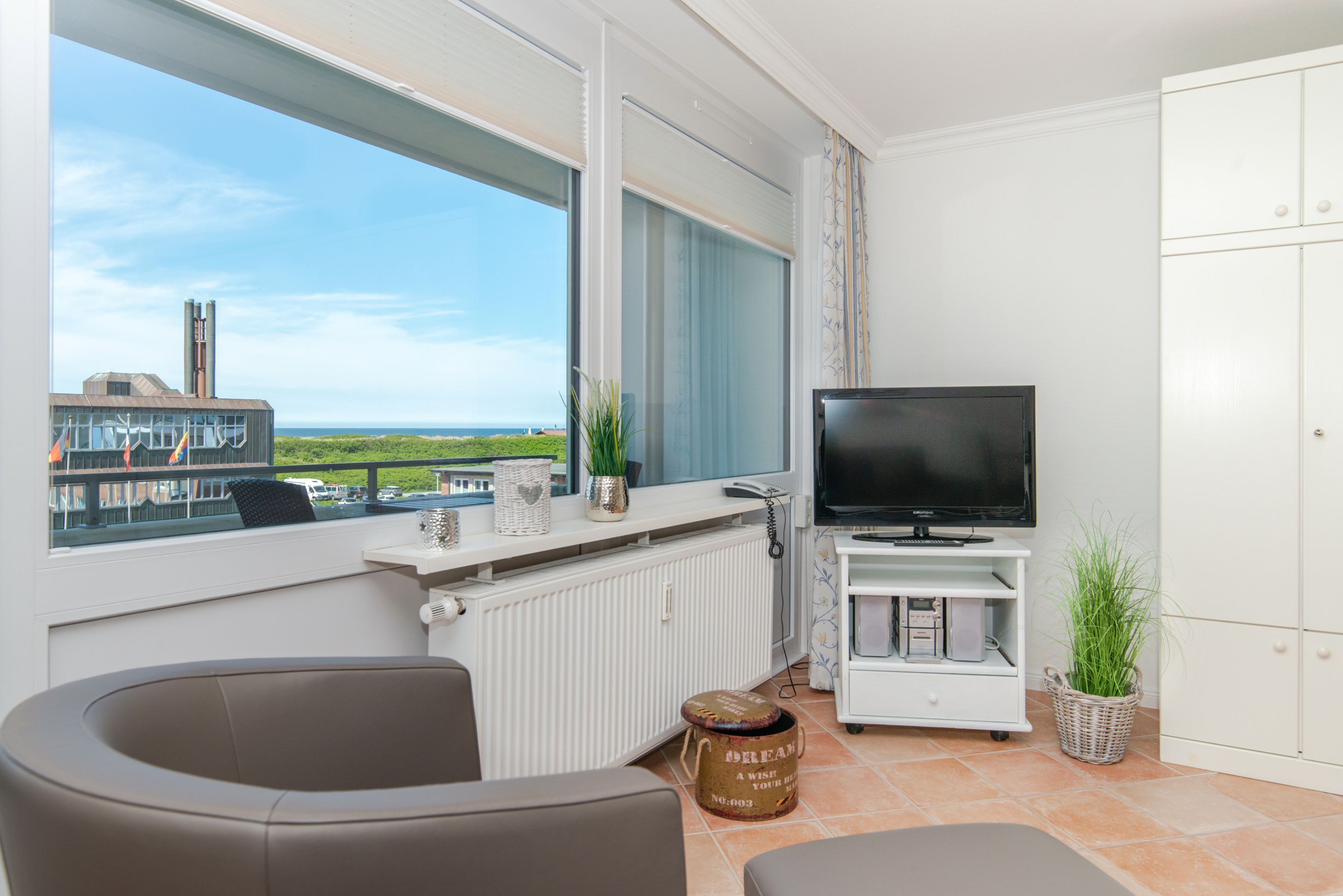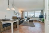 Geschmackvoll eingerichtete, komplett geflieste 1-Zimmer-Nichtraucher-Ferienwohnung (ca. 40 qm) in der 3. Etage mit Meerblick und Westloggia (Nachmittagssonne, mit Balkonmöbeln und Auflagen) für max. 2 Personen.