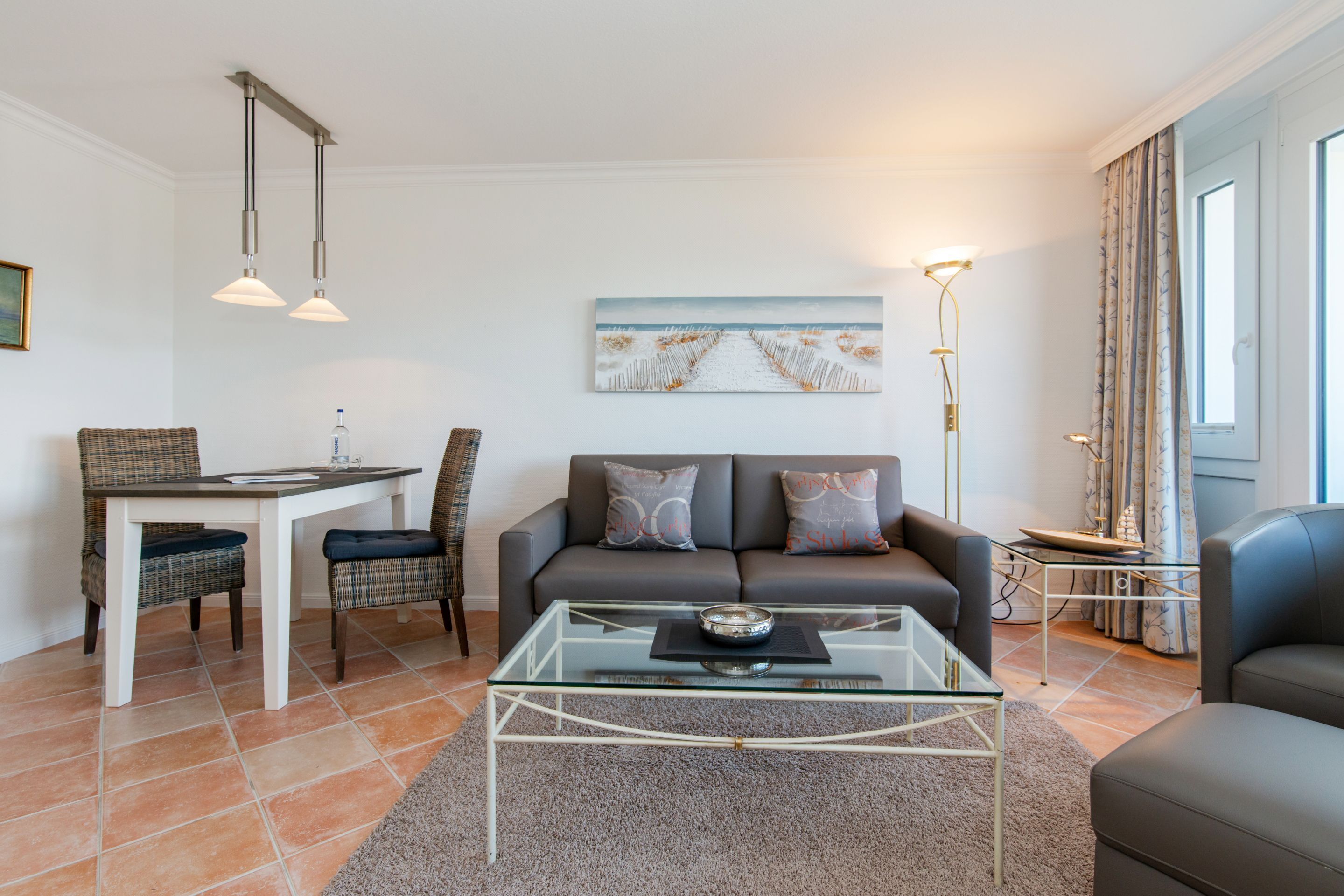 Der Wohn-/Schlafraum besteht aus einer hochwertigen Sitzgarnitur von Bielefelder Werkstätten (2-Sitzer-Couch und ein Fußhocker), Doppelschrankbetten (einzeln ausklappbar, Federkernmatratzen), einem Essplatz, einem großen Kabel-Flachbild-TV, Radio/CD-Player.