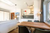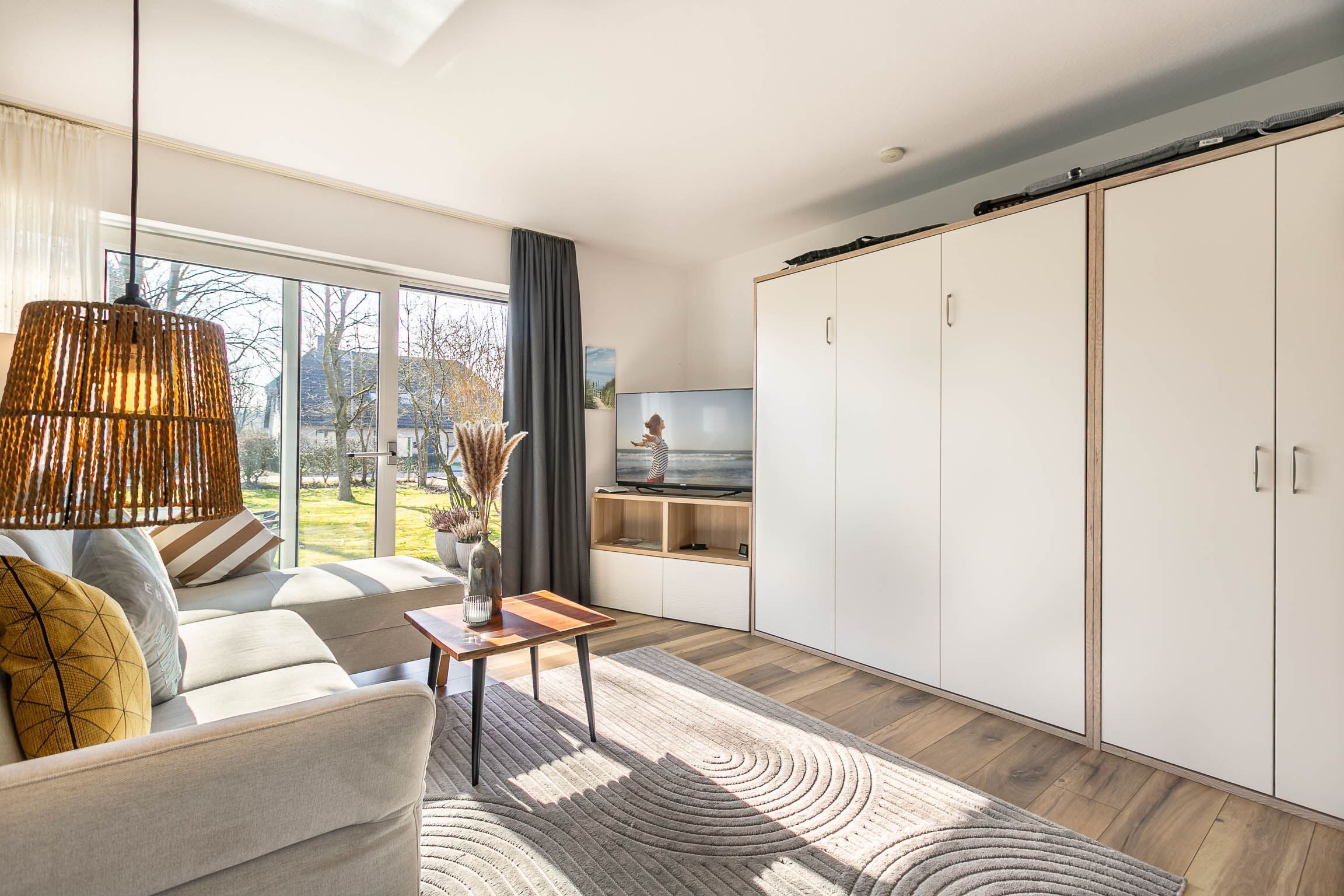 Wohnzimmer mit Schrank-Doppelbett (2x 80x200cm), großem Sofa mit Ottomane, SMART-TV (Kabel), Radio und Esstisch für 4 Personen. Direkter Zugang zur möblierten Gartenterrasse nach Süden. Offene Küche mit Backofen, Geschirrspüler und Kühlschrank mit Gefrierfach.