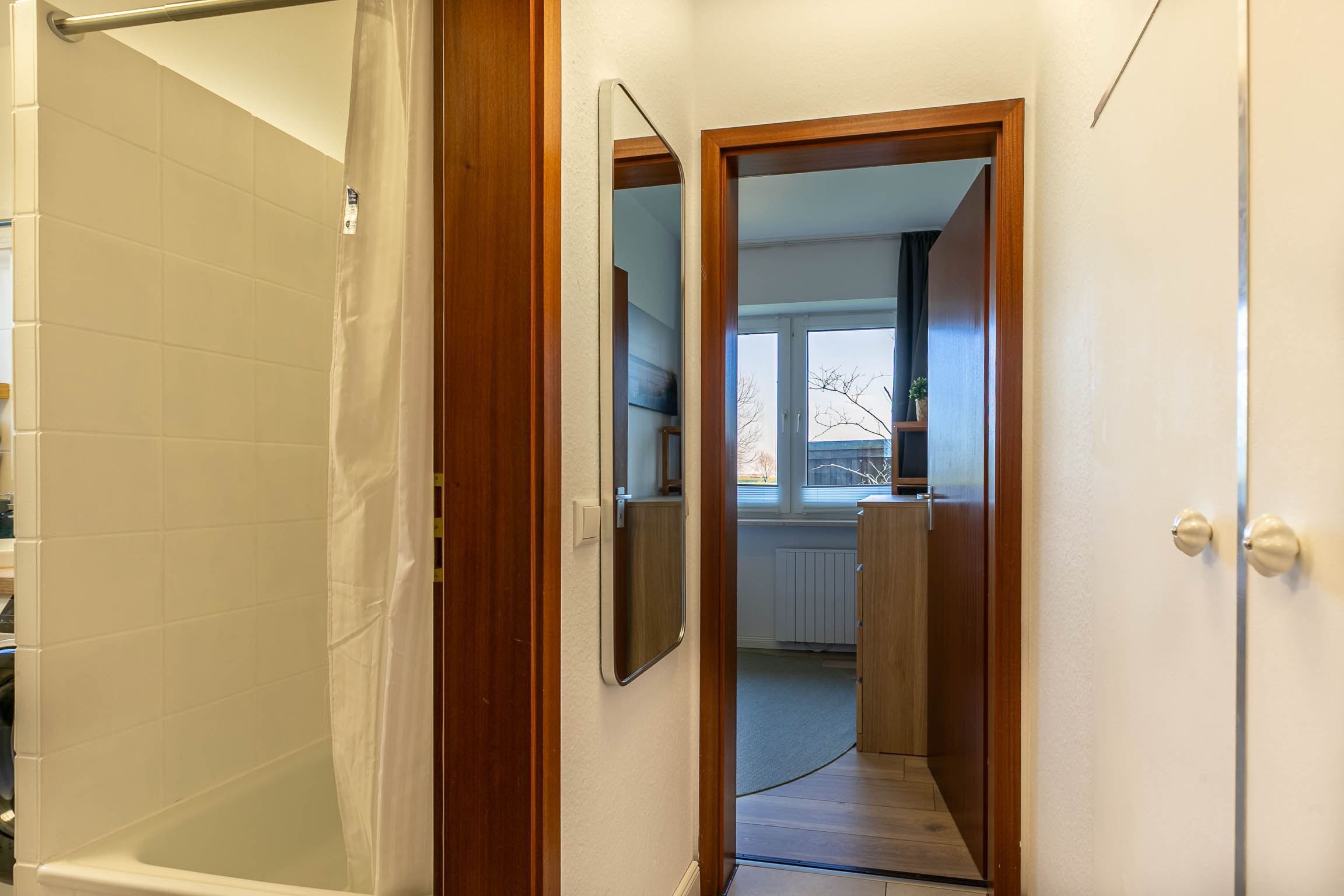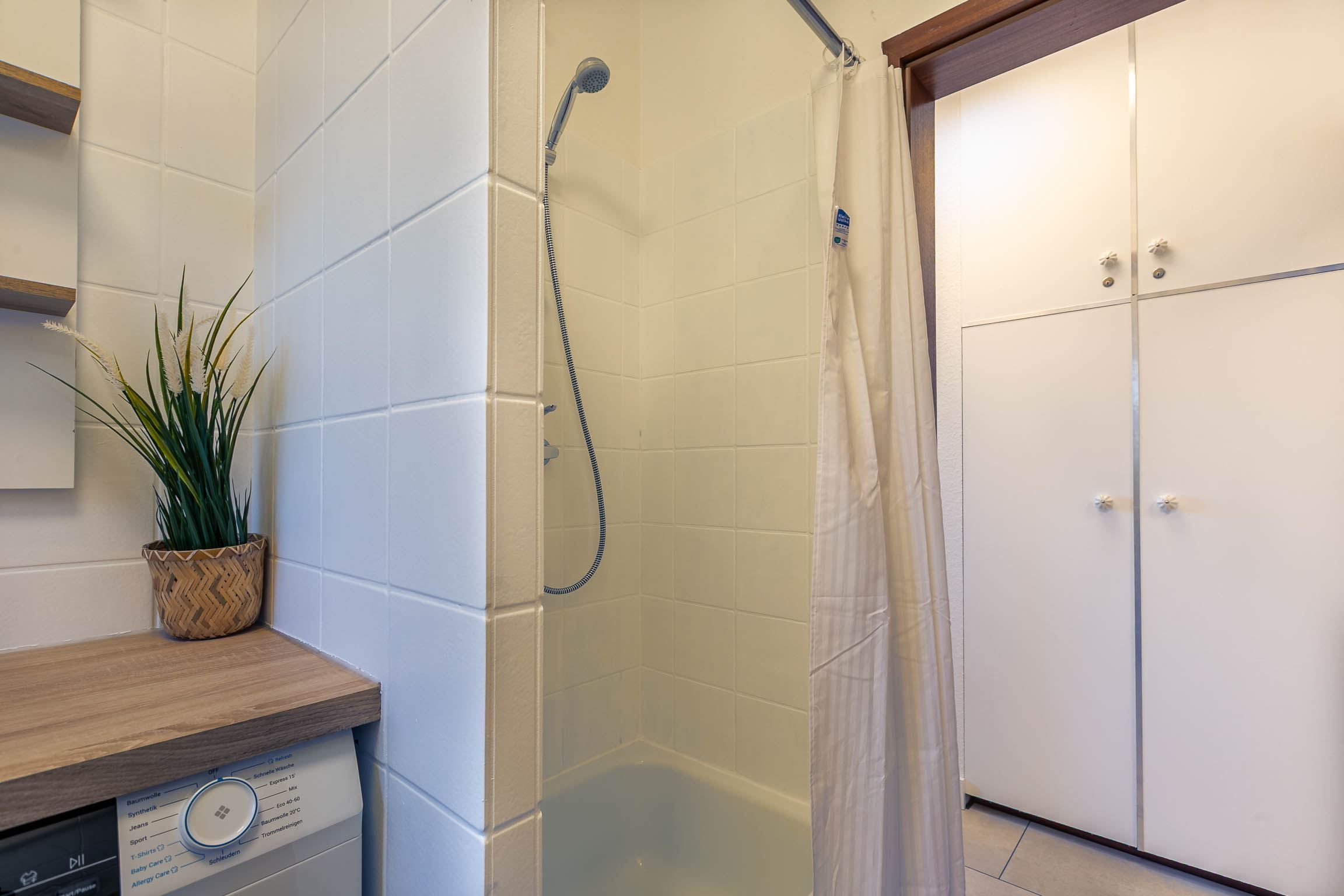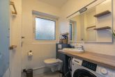 Badezimmer (Duschbad) mit Dusche (hoher Eintritt: ca. 45cm), WC, Waschmaschine, Föhn und Tageslicht.