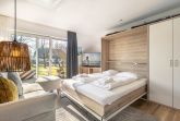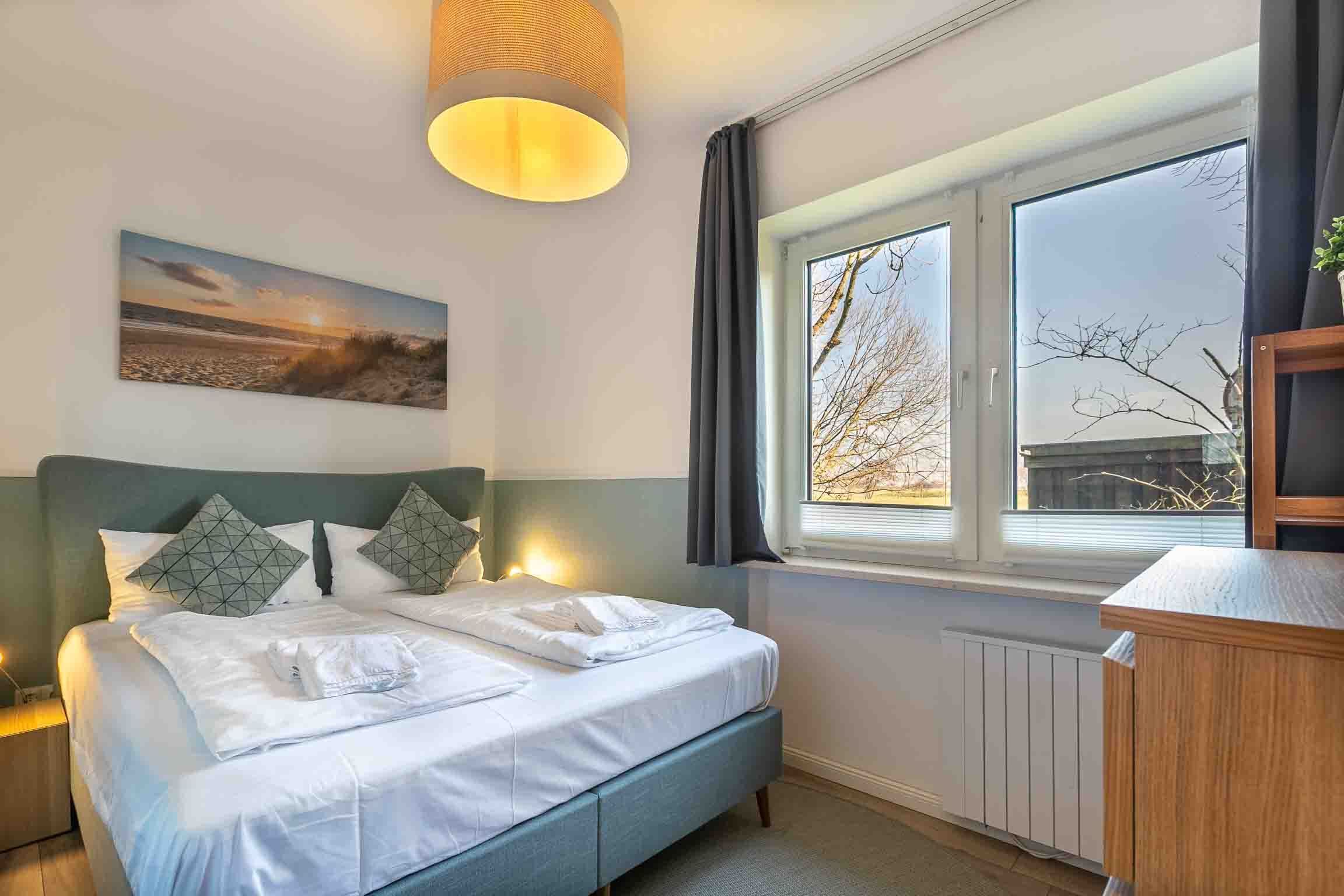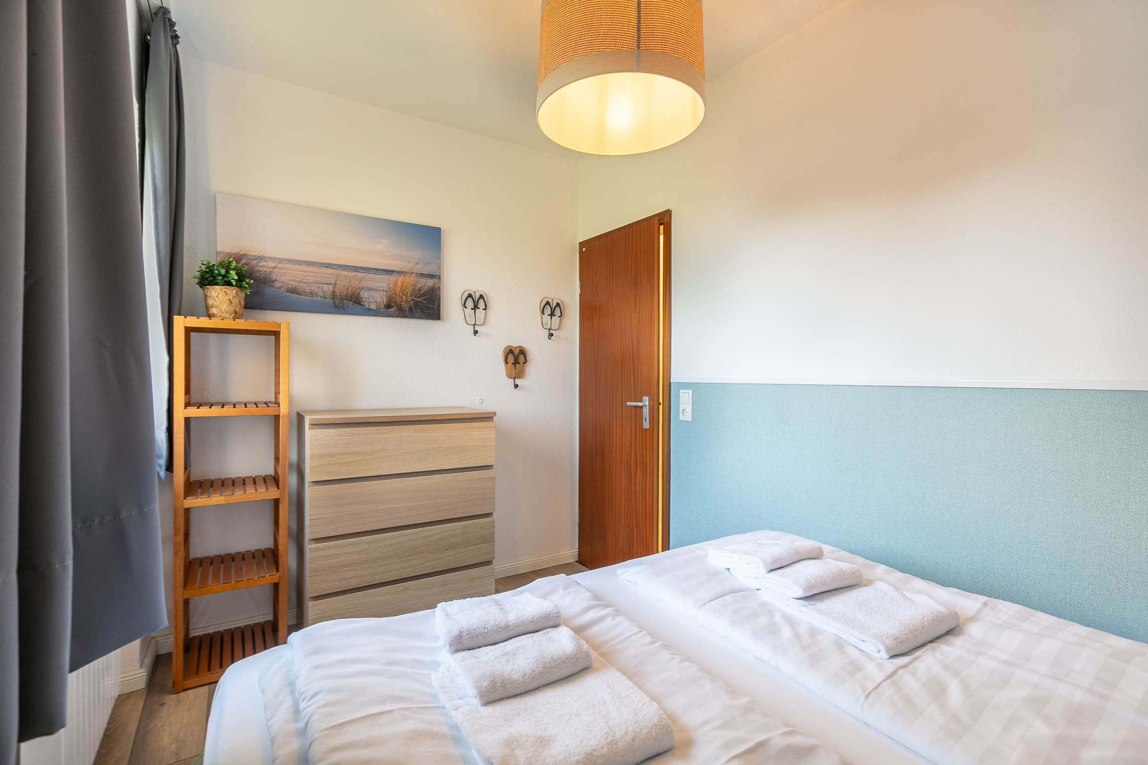 Schlafzimmer mit Doppelbett (160x200cm, Boxspring) und Kommode.
