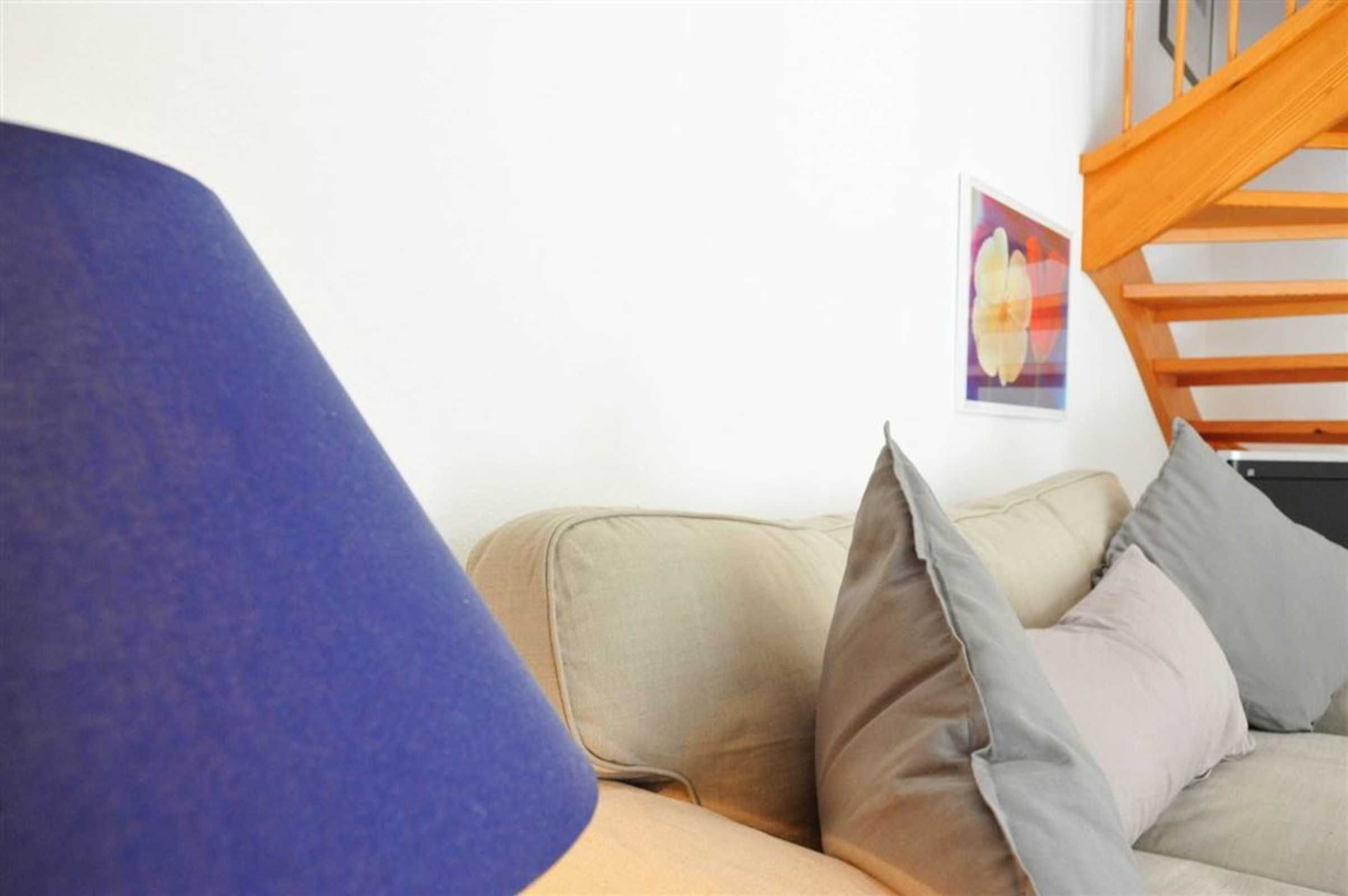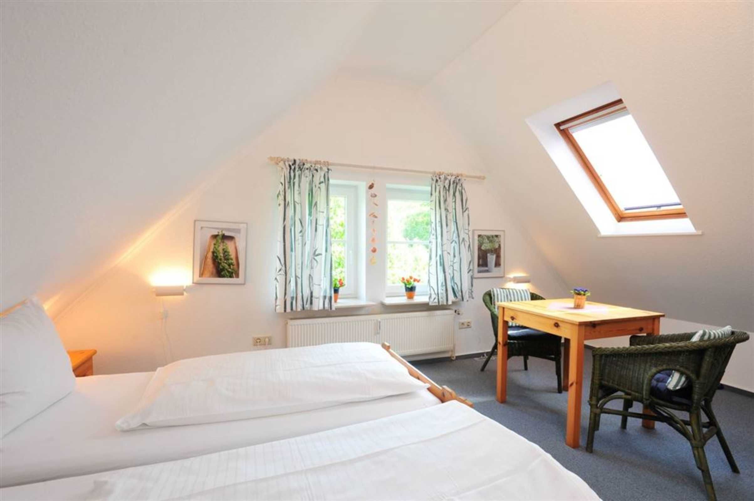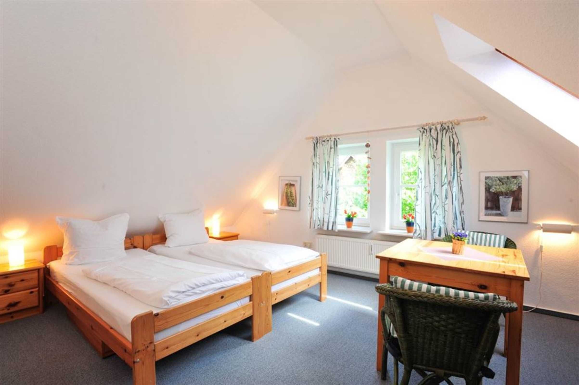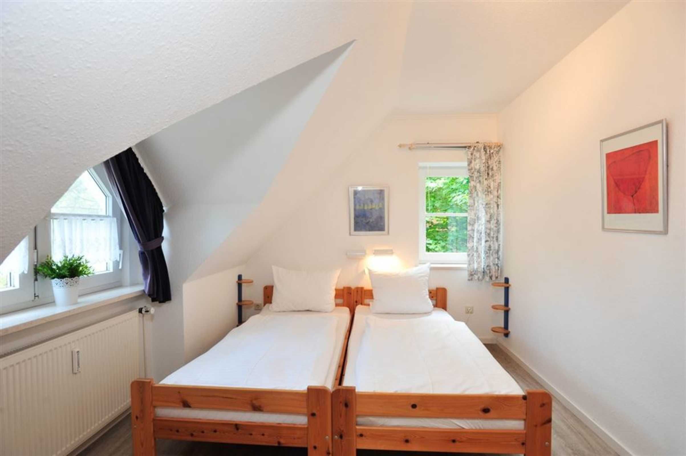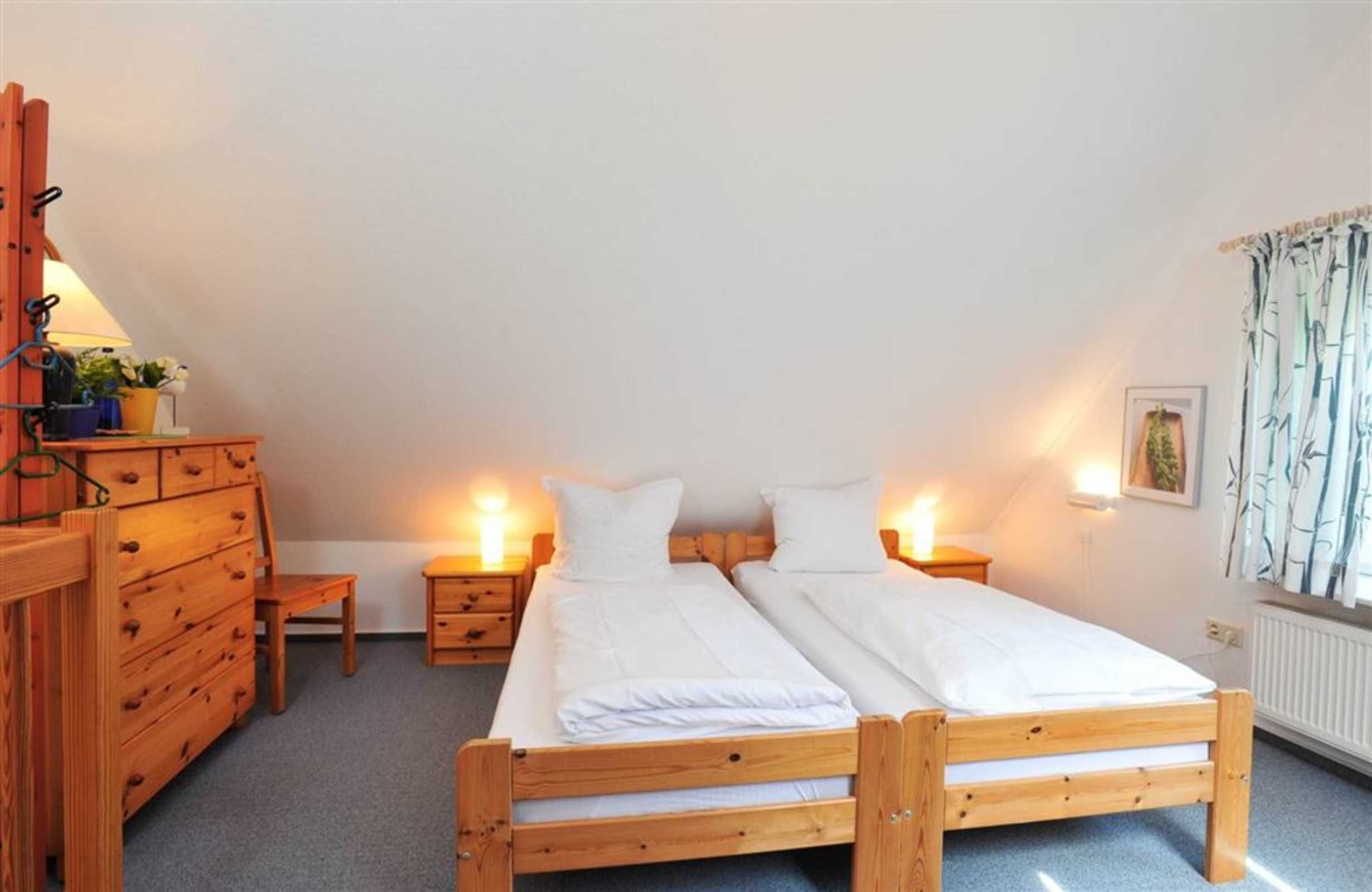 2. Schlafzimmer (halboffen) mit 2 Einzelbetten (je 90x200cm), Kommode, Tisch, 2 Sesseln und Stuhl. Zugang über eine steile Wendeltreppe vom Wohnzimmer.