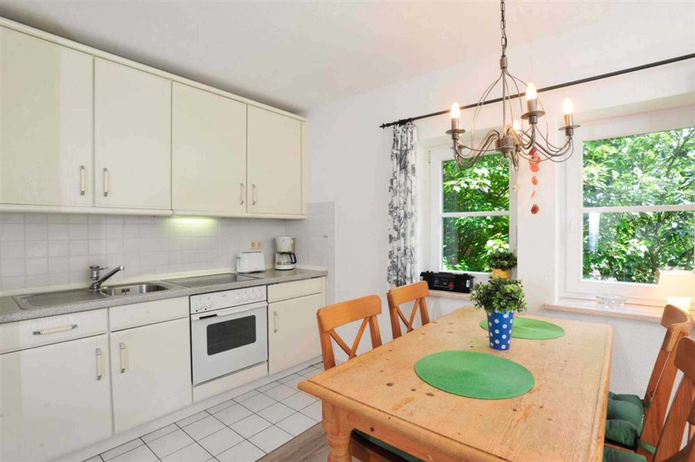 Sonniges Wohnzimmer mit Sofa (2er), 3 Sesseln, TV (Kabel) und Esstisch mit 4 Stühlen. Direkter Zugang zum möblierten Balkon nach Süden mit Waldblick. Offene Küche mit Backofen, Kühlschrank mit Gefrierfach und einigem Komfort.