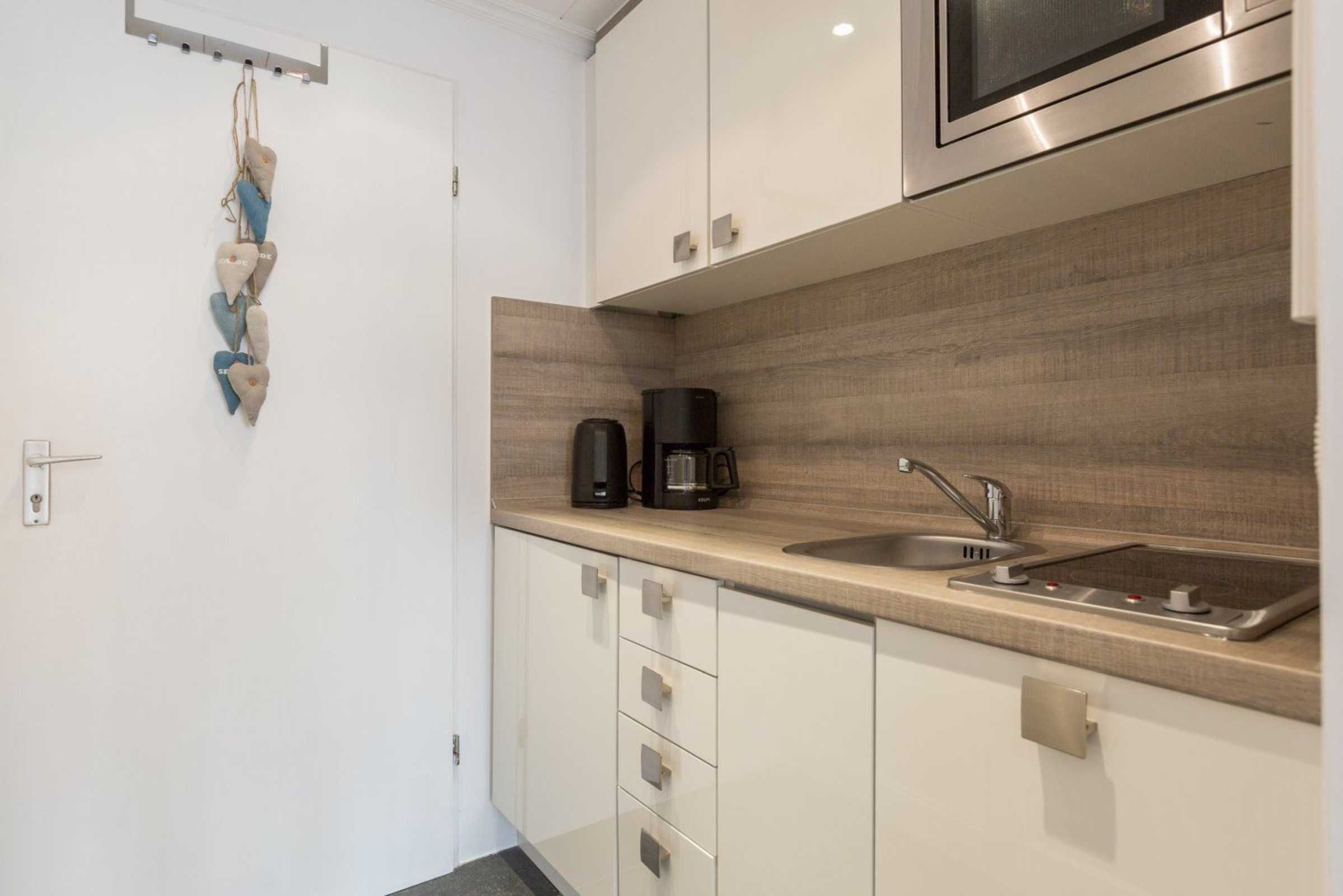 Separate Küche im Eingangsbereich mit Ceran-Herd mit 2 Kochstellen, Mikrowelle, Geschirrspüler und Kühlschrank (kein Gefrierfach).