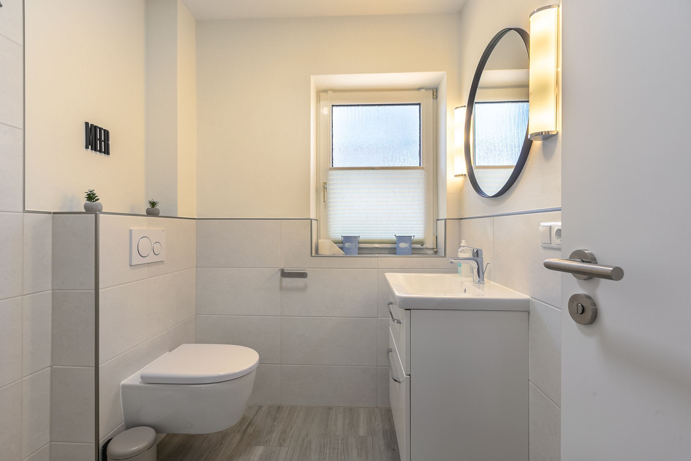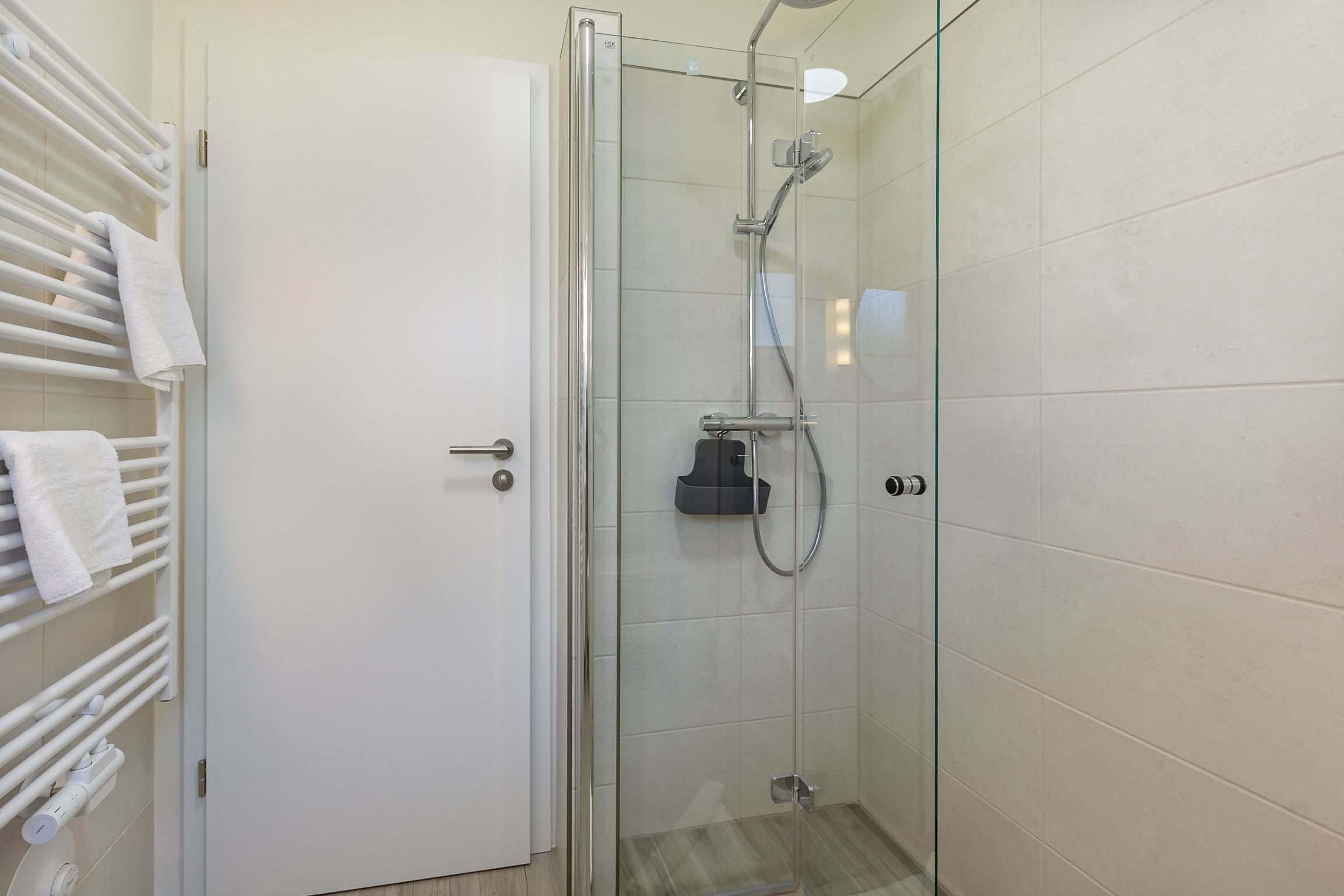 Badezimmer (Duschbad) mit bodengleicher (Regen-) Dusche, WC, Tageslicht und Föhn.