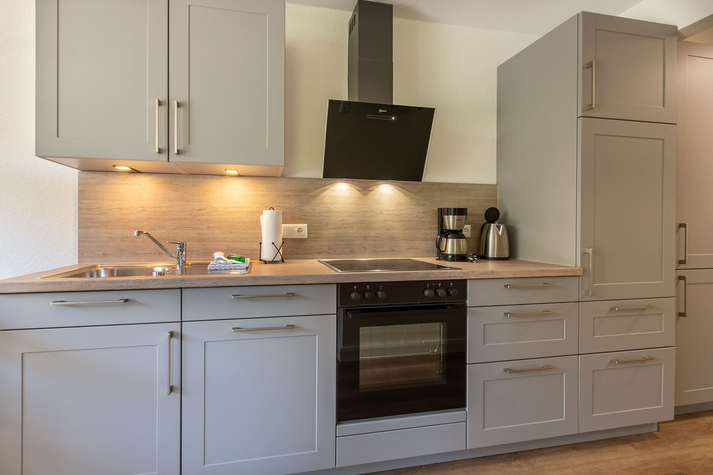 Helles Wohnzimmer mit großem Ecksofa (bis zu 4 Personen), Korbsessel, SMART-TV (Kabel) und Esstisch mit 4 Stühlen. Direkter Zugang zur möblierten Terrasse nach Osten. Offene Küche mit Backofen, Geschirrspüler und Kühlschrank mit Gefrierfach.