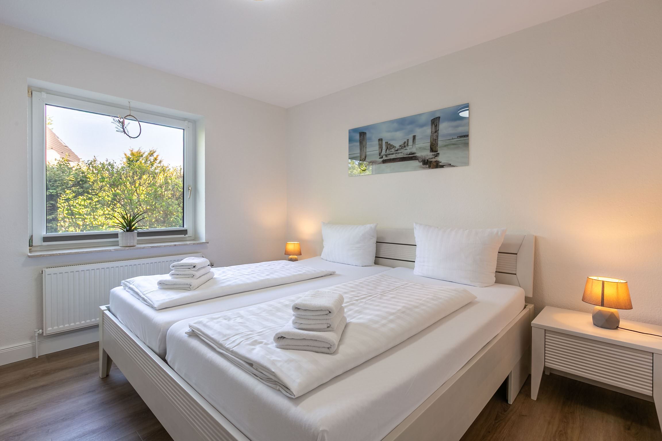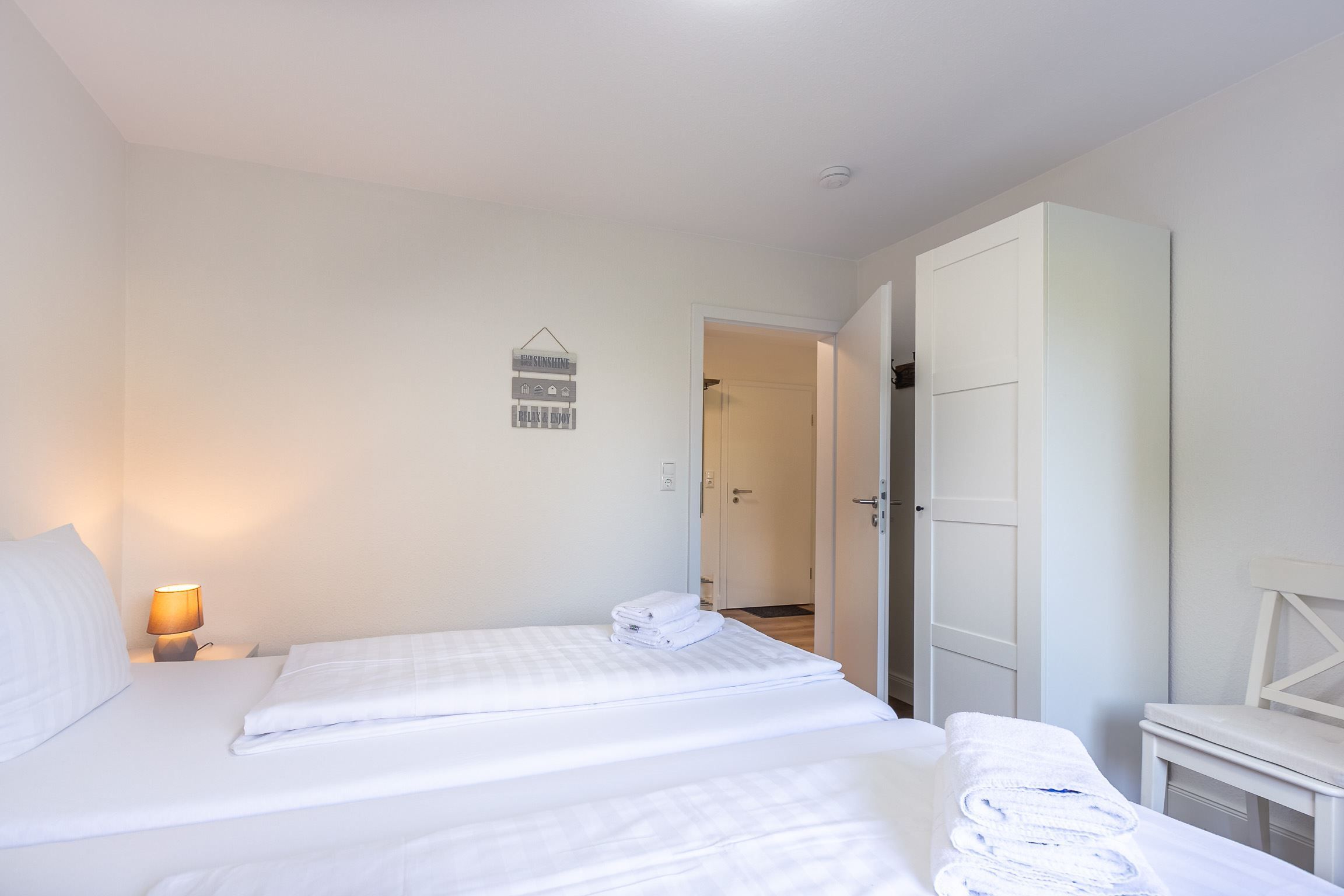 1. Schlafzimmer mit Doppelbett (2x 95x200cm), Kleiderschrank, Stuhl und Spiegel.
