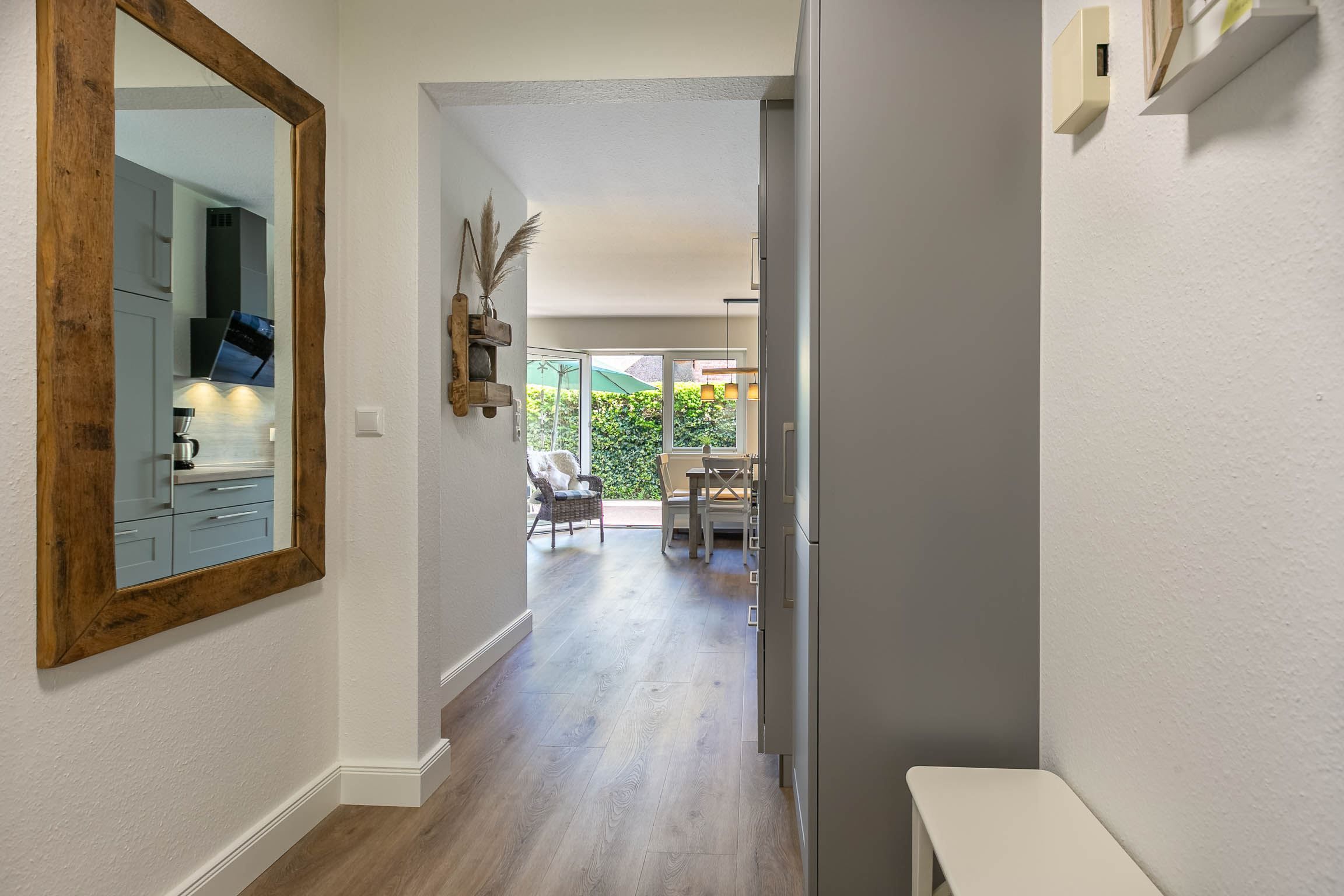 Flur mit Schuhablage, Spiegel und Garderobenschrank mit Staubsauger im Eingangsbereich.