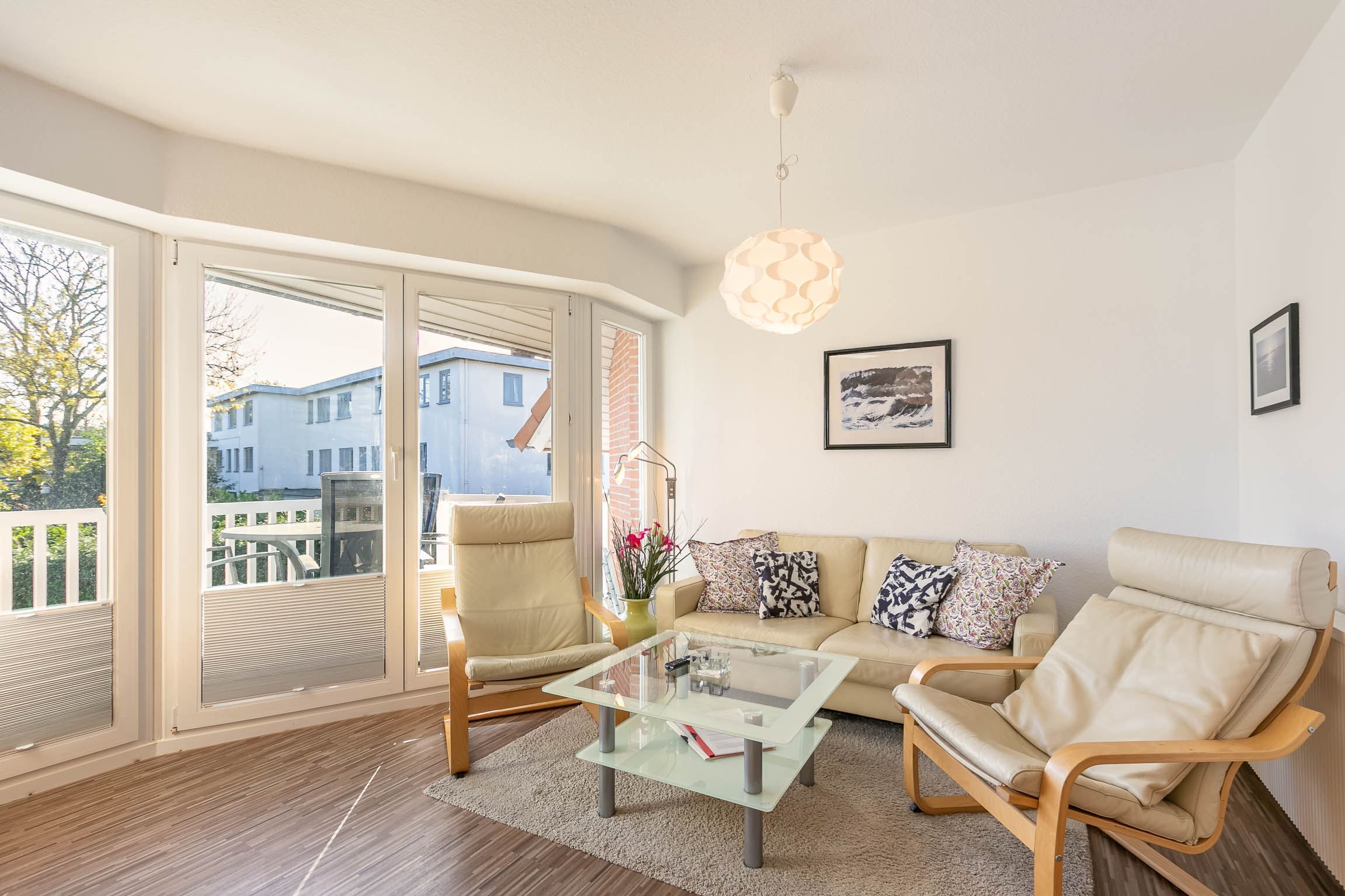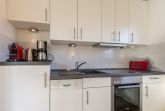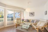 Wohn- und Schlafzimmer mit Sofa, 2 Sesseln, SMART-TV (Kabel), DVD-Player und Esstisch mit 4 Stühlen. Direkter Zugang zum möblierten Balkon nach Süd-Osten. Offene Küche mit Backofen, Mikrowelle, Kühlschrank mit Gefrierfach und Geschirrspüler.