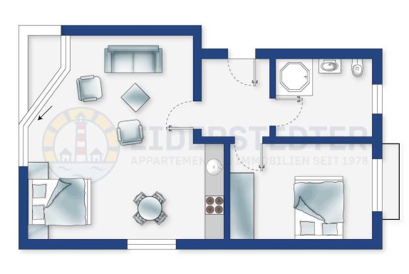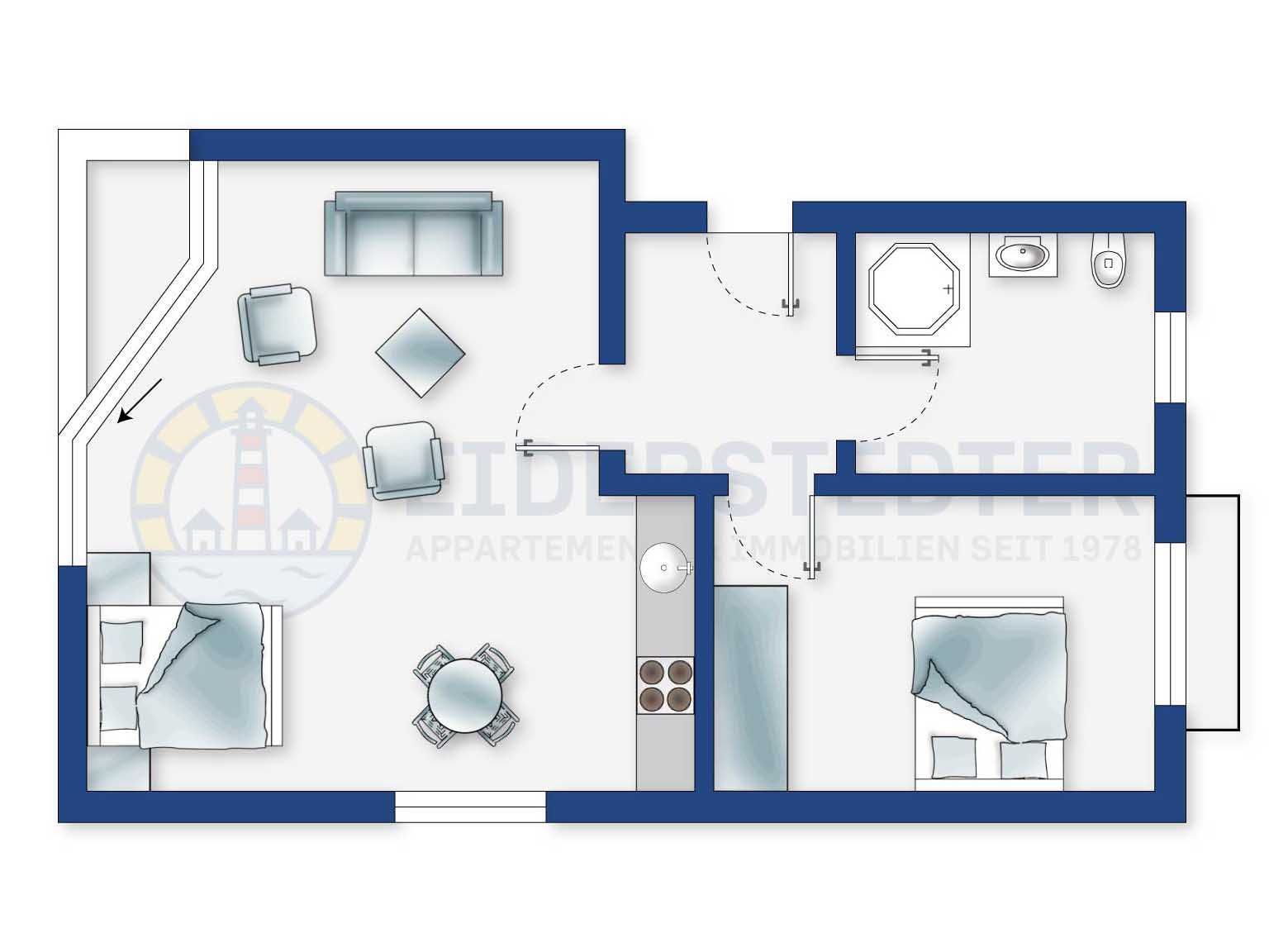 Geschmackvoll eingerichtete 2-Zimmer-Ferienwohnung Duckdalben mit 42 m² auf 1 Ebene (OG) für bis zu 4 Personen. In guter und ruhiger Lage im Ortsteil Ording in St. Peter-Ording. Der schöne Ordinger Wald mit Auslaufmöglichkeiten für Hunde befindet sich direkt vor der Haustür.