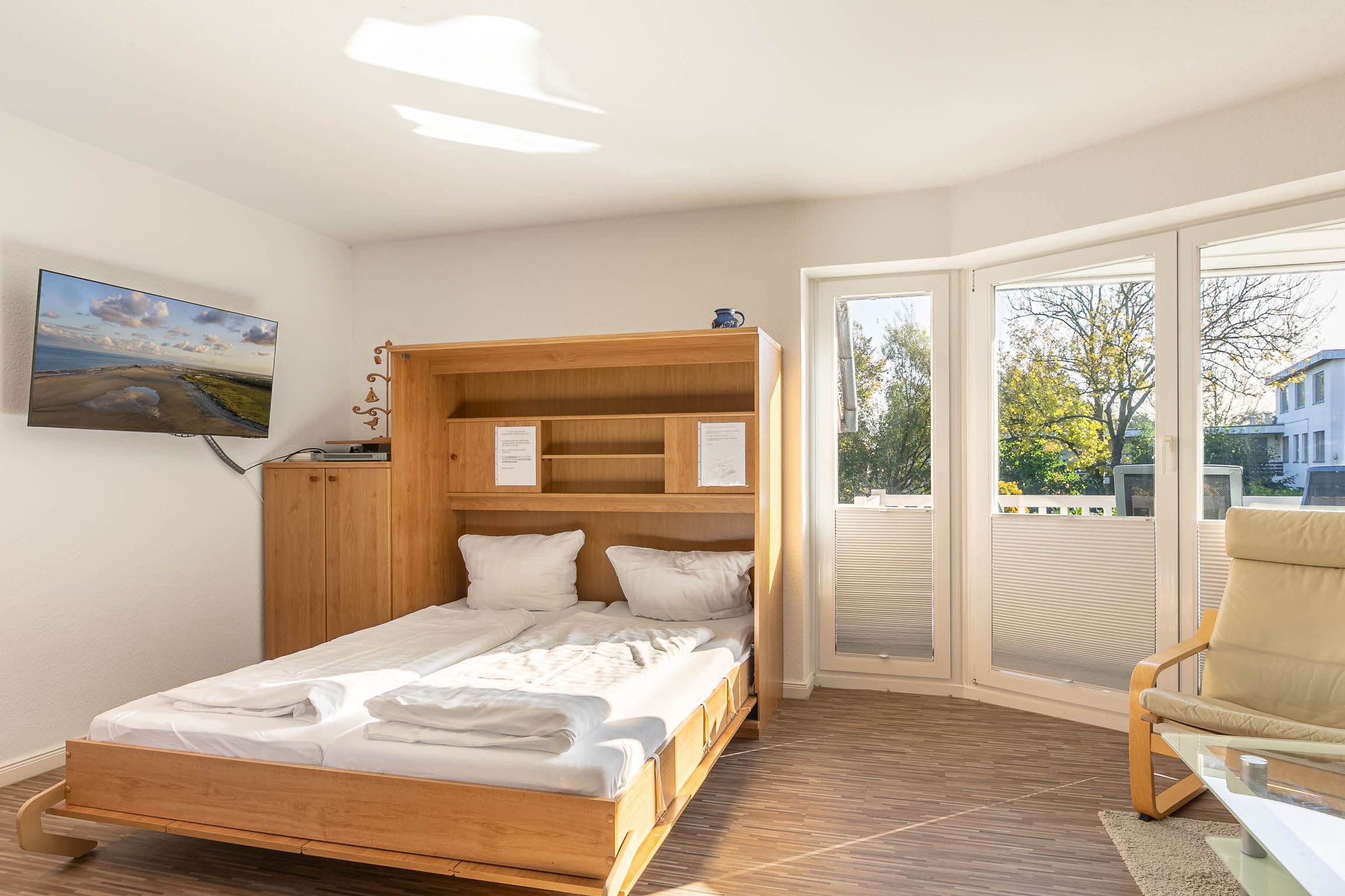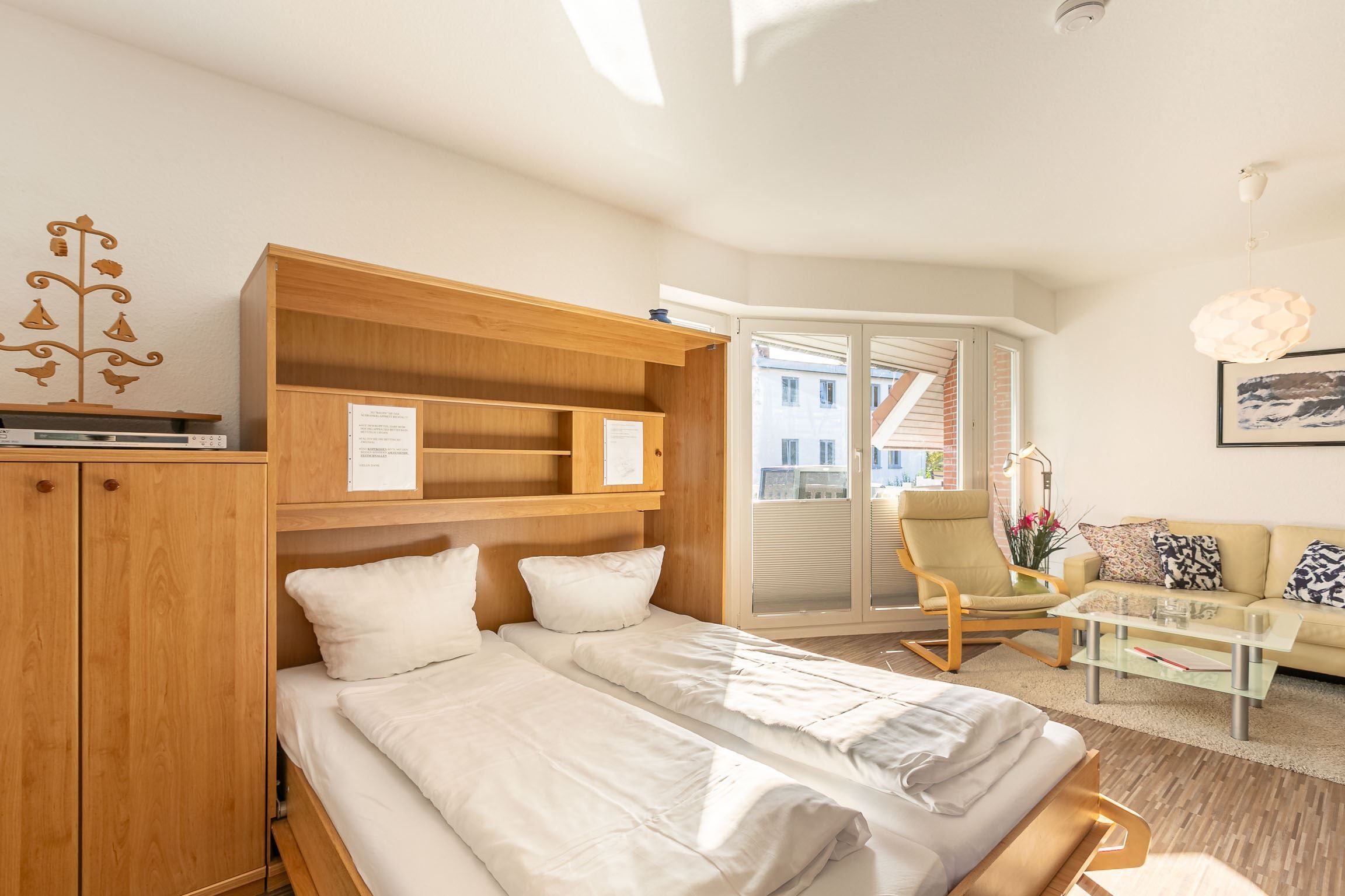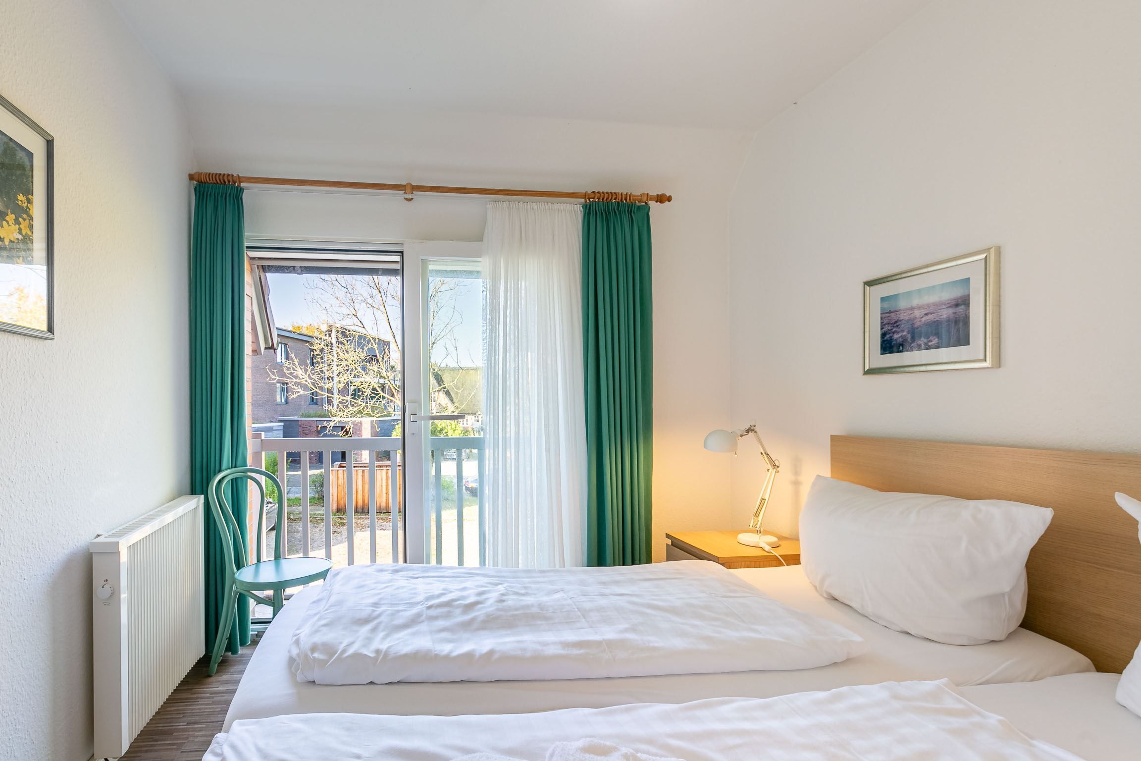 Schlafzimmer mit Doppelbett (2x 80x200cm), Kleiderschrank, Stuhl und französischem Balkon nach Westen.