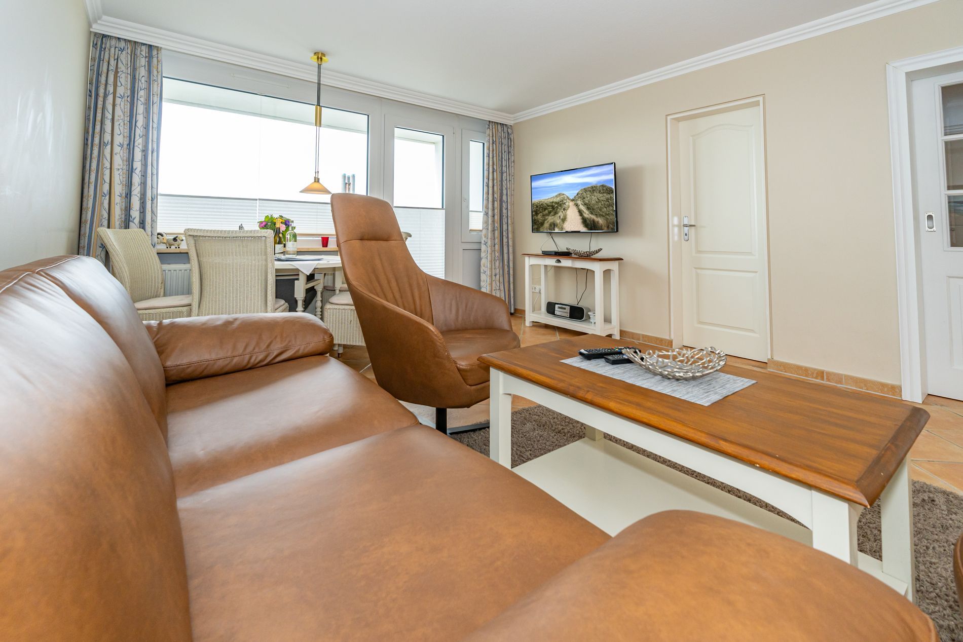 Der Wohnraum besteht aus einer gemütlichen Sitzgarnitur (2-Sitzer-Ledercouch, 2 Sessel), Essplatz, großer Kabel-Flachbild-TV, Radio/CD-Player.