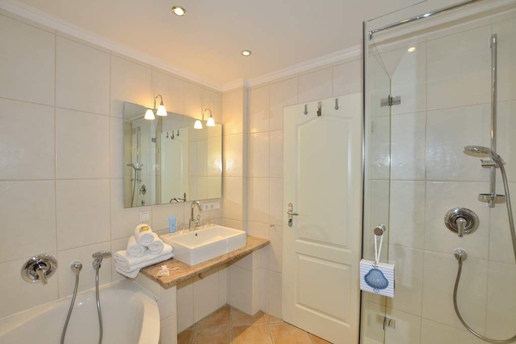 Im modernen, großzügigen Bad befinden sich eine Dusche, eine Eckbadewanne, ein WC, ein Waschtisch, ein Handtuchtrockner und Fön.