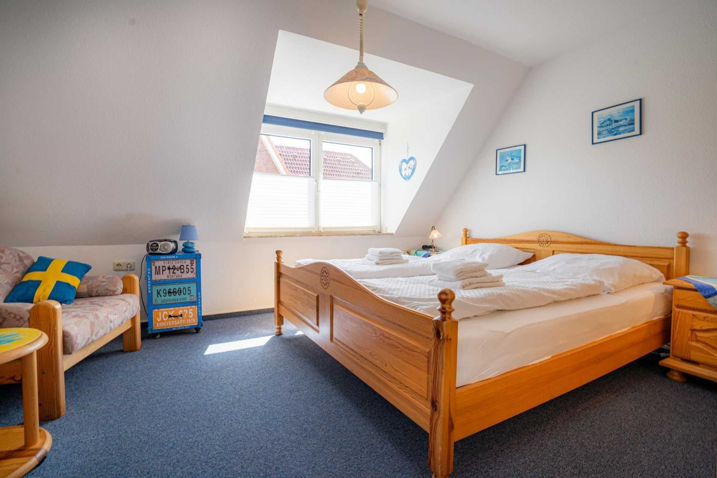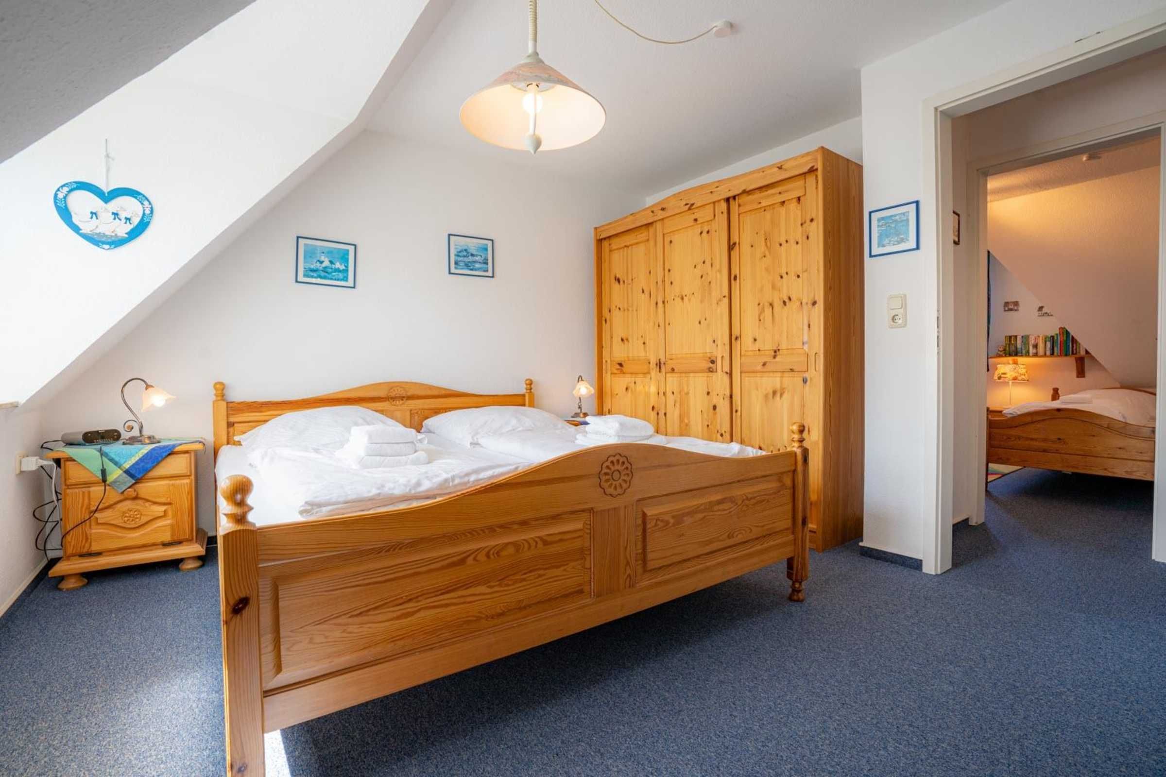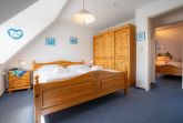 1. Schlafzimmer mit Doppelbett (2x 90 x 200cm), großem Kleiderschrank, Sessel und Bücherregal.