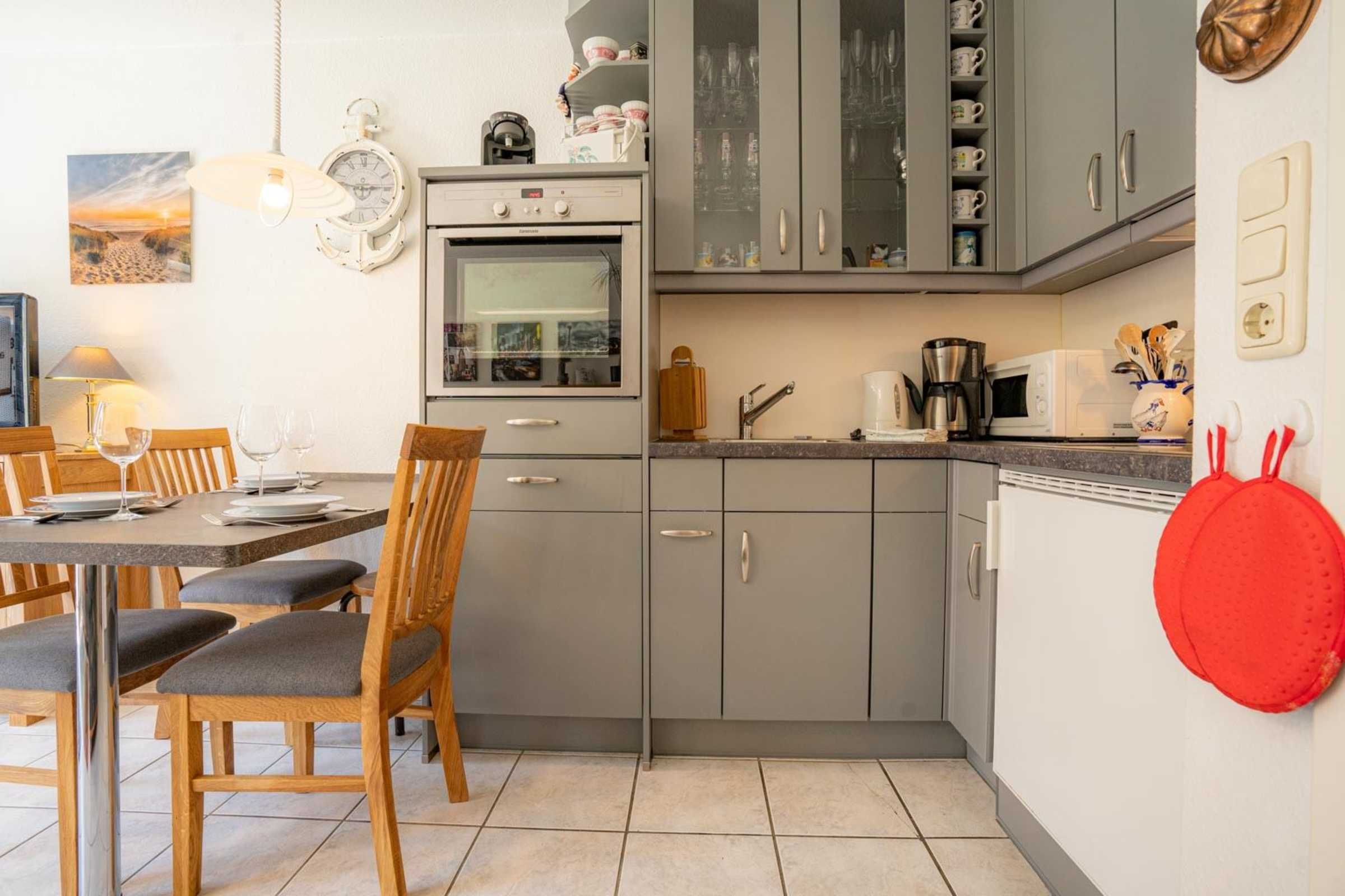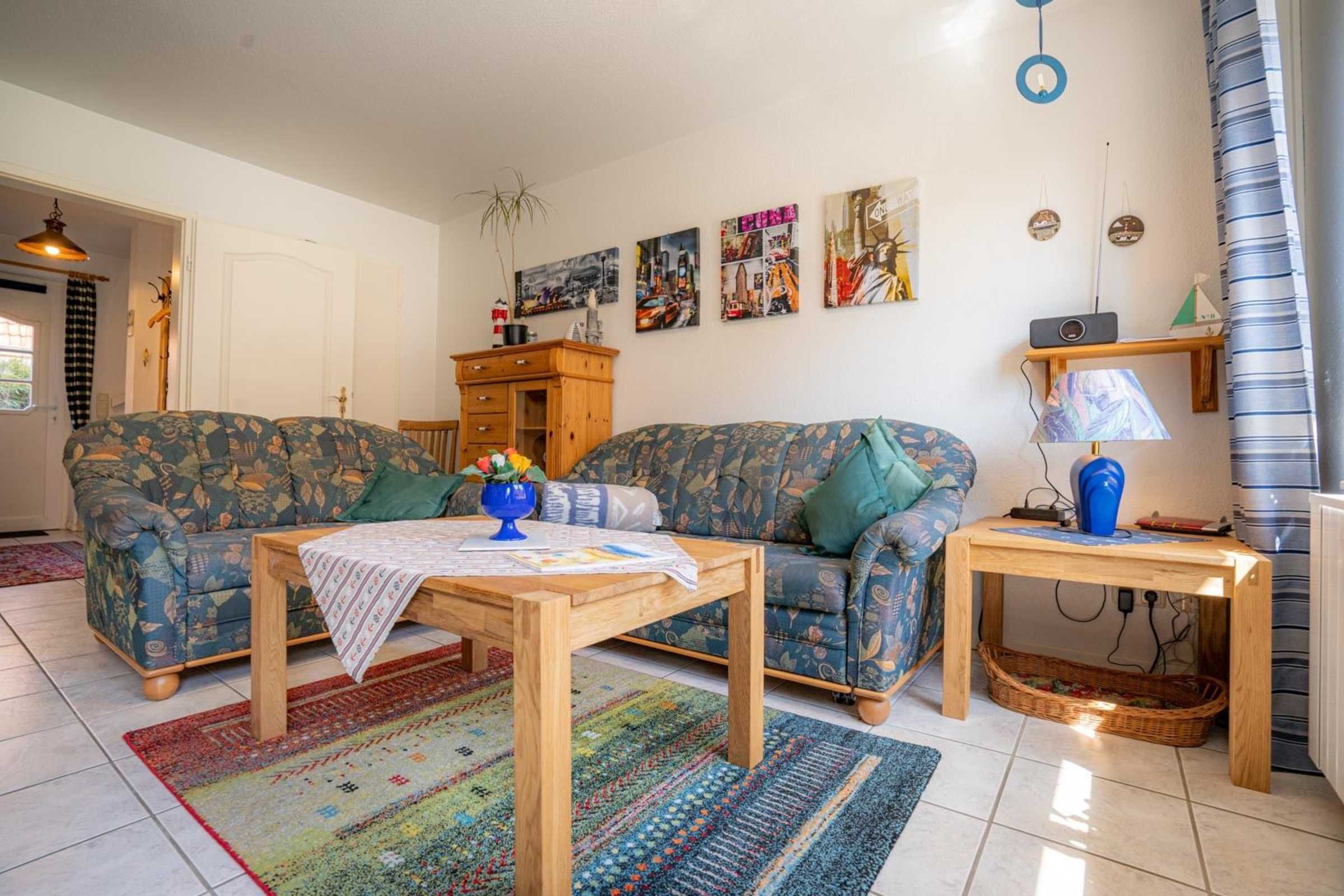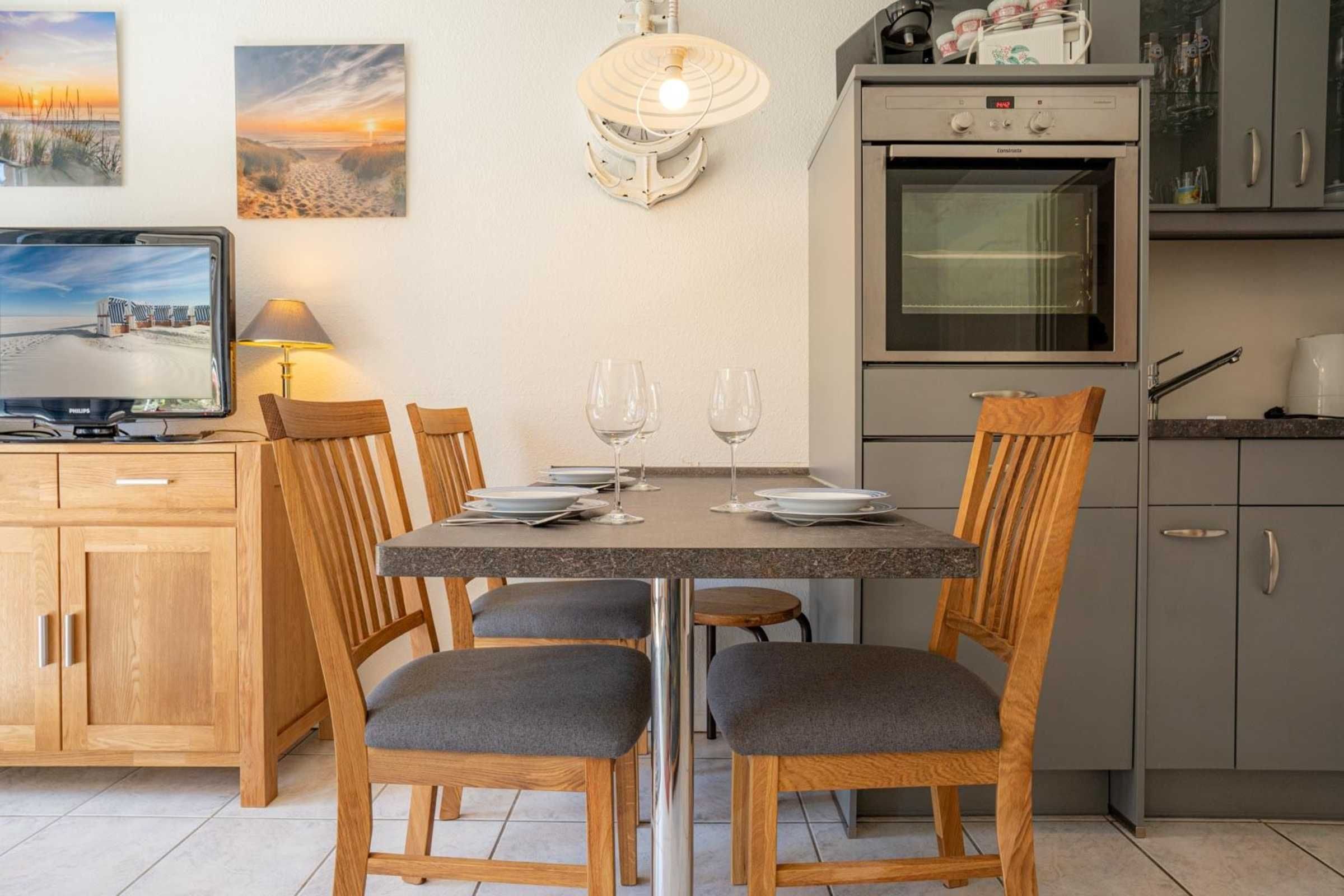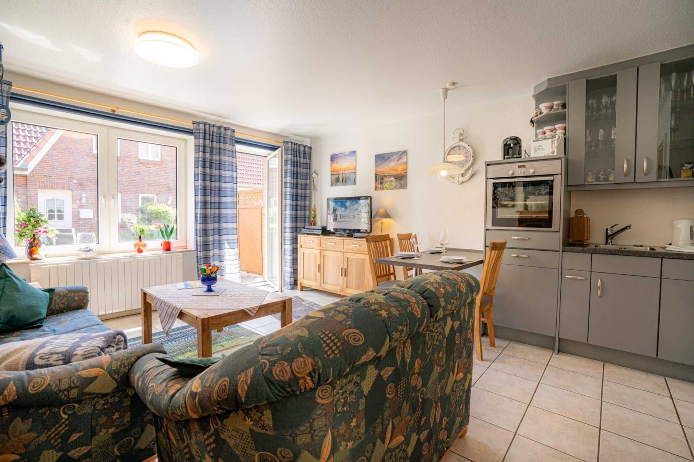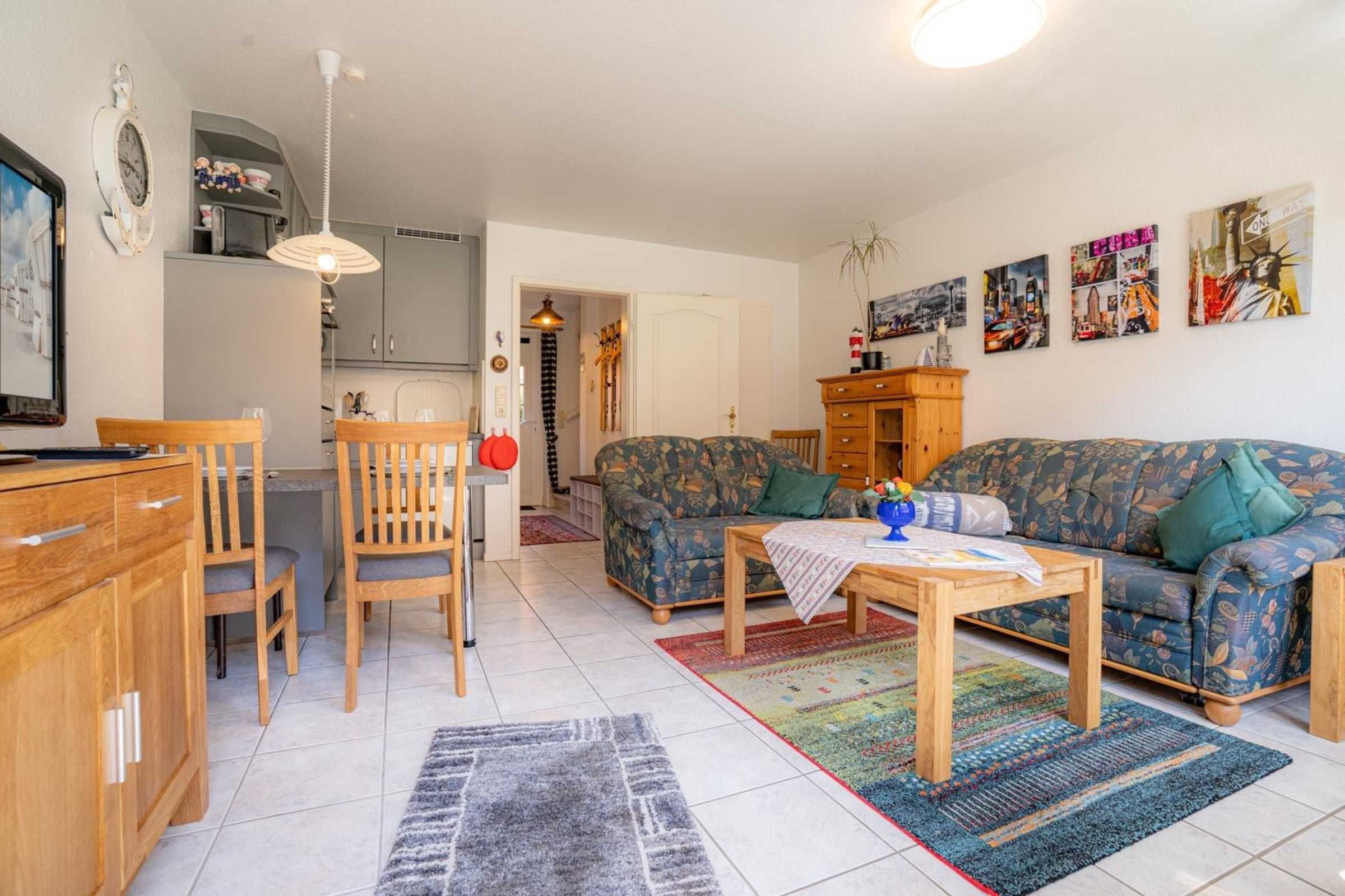 Wohnzimmer mit 2 Sofas (2er, 3er), TV (Kabel), Bluetooth-Soundsystem mit CD-Player und Esstisch für 4 Personen. Offene Küche zum Wohnzimmer mit Backofen, Mikrowelle, Geschirrspüler und Kühlschrank mit Eisfach. Direkter Zugang zur möblierten Süd-Terrasse mit Markise (Handkurbel).